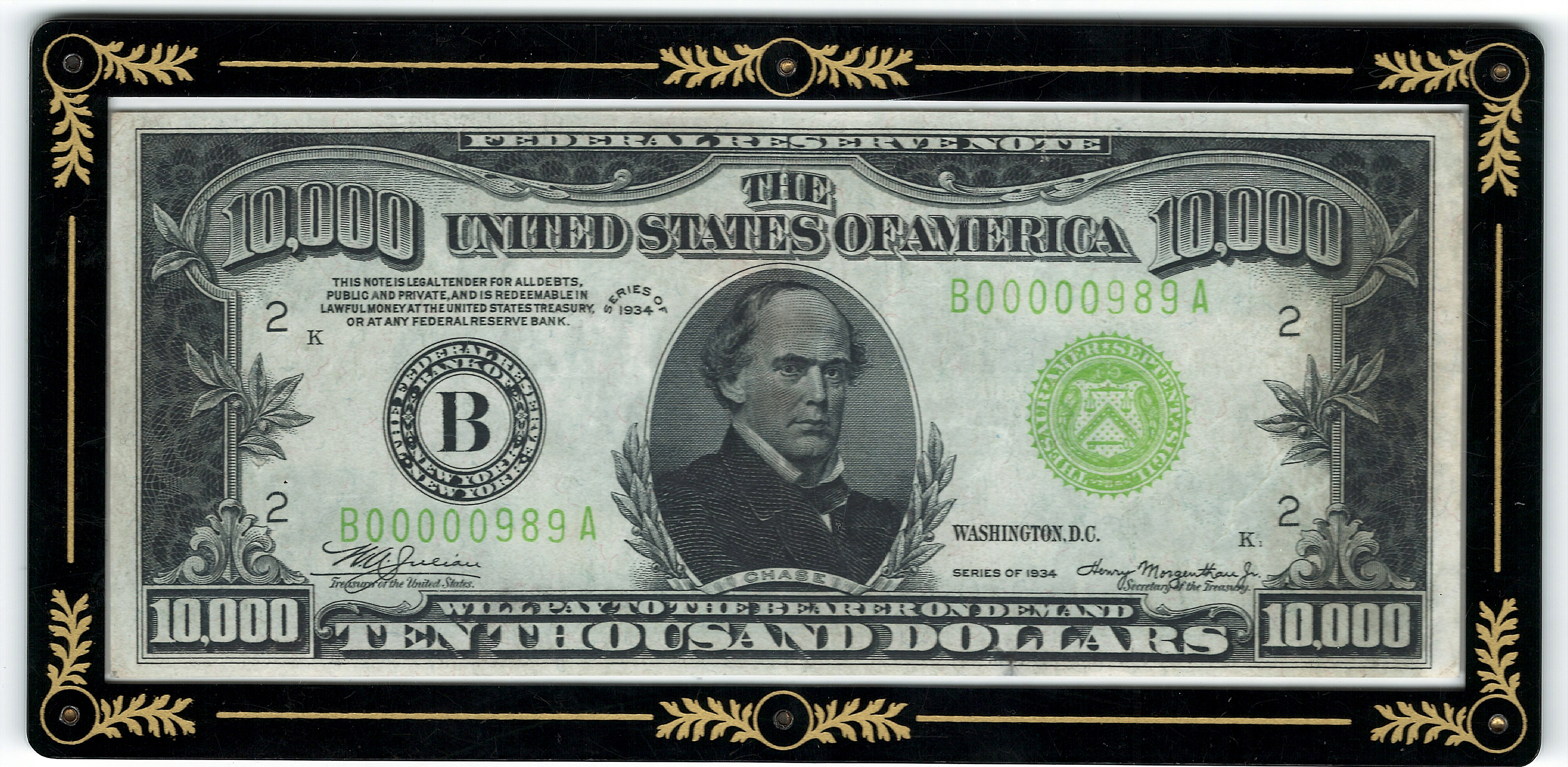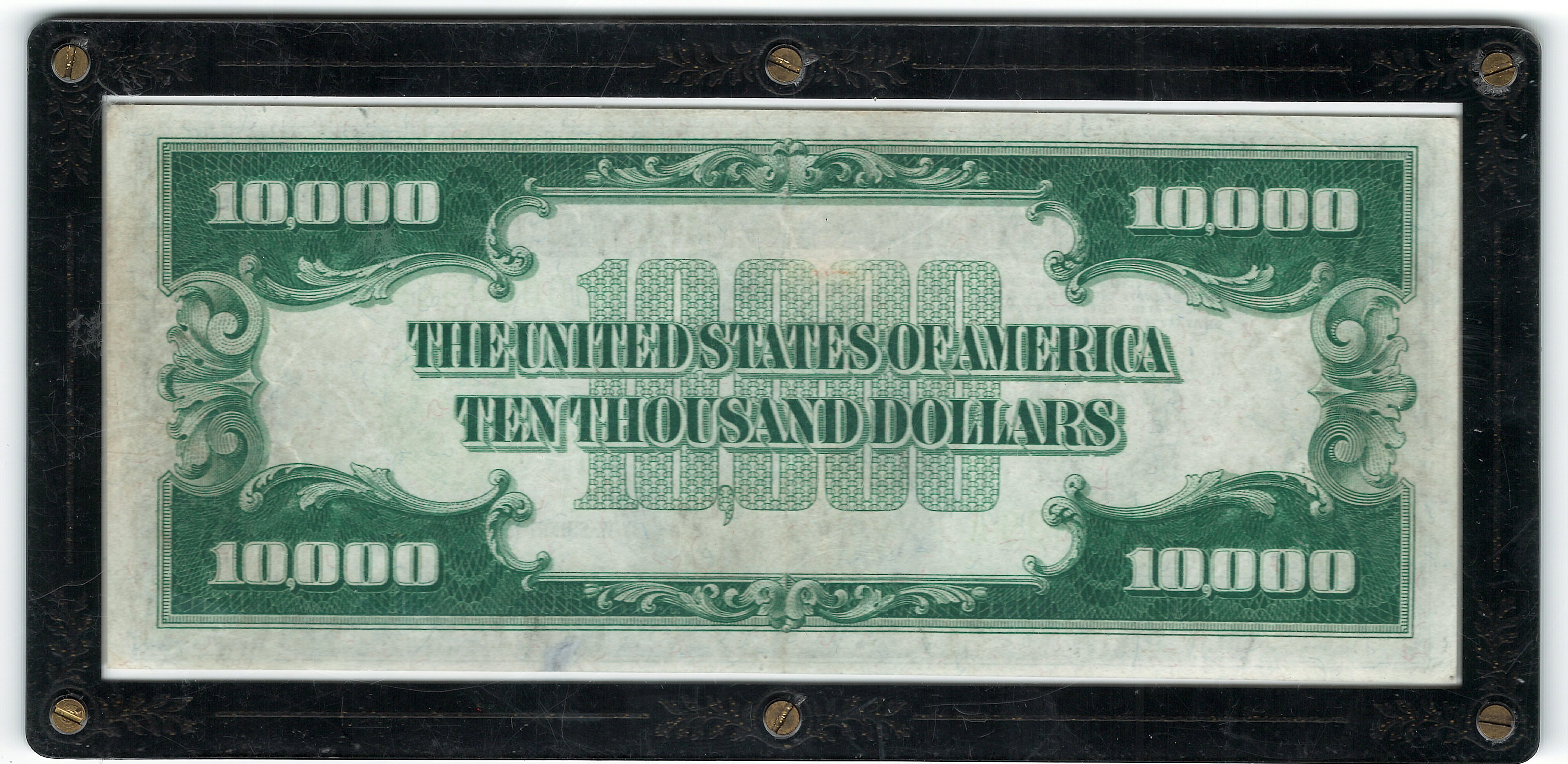 This 1934 $10,000 bill is interesting as it is one of only three $10,000 bills from the New York District that is NOT a Binion Note. There are 103 1934 $10,000 bills known from the New York district and 100 of them were from the famous Binion Hoard that was on display in the Binion Horseshoe Hotel and Casino in Las Vegas from 1954 to 1999.