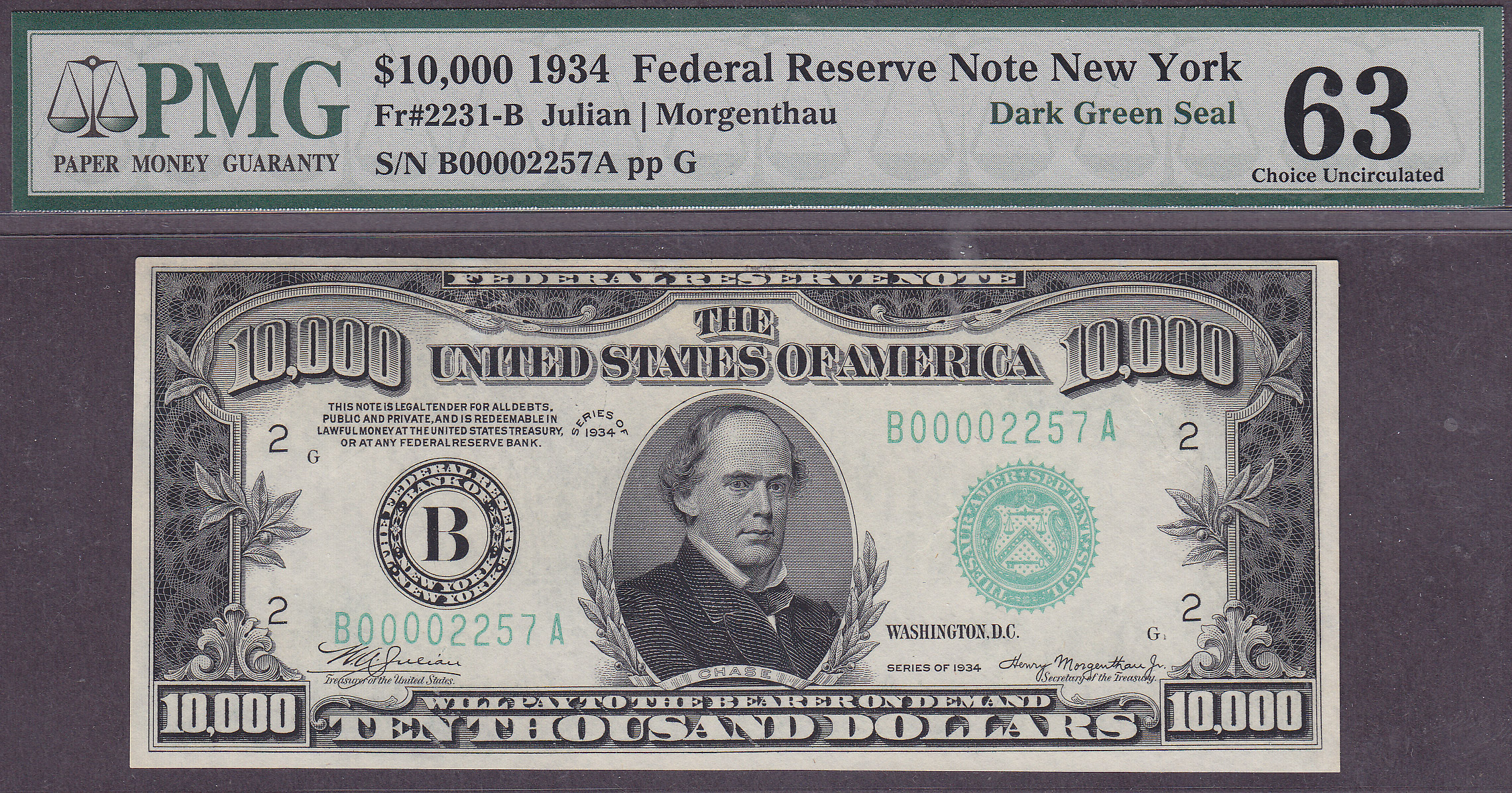 This is a rare and beautiful original 1934 $10,000 bill that hails from the Famous second Binion Hoard of 100 $10,000 bills that was displayed from 1966 to 1999 at the entrance of the Binion Hotel and Casino in Las Vegas, Nevada. The 100 $10,000 bills on display were from the New York district only and were displayed in the famous Inverted Horseshoe located at the entrance of the Binion Hotel and Casino in Las Vegas Nevada. This famous display was Las Vegas’ most celebrated attraction for many years attracting over 3 million visitors annually. People from all over the world came to have their picture taken in front of the display. Charles Manson was one of the ones who had his picture taken with the display.