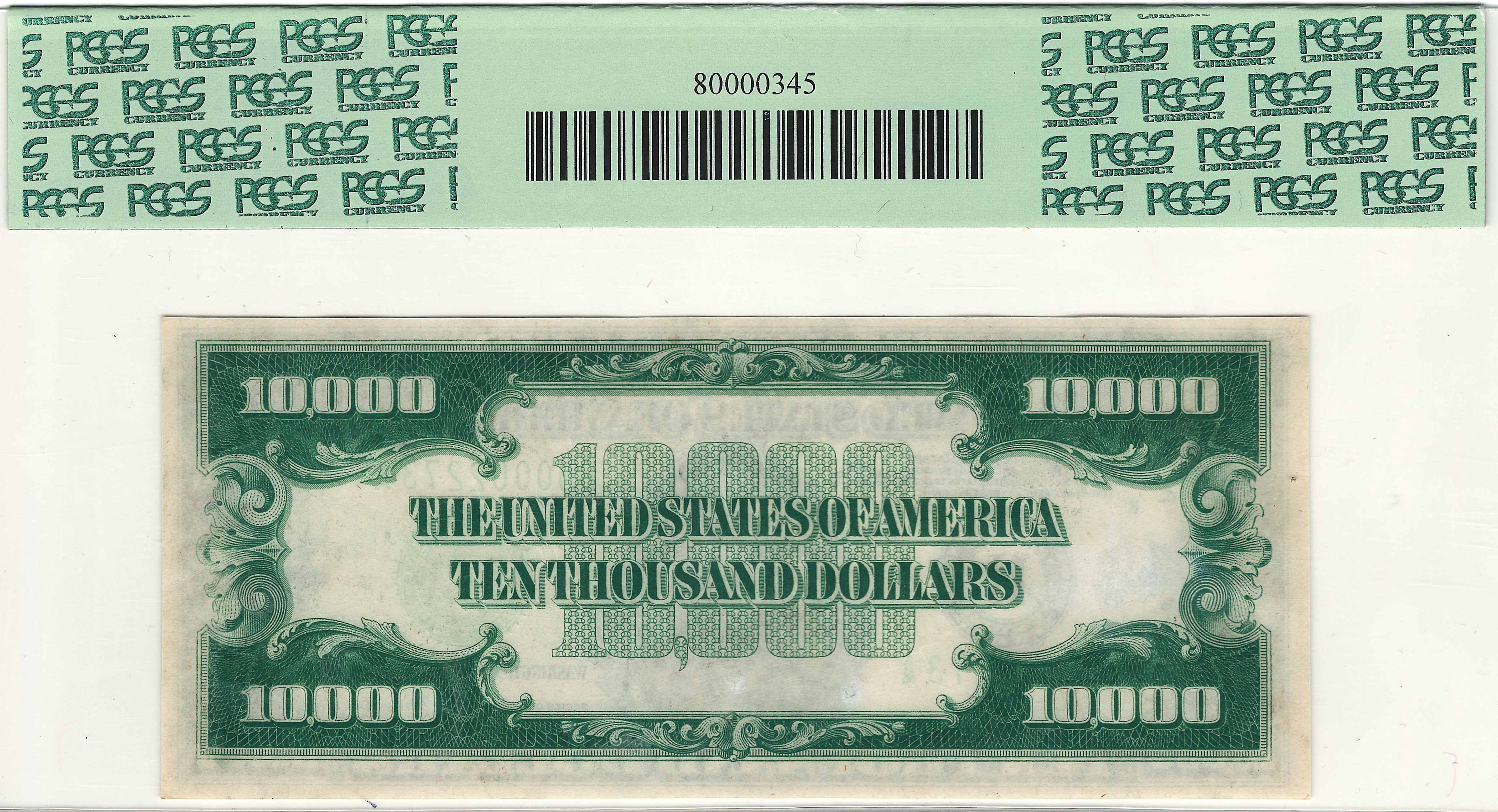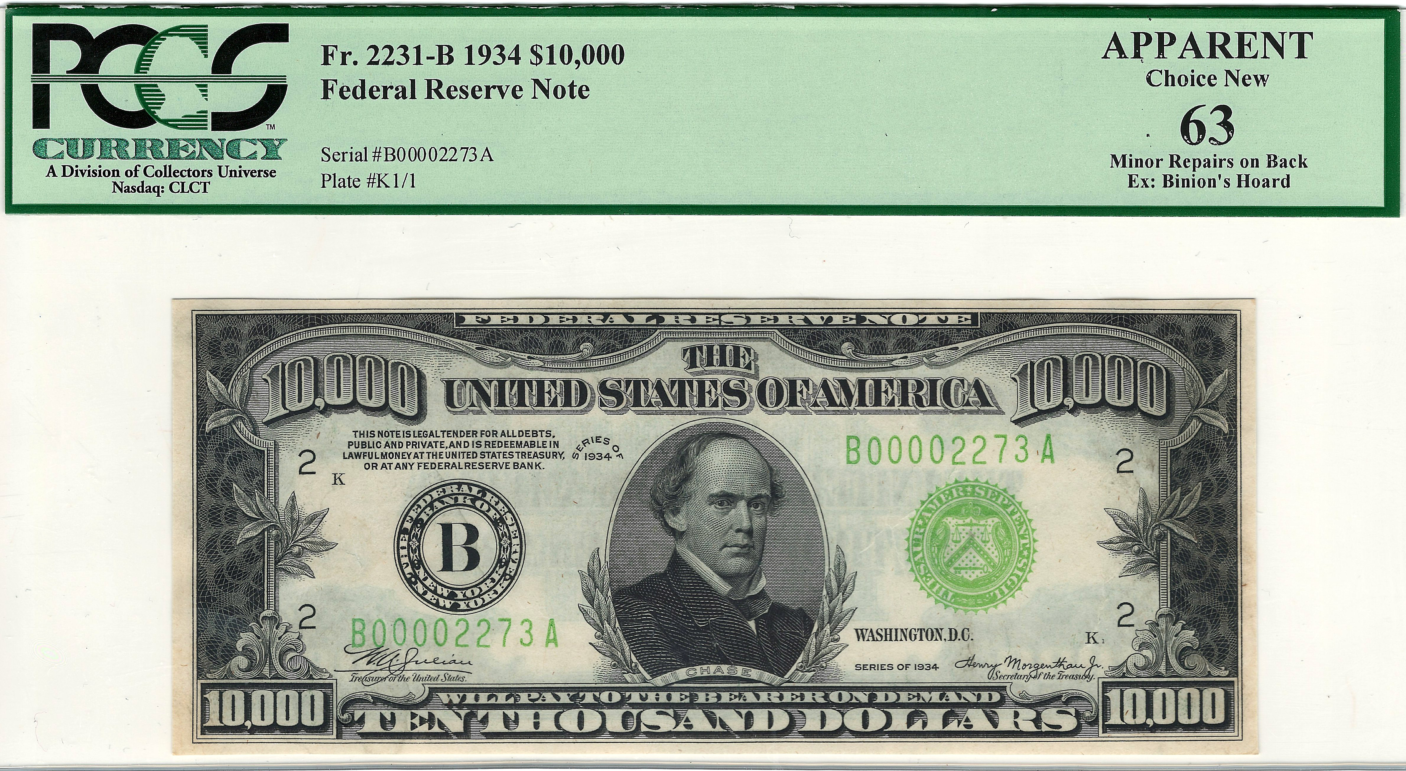 All 100 of the $10,000 bills from the Inverted Horseshoe were sold off by the daughter of the late Benny Binion in December of 1999 to pay for the pension fund of the hotel and casino workers. In January of 2000 they were carefully removed from the Inverted Horseshoe display and sold off to investors and collectors. This note was one of the ones on display. The serial number of this note is B00002273A and is in a PCGS-63app holder.