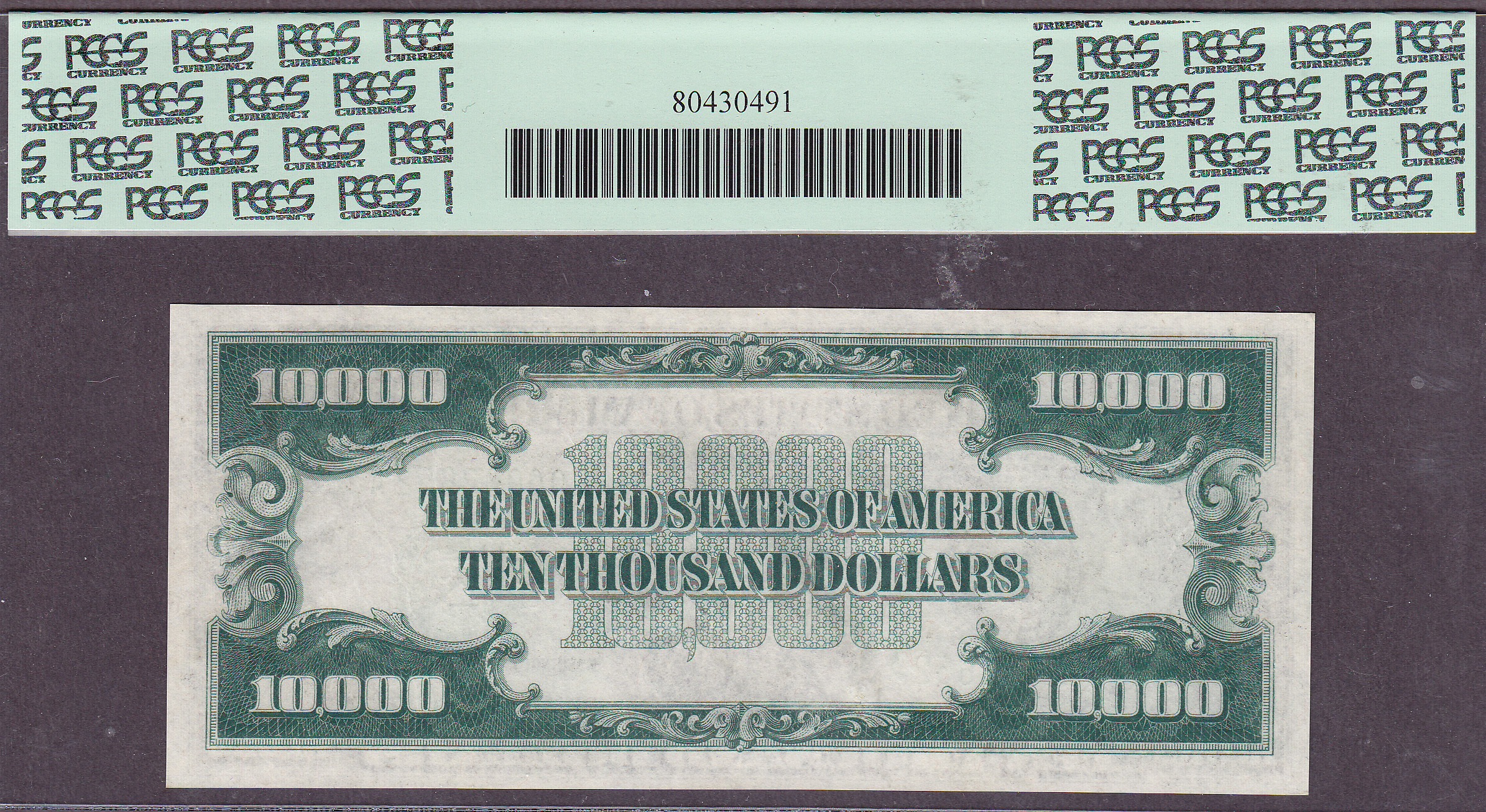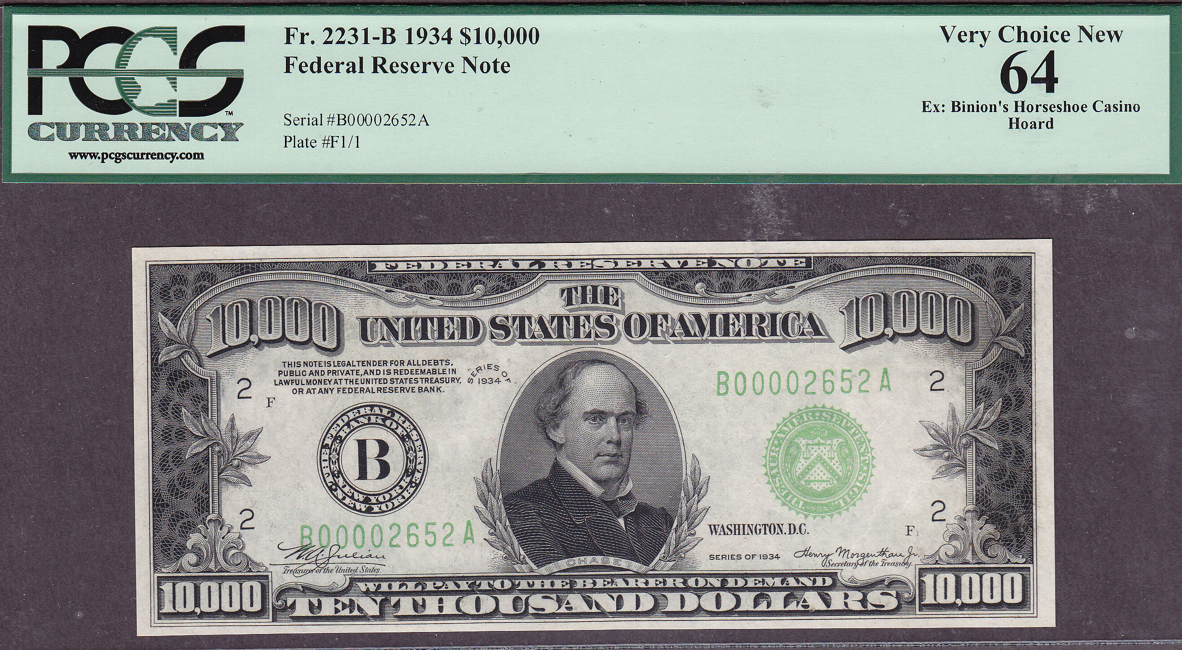 All 100 of the $10,000 bills from the Inverted Horseshoe were sold off by the daughter of the late Benny Binion in December of 1999 to pay for the pension fund of the hotel and casino workers. In January of 2000 they were carefully removed from the Inverted Horseshoe display and sold off to investors and collectors. This note was one of the ones on display. The serial number of this note is B00002652A and is in a PCGS-64 holder.