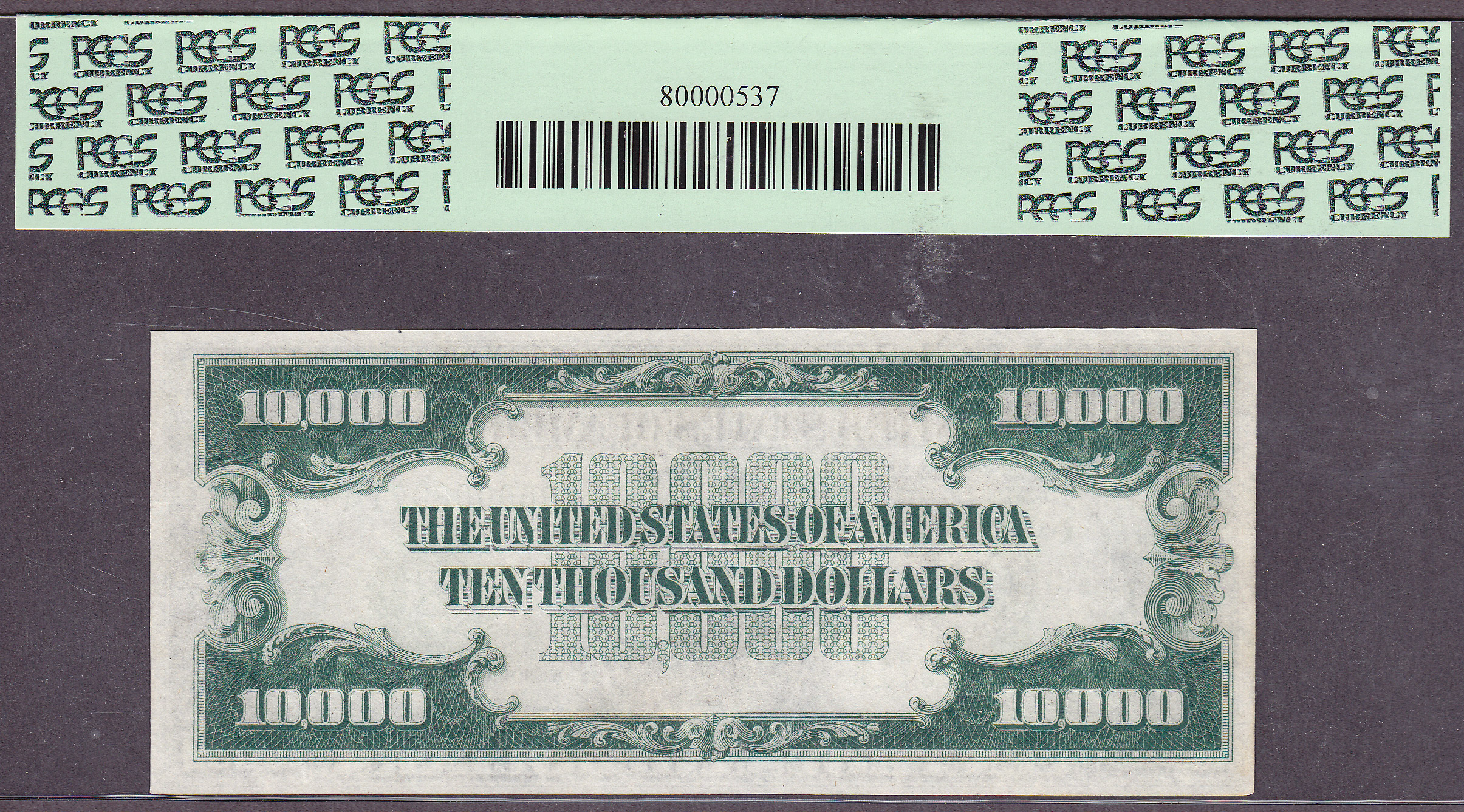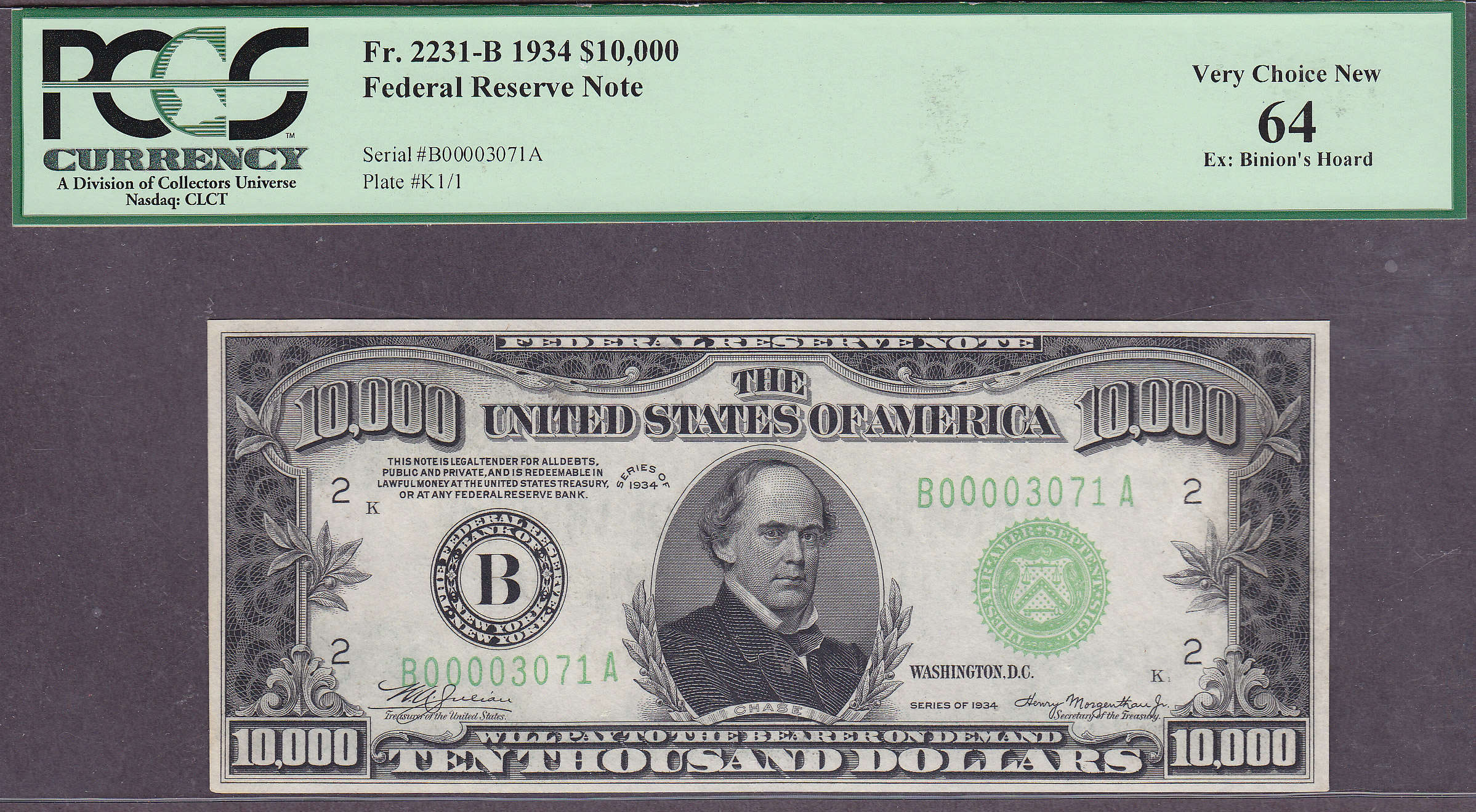This is one of the infamous 100 pedigreed $10,000 bills that were on display in the famous $1 million dollar display in the Inverted Horseshoe originally located at the entrance of Benny Binion's Horseshoe Hotel and Casino in Las Vegas from 1963 to 1999. Millions of visitors had their photo taken in front of the display. One of the more famous people was Charles Manson. Due to financial reasons, the display was removed and sold in December of 1999. They were offered at the time for $200,000 to $250,000. The serial number of the one being offered here is B00003071A and resides in a PCGS-64 holder. The inverted Horseshow display had 5 rows, A, B, C, D, and E. of 20 notes each. This particular note was located in Row A, the fourth one down. It is referred to as placement A4. I have the placement of each note on the display.