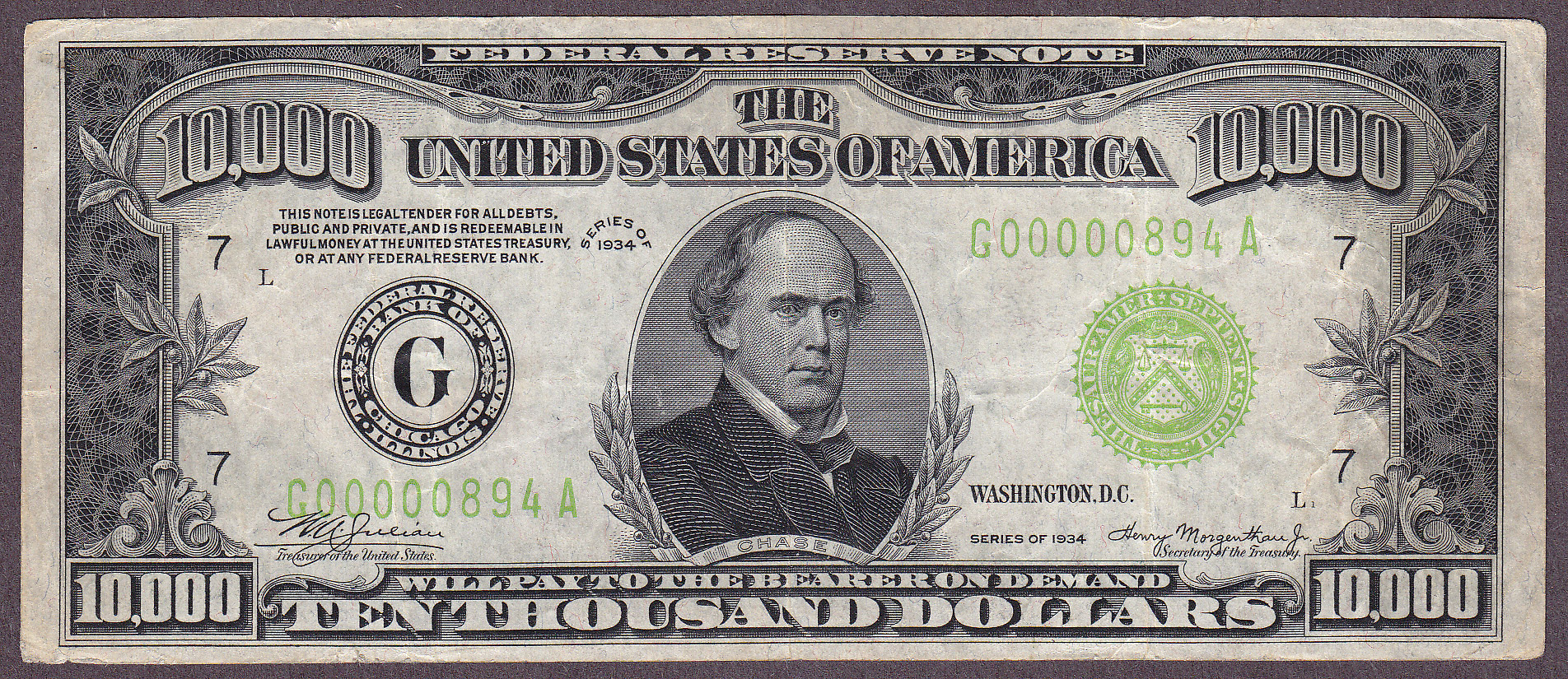 This is another nice $10,000 bill that I just re acquired from a past client. This is a 1934 $10,000 bill from the famed city of Chicago. It also features the Light Green Seal Varity (LGS).The serial number is G0000894A.