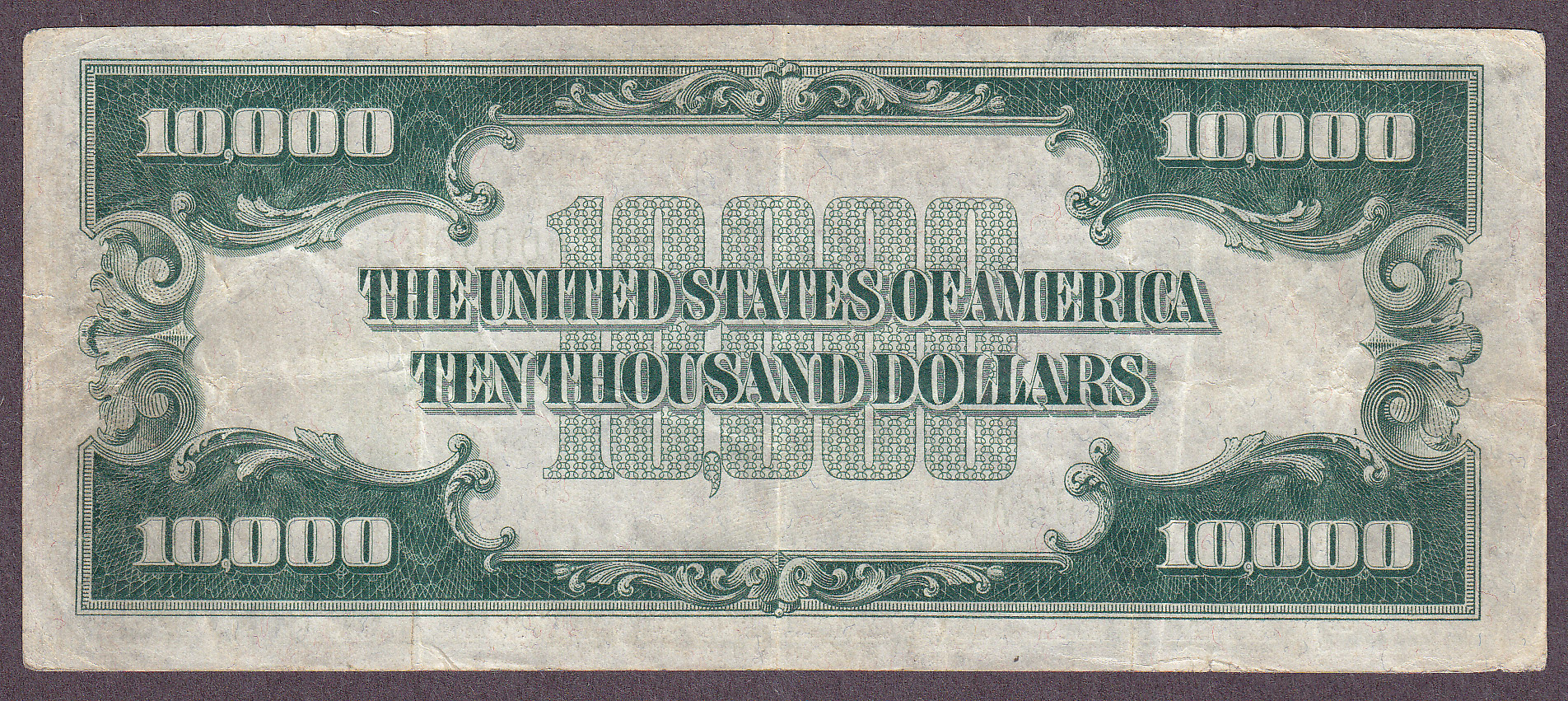 The US $10,000 bill is the largest denomination that the Treasury Department ever released to the public. They were printed from 1928 to 1946. In July of 1969 President Nixon signed a law that prohibited the government from releasing anything higher that a $100 bill to the banks. Most of them have been turned in and destroyed by the Treasury department. There are appox 200 known to exist according to the official census. Most of the $10K notes to survive include the 100 New York Binion notes from the famous Inverted Horseshoe that was the center of attraction at Benny Binion’s Hotel and Casino in Las Vegas from 1964 to 1999.