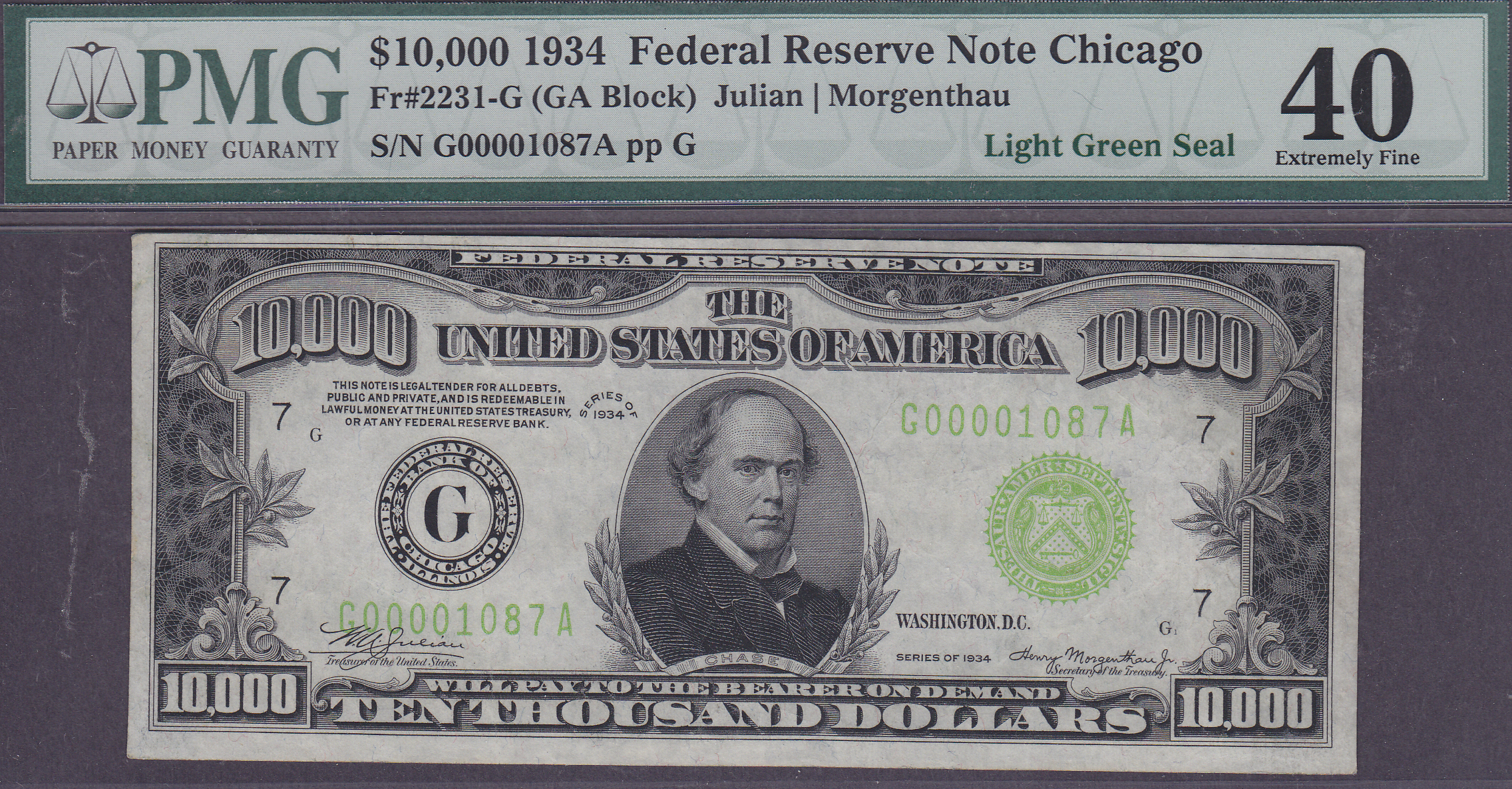 This is a really nice example of the 1934 $10,000 bill from the Chicago District. There are only 25 examples known from this district compared to 103 from the New York district. Chicago has always been one of my favorite districts, next to the Dallas district. Very rarely do I come across a nice VF to EX example of a $10,000 without any issues.