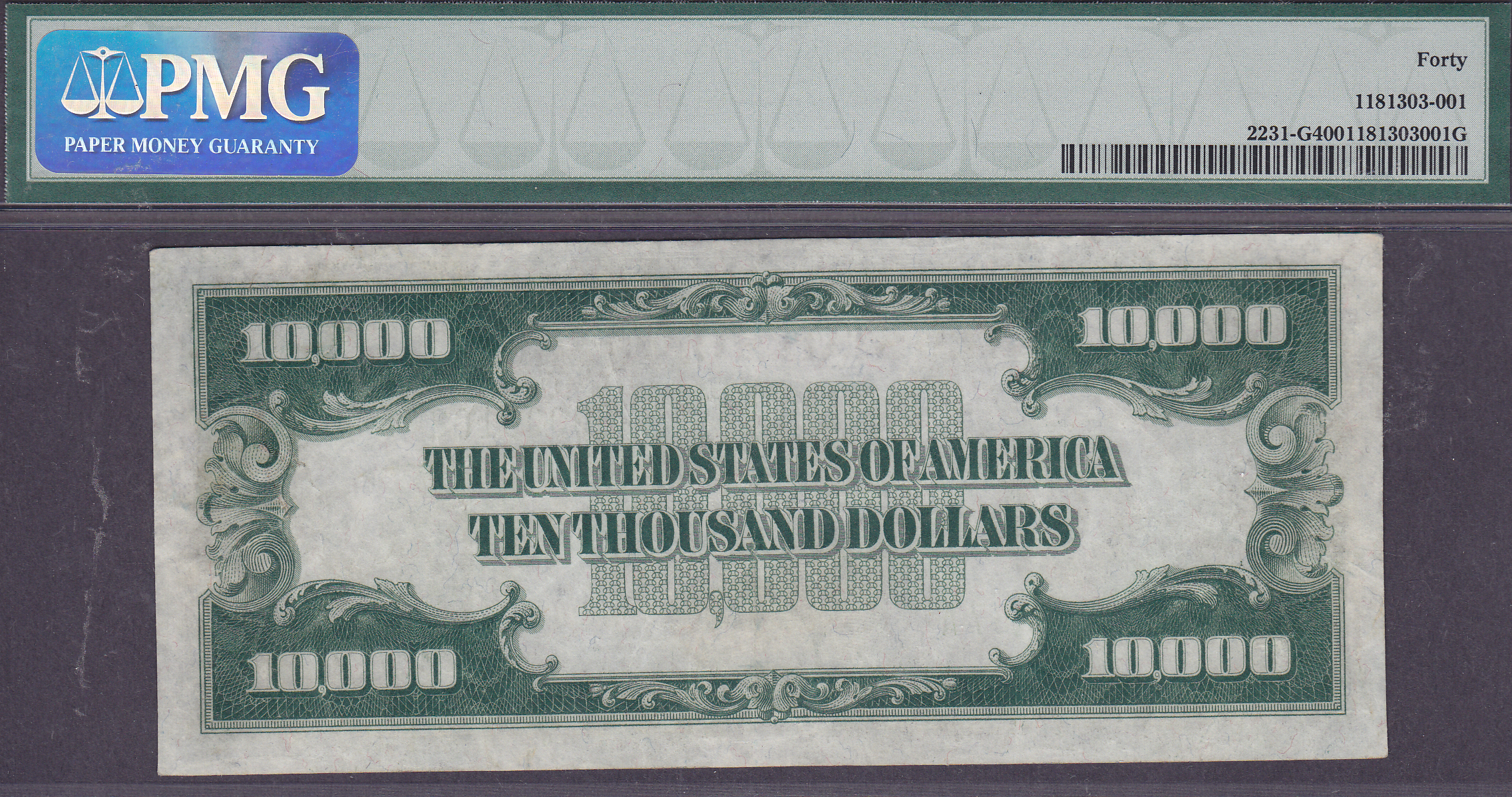 This beautiful Extra Fine example has absolutely no rips, tears, pinholes, bank markings, missing pieces or holes. This is a good example of a three-fold Extra Fine. You won’t be able to see them but there are three folds somewhere on this note. Check the large scans and see the beautiful boardwalk margins. The creamy white paper with deep inks really shows up clearly, especially on the front. Anyone who ends up with this gorgeous $10,000 bill note is going to be extremely happy.