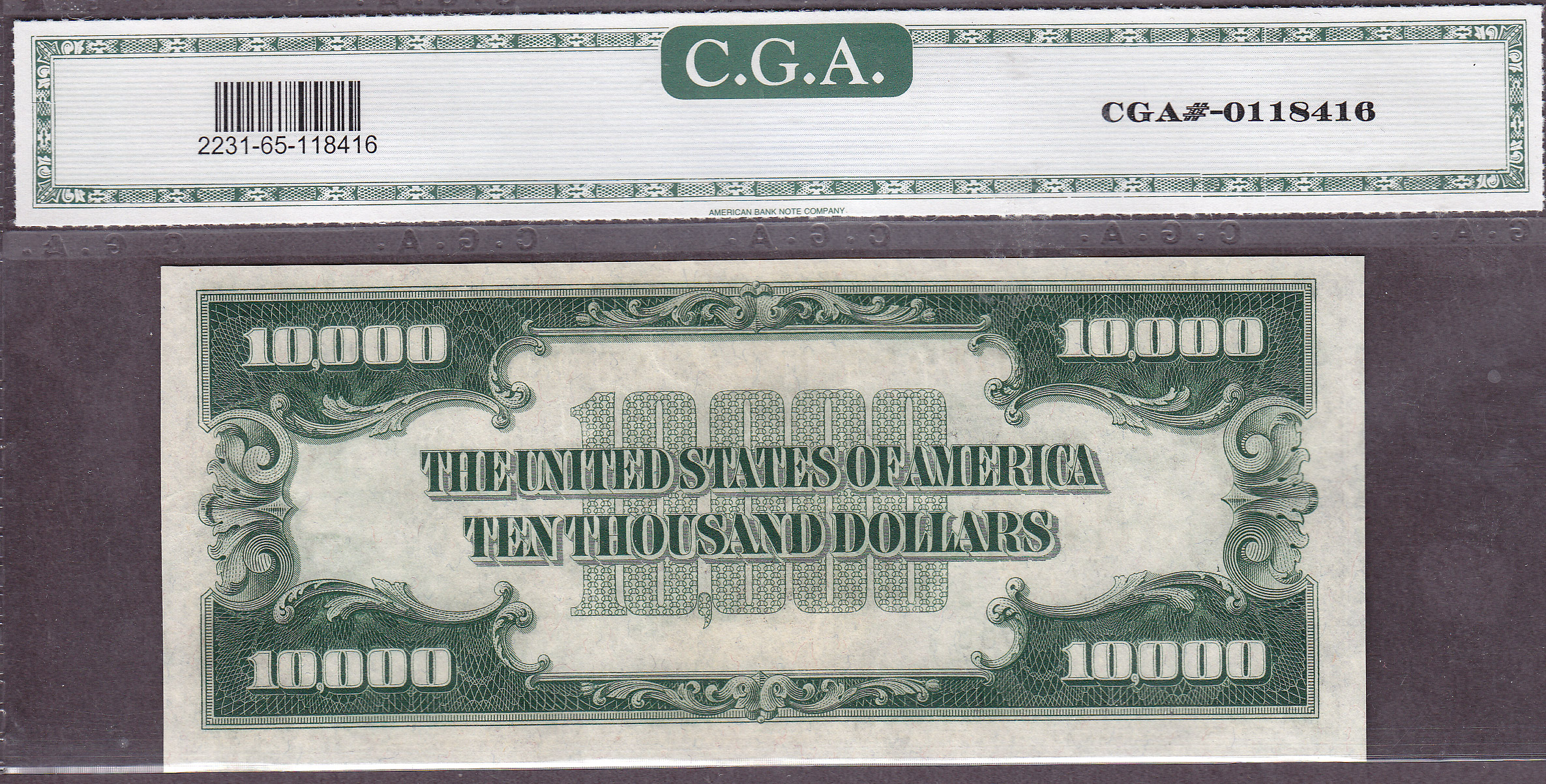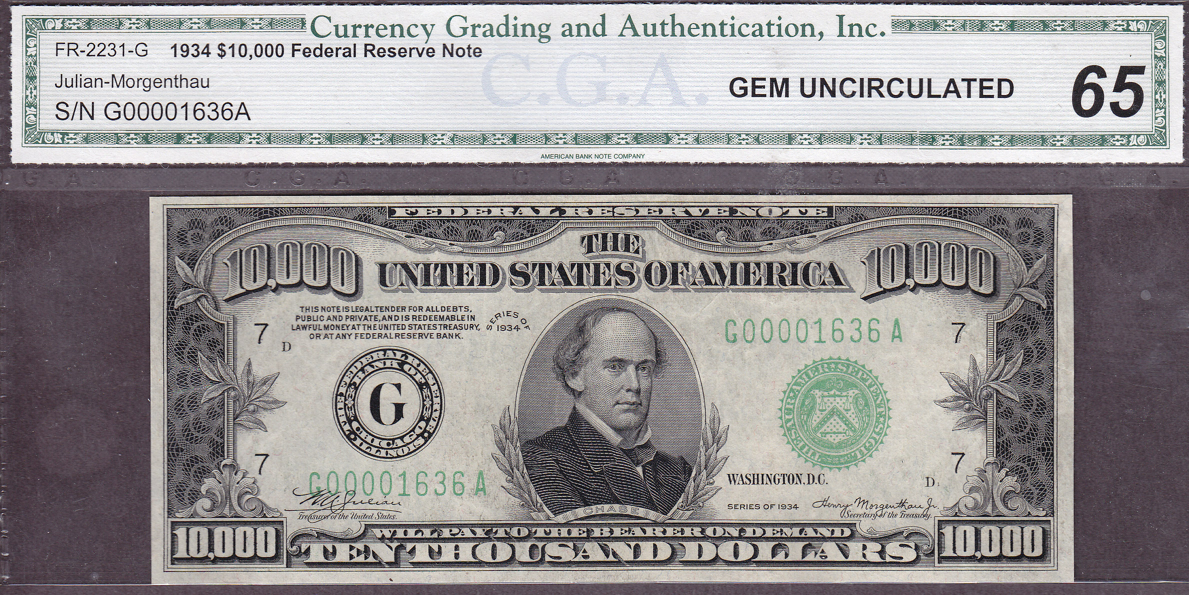 This is one of those rare finds you never see offered for sale on any website or at any major auction. This is a 1934 $10,000 bill from the popular Chicago district. The serial number of this Light Green Seal $10K bill is G00001636A and it is in a CGA-65 GEM holder. This Chicago note is also part of the famous Bank One Hoard that was discovered in Houston in a safety deposit box in 1999 along with a few $5,000 and several hundred $500 and $1,000 dollar bills. This is the second time I've owned this CGA GEM $10,000 note. This Chicago $10,000 bill was last sold on August 7th of 2009 for $137,000.