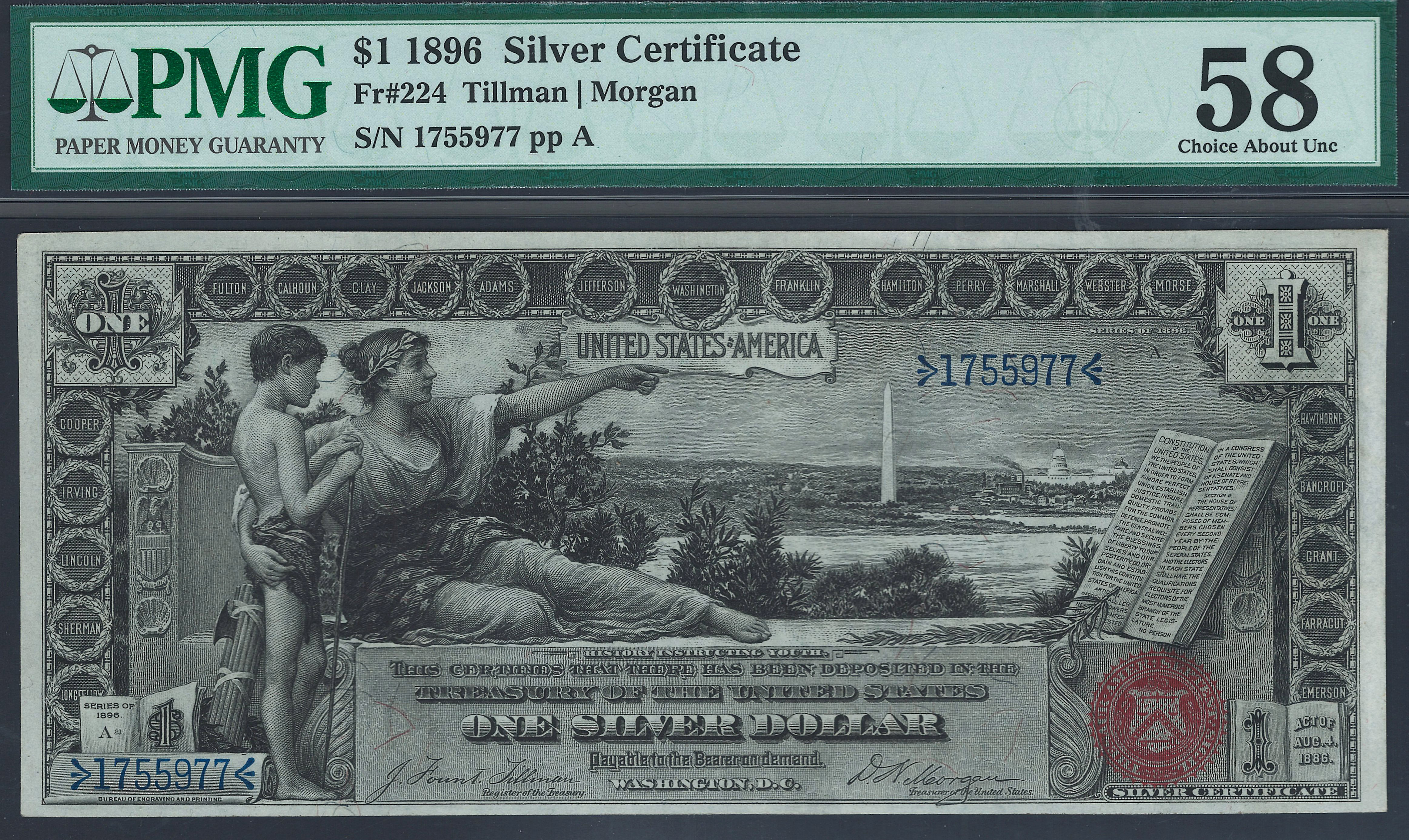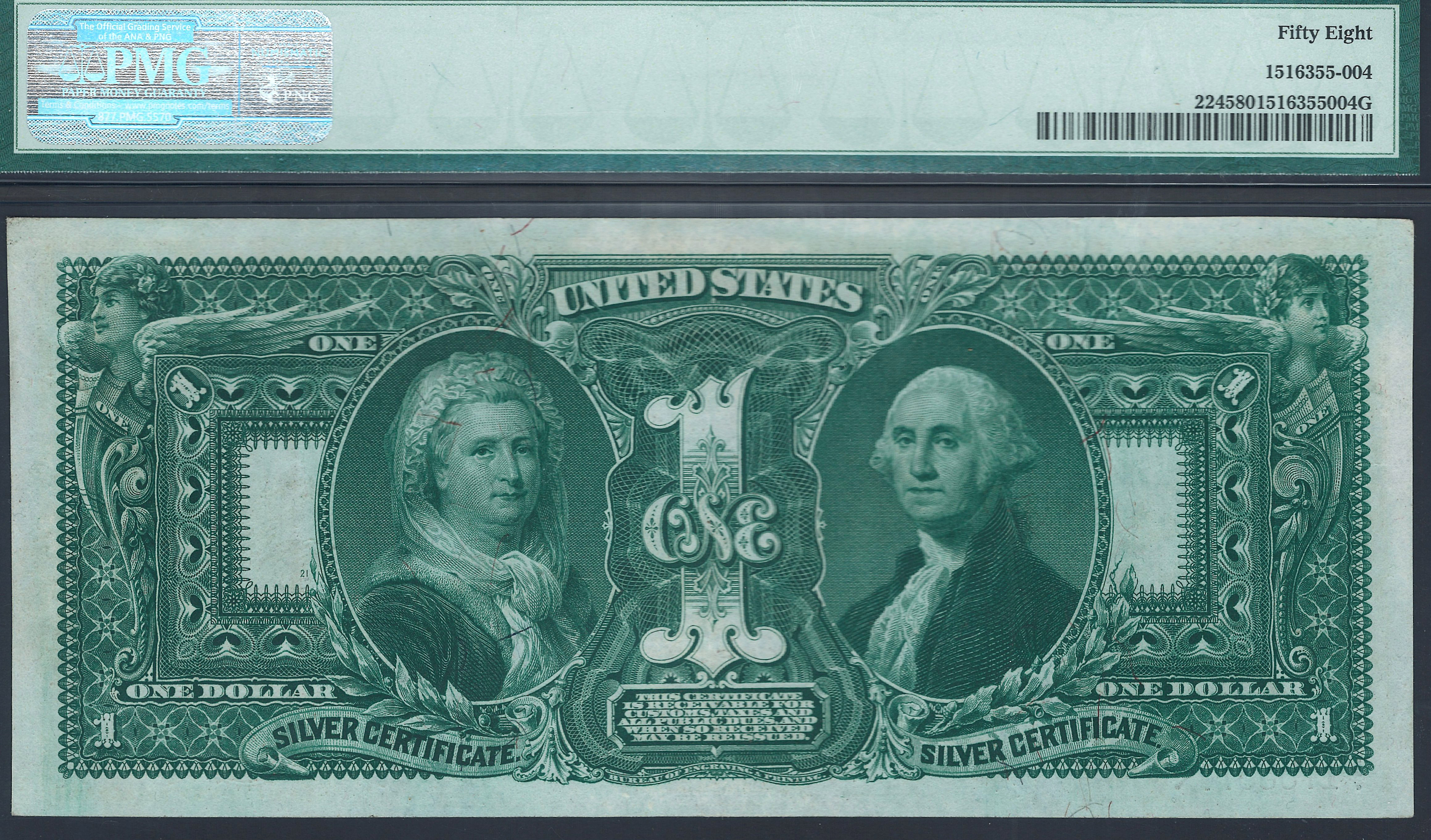 This is a very nice example of the 18936 $1 Silver Certificate commonly referred to as the Educational note. It is part of the 3 note series of 1896 consisting of the $1, $2 and the $5. It depicts History instructing youth about the constitution to the right. This example has no rips, tears, pinholes or bank stamps. Check the back margins and see how it faces up like a GEM note. For the person who wants a real nice example of the 1896 $1 Education at a very affordable price, you need to consider this one. The serial number is 1755977 and is in a PCGS almost uncirculated 58 holder.