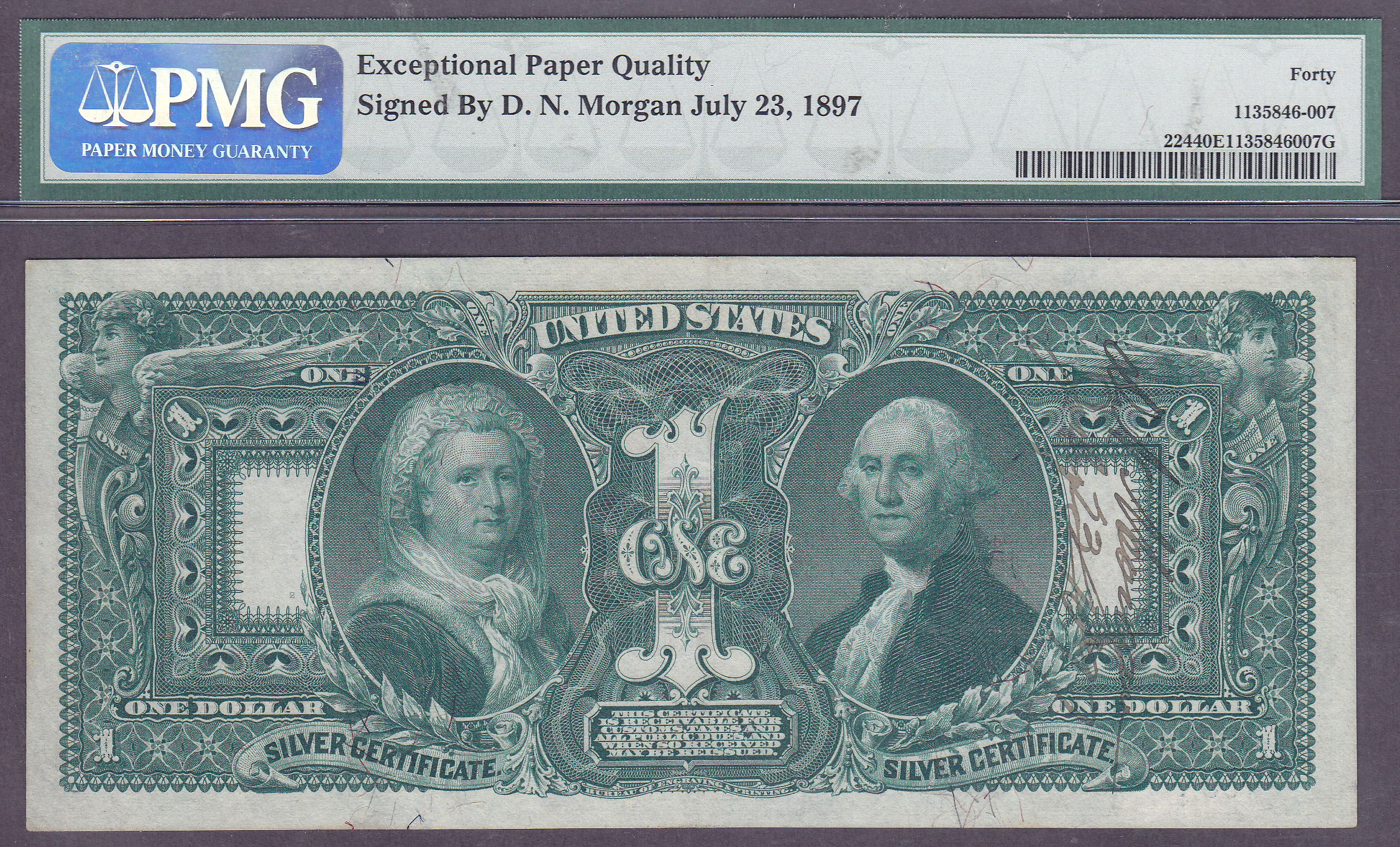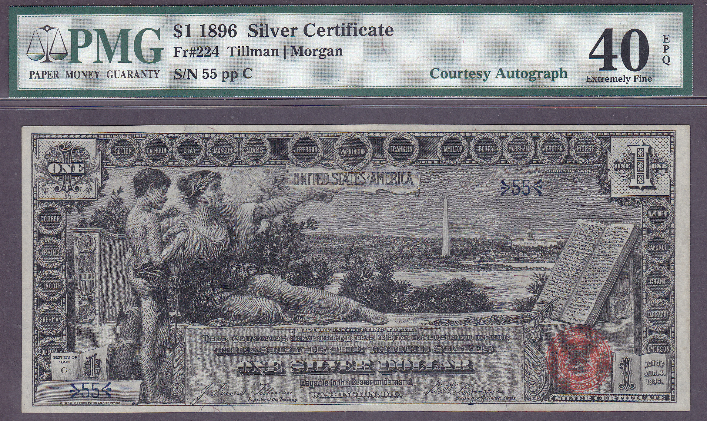 This is an amazing find as it is one of the lowest serial numbers known for a Fr.-224 1896 $1 Educational note. The serial number is a super two-digit solid serial number # 55 and it resides in a PMG-40EPQ holder. What make this rarity so important is it has a Courtesy Autograph on the back signed in very legible ink by the then Treasurer of the United States D.N. Morgan and dated July 23rd of 1897. That is 118 years ago! How cool is that? This was a Presentation Note that someone folded and put away as it never got into the general circulation! Too bad they folded it as it has GEM margins and the inks are as vibrant as the day it was printed.