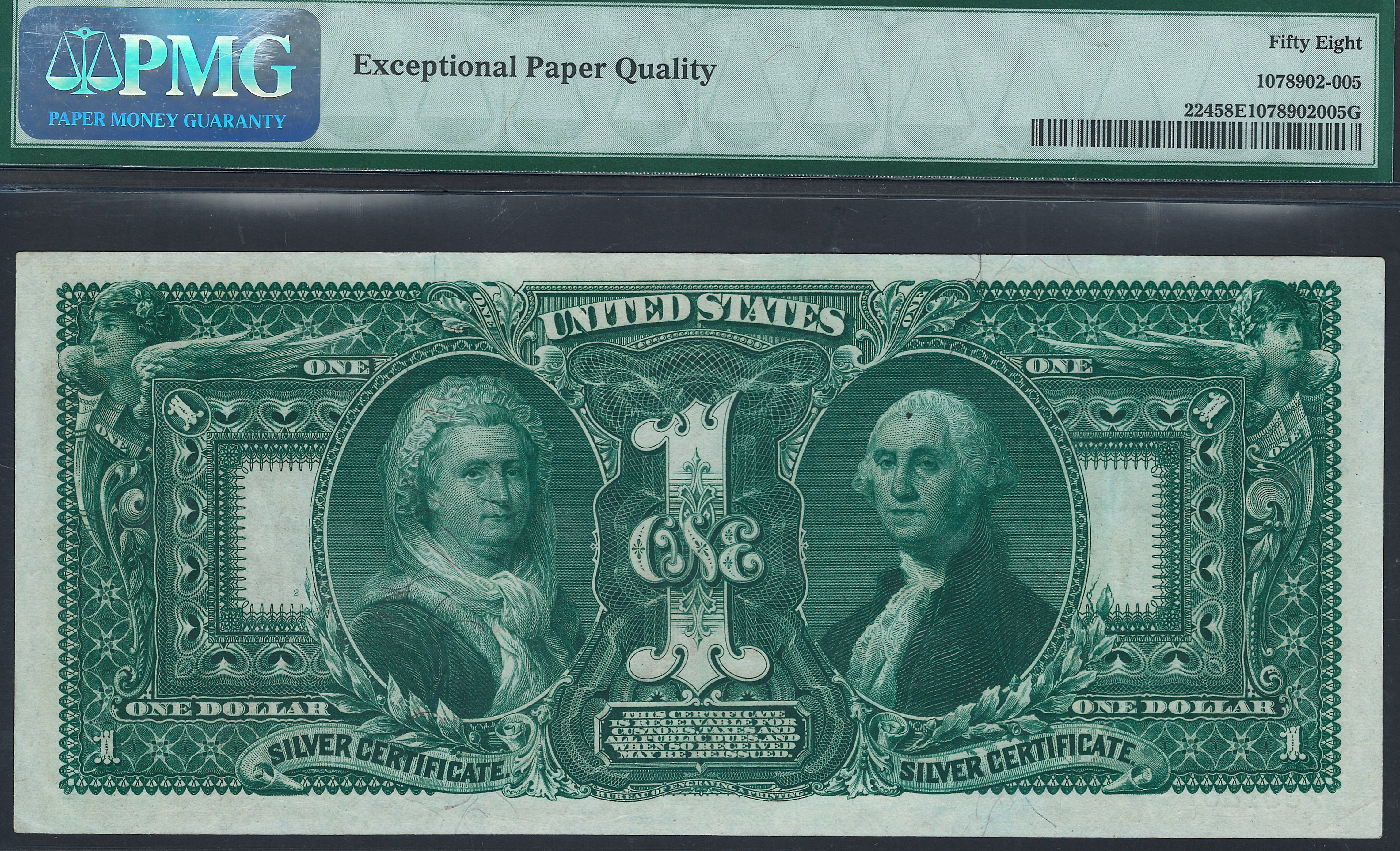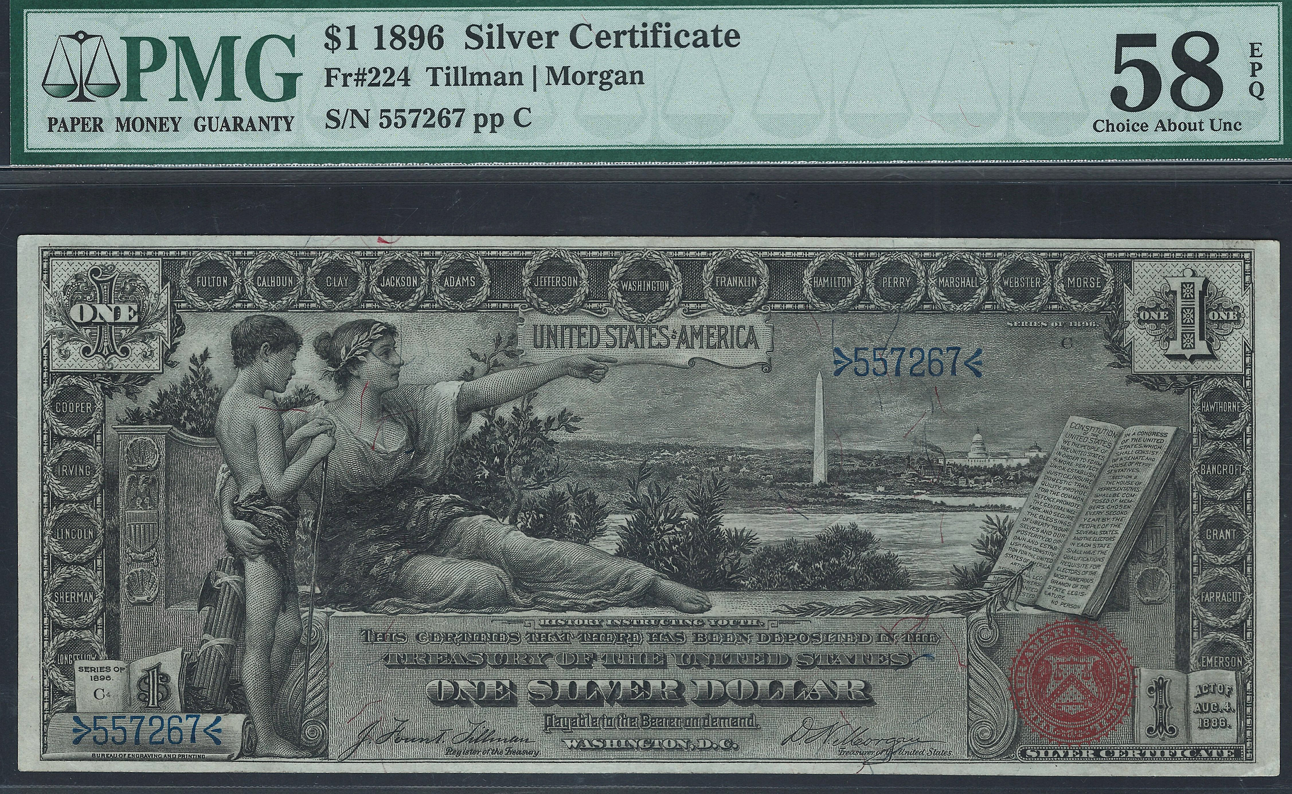 This is one of the nicest 1896 $1 Educational notes that I have ever seen in a 58 holder. There must be a fold somewhere in the note, I just can't find it. This Fr.-224 faces up like a GEM note with the perfect centering on the front and back. In my opinion this is what a GREAT PMG-58EPQ note should look like! The centering, the color and the paper quality have all come together for one very nice 1896 $1 Educational or I should say Silver Certificate. This was a nice find. The serial number is 557267 and it is in a PMG-58PPQ holder.