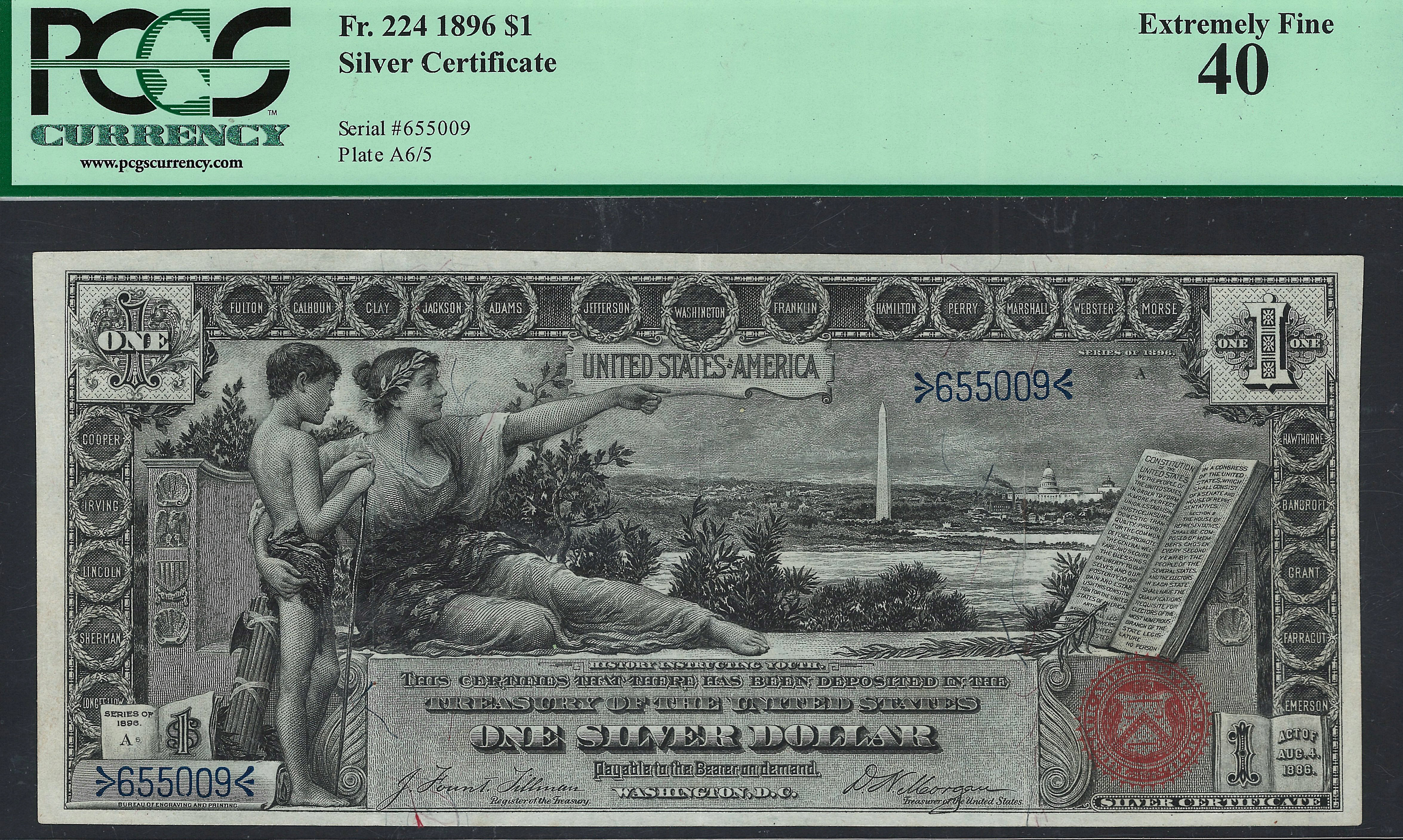 This is a very nice 1896 $1 Education note which was part of a complete set of Educational's I just purchased at the Rocky Mountain Denver show held May 11th, 2014. The $2 Educational lasted just 5 minutes on the website. As you can see by the large scans this is a well centered note with great paper quality and vivid inks. There are no rips, tears, pinholes or bank marks. The serial number is 655009 and it resides in a PCGS EF-40 holder. This note was previously in a CGA-64 holder. I have priced it at wholesale prices for some lucky collector. Grab it before it is gone!