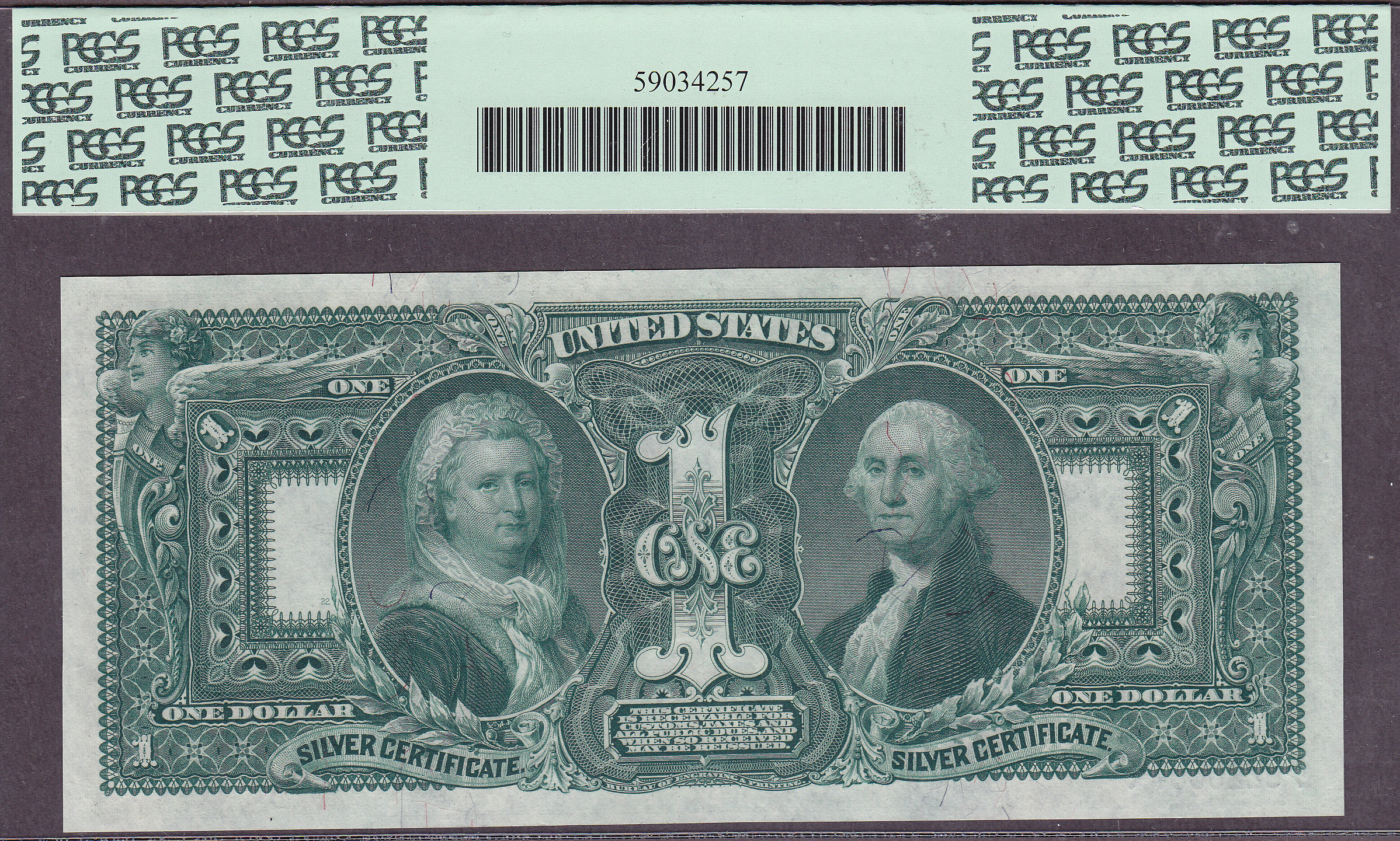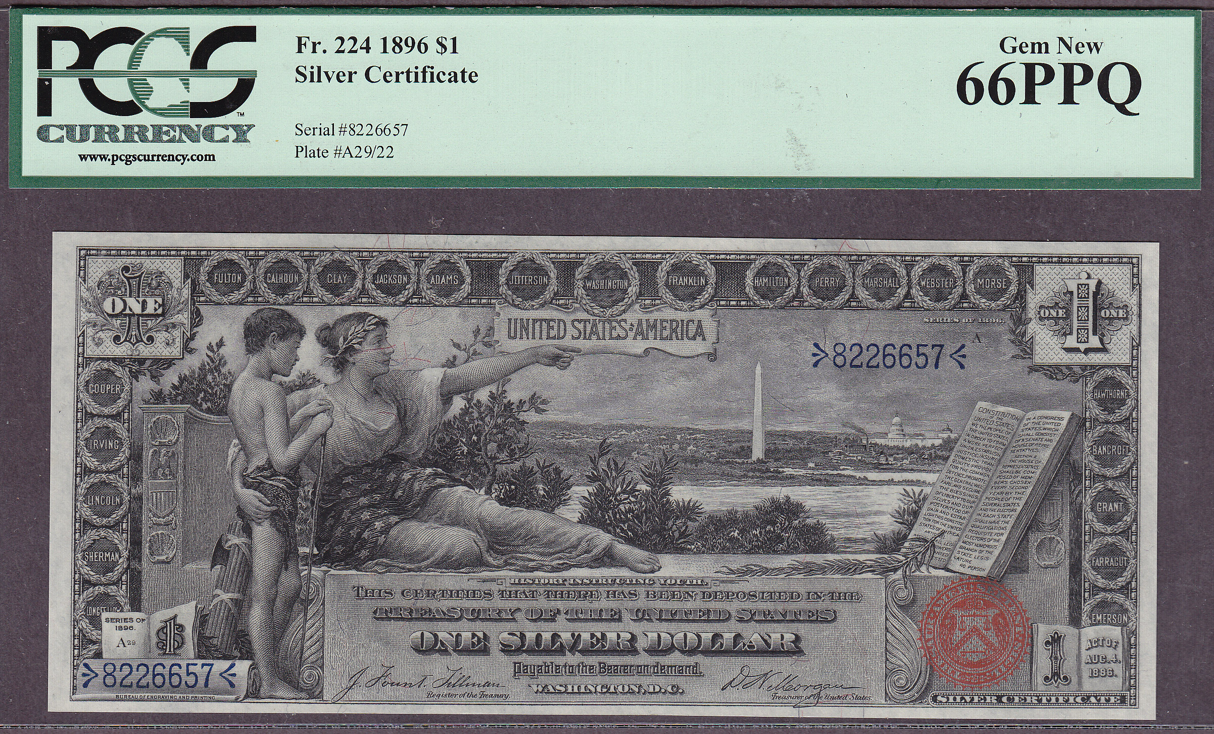 They do not come any nicer than this one. Here is the famous 1896 $1 Educational note in Superb GEM condition. Look close and you will see perfect margins all around. The blue serial numbers are as vivid as the day it was printed 113 years ago. The back design is graced by a photo of Martha and George Washington surrounded by a deep green ink. The margins on the back are perfect top to bottom left to right. If you are looking for the best, look no further. They simply do not get any better than this. Look for yourself using the large scans. EVERYTHING is perfect. The serial number is 8226657 and it is in a PCGS-66PPQ holder. This note is marked down for a quick sale.