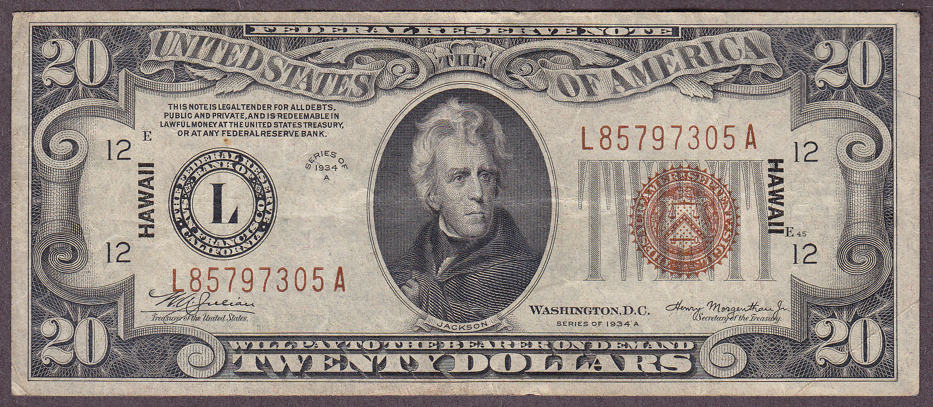 Fr.-2305 1934 $20 San Francisco - Hawaii Ser. L85797305A VF