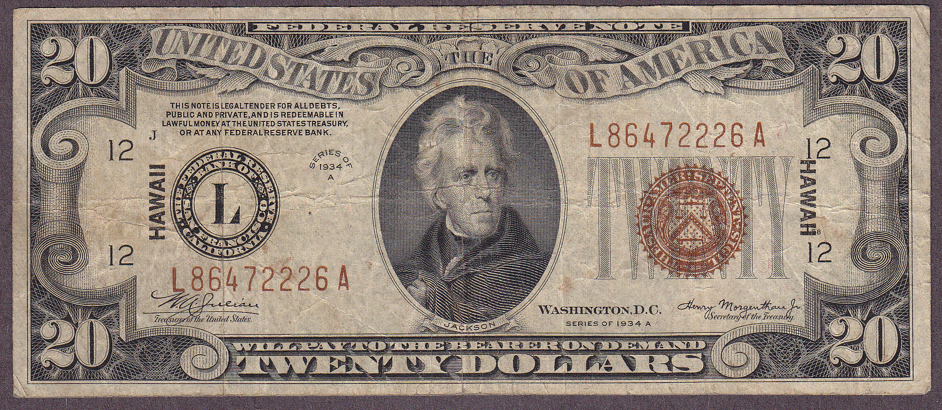Fr.-2305 1934-A $20 San Francisco - Hawaii Ser. L86472226A Raw