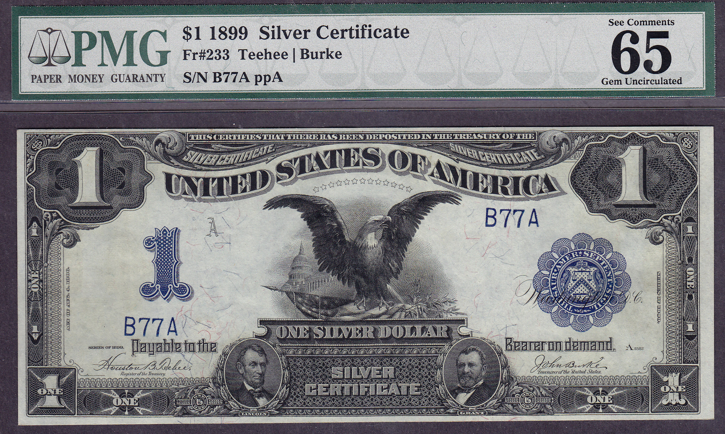 Fr.-233 1899 $1 Black Eagle Ser. # B77A PMG-65EPQ & GE