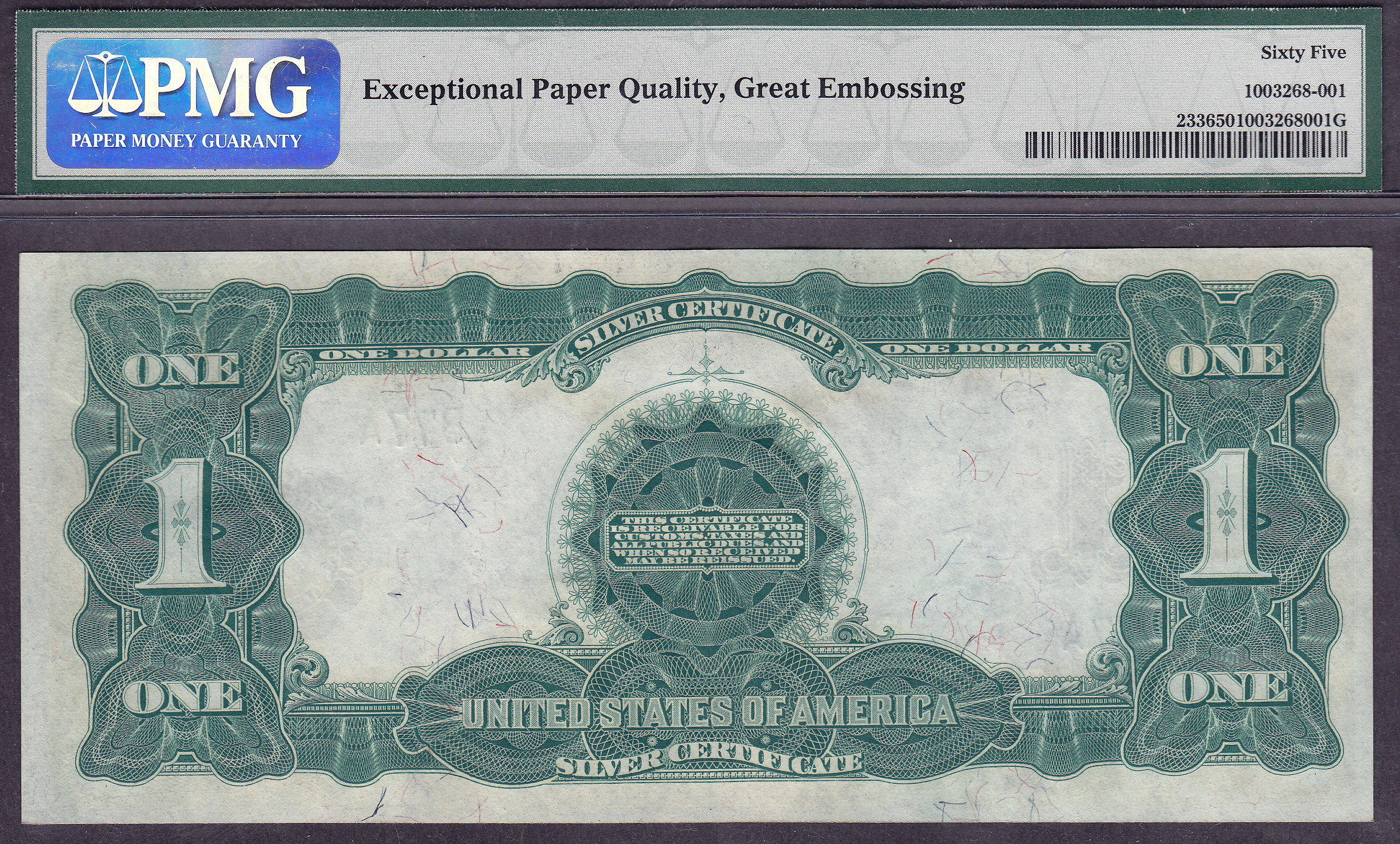 This is a super 2-digit 1899 $1 Black Eagle Silver Certificate. The serial number is B77A and it is in a PMG-65EPQ & GE holder. Notice PMG has put the "GE" notation on it that means Great Embossing. You can feel the embossing through the holder. Just joking! However you can definitely see the embossing through the holder. This Black Eagle is 100% original with no problems and it features a super low 2-digit serial number. I have a major collection of these low 2 and 3-digit and fancy serialized Black Eagles that I am putting on this site. Check them out as they are cool to view and you can email them to your friends.