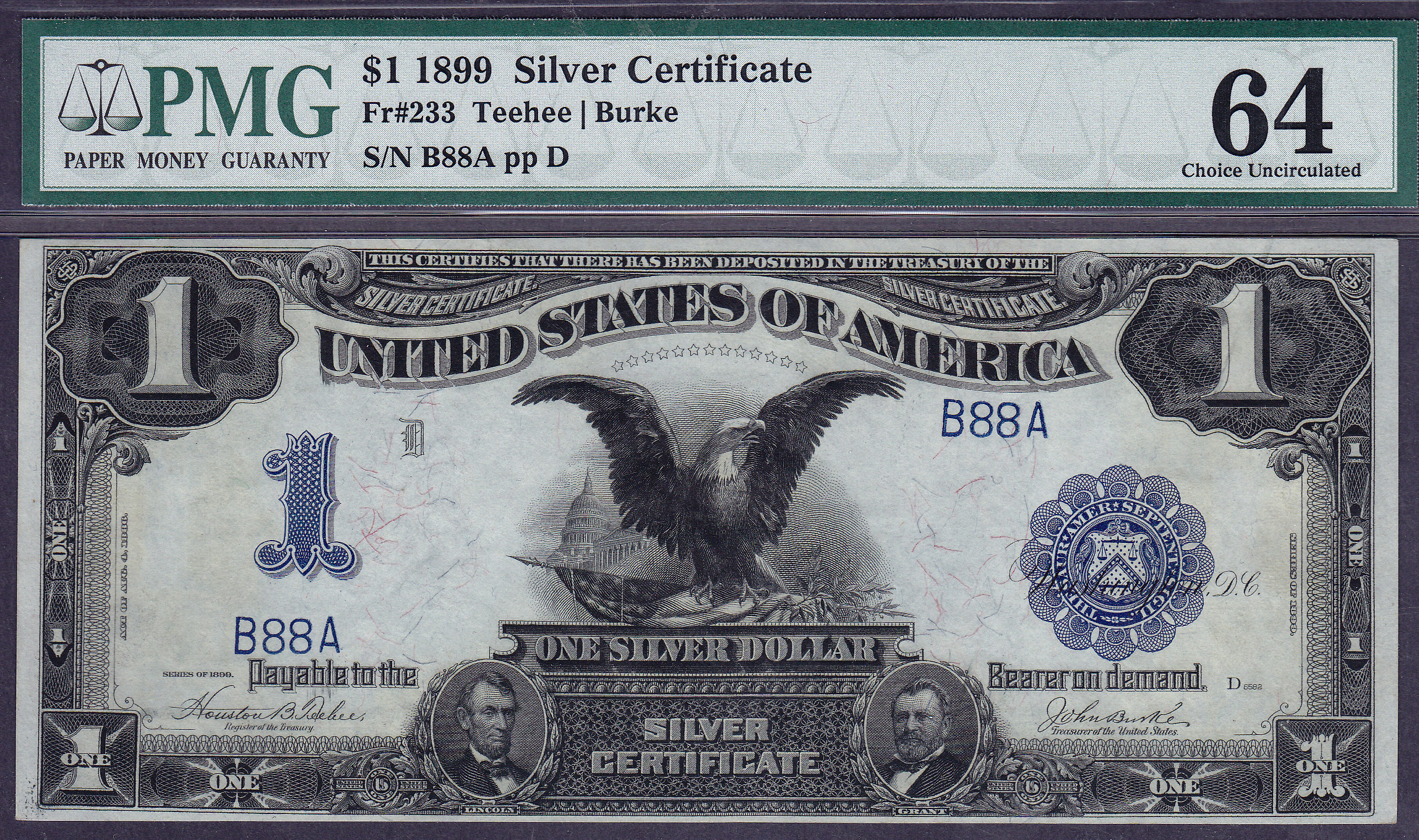 Fr.-233 1899 $1 Black Eagle Ser. # B88A PMG-64 GE