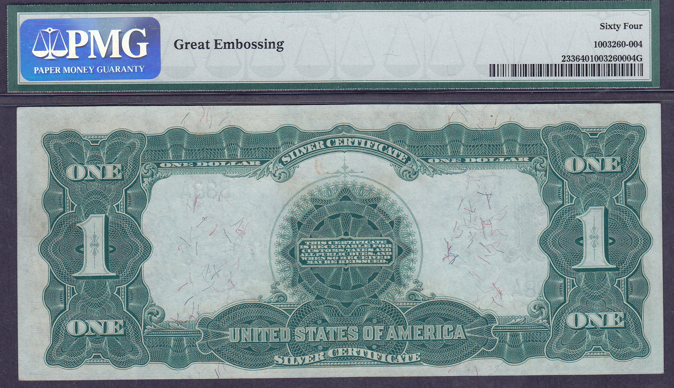 This is a super 2-digit 1899 $1 Black Eagle Silver Certificate. The serial number is B88A and it is in a PMG-64EPQ & GE holder. Notice PMG has put the "GE" notation on it that means Great Embossing. You can feel the embossing through the holder. Just joking! However you can definitely see the embossing through the holder. This Black Eagle is 100% original and it features a super low 2-digit serial number. I have a major collection of these low 2 and 3-digit and fancy serialized Black Eagles that I am putting on this site. Check them out as they are cool to view and you can email them to your friends.