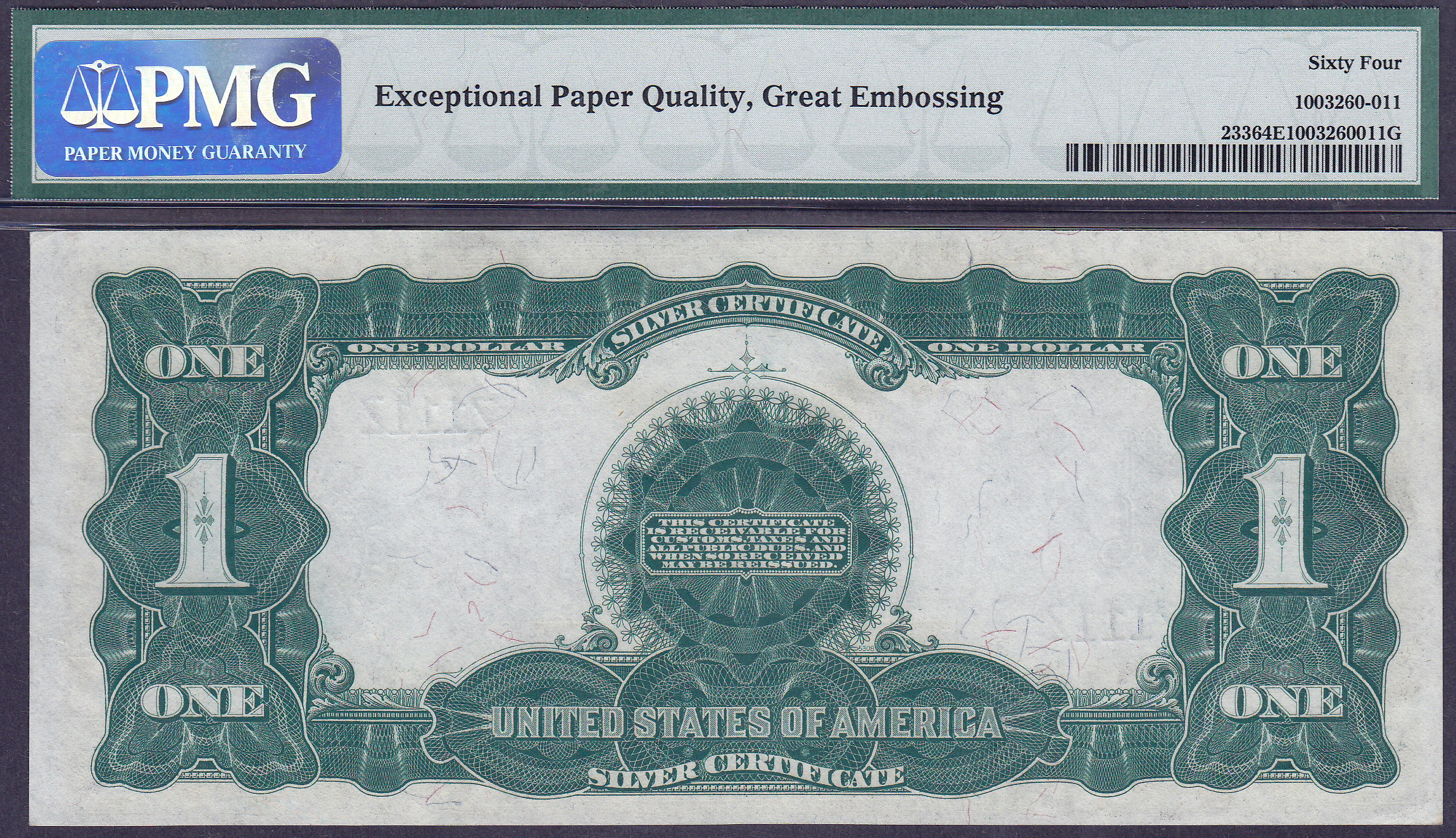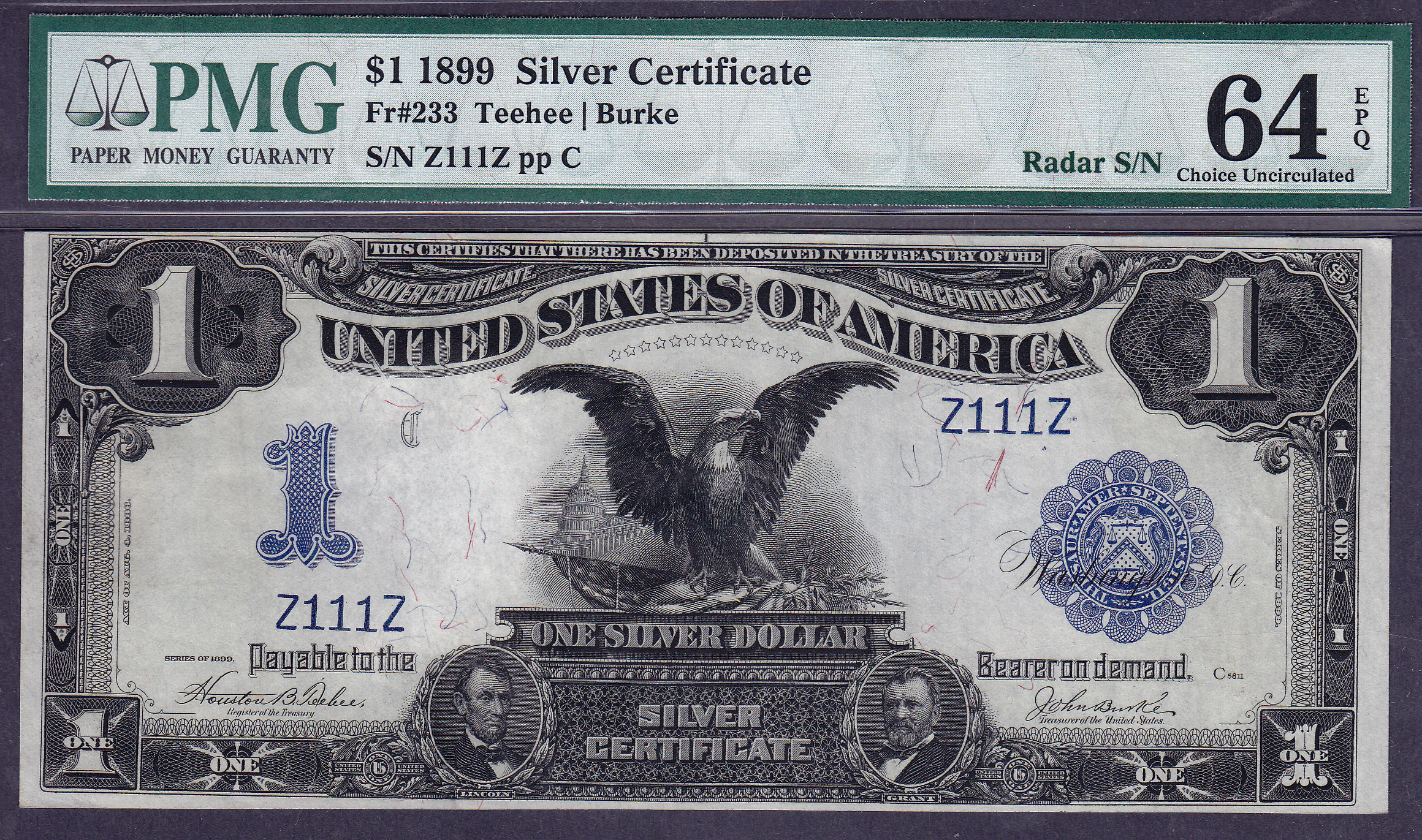 This is a super 3-digit 1899 $1 Black Eagle Silver Certificate. The serial number is Z111Z and it is in a PMG-64EPQ & GE holder. Notice PMG has put the "GE" notation on it that means Great Embossing. You can feel the embossing through the holder. Just joking! However you can definitely see the embossing through the holder. For some reason PMG has put RADAR S/N on the holder. I guess you could call it a Radar note, but I would call it a solid serial number note. Whatever! This Black Eagle is 100% original with no problems and it features a super low 3-digit serial number. I have a major collection of these low 2 and 3-digit and fancy serialized Black Eagles that I am putting on this site. Check them out as they are cool to view and you can email them to your friends. Notice the additional comment on the back, Great Embossing. Onlya handfull of the Black Eagles are this nice.