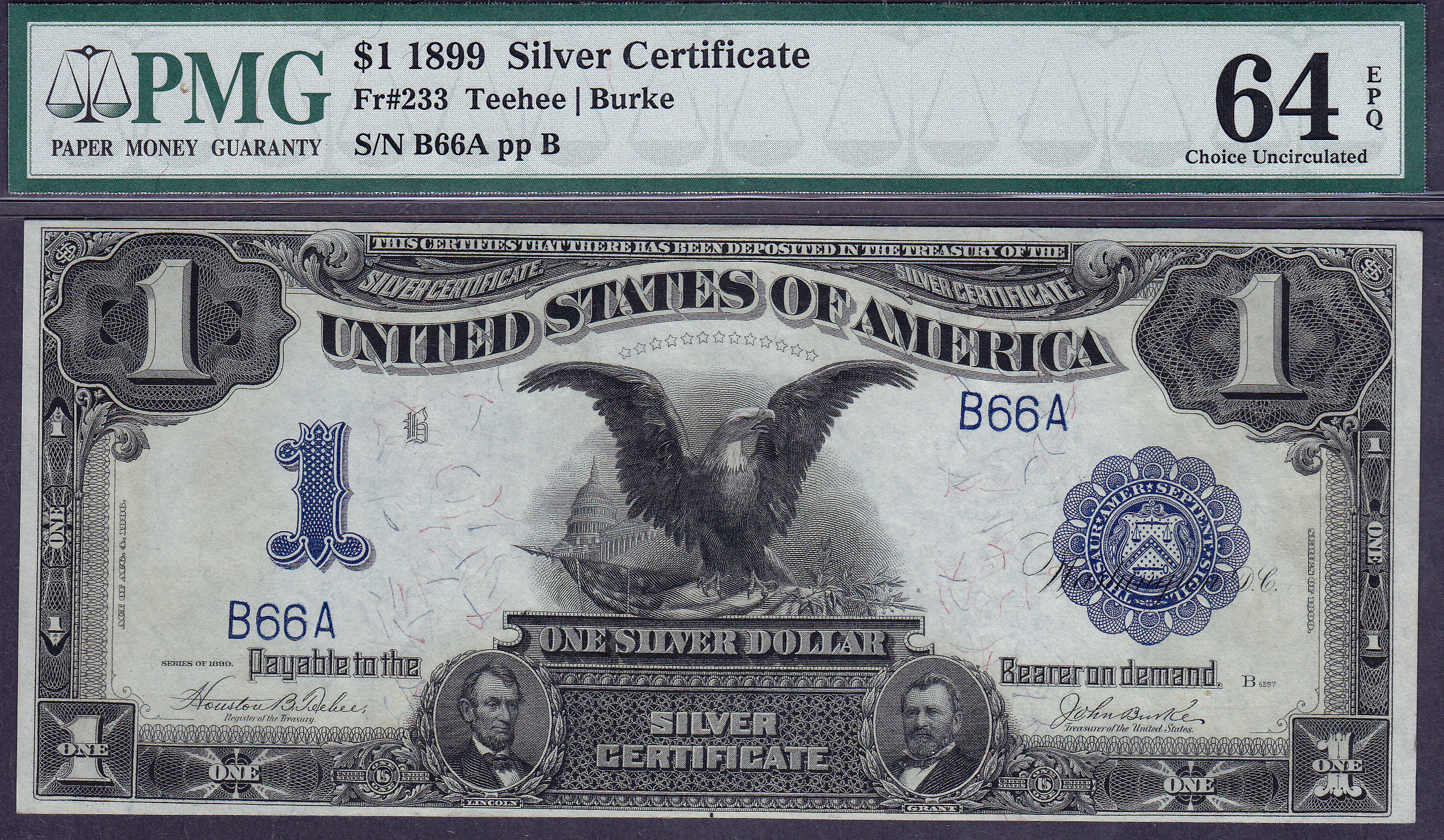 Fr.-233 1899 $1 Black Eagle PMG-64EPQ Serial # B66A
