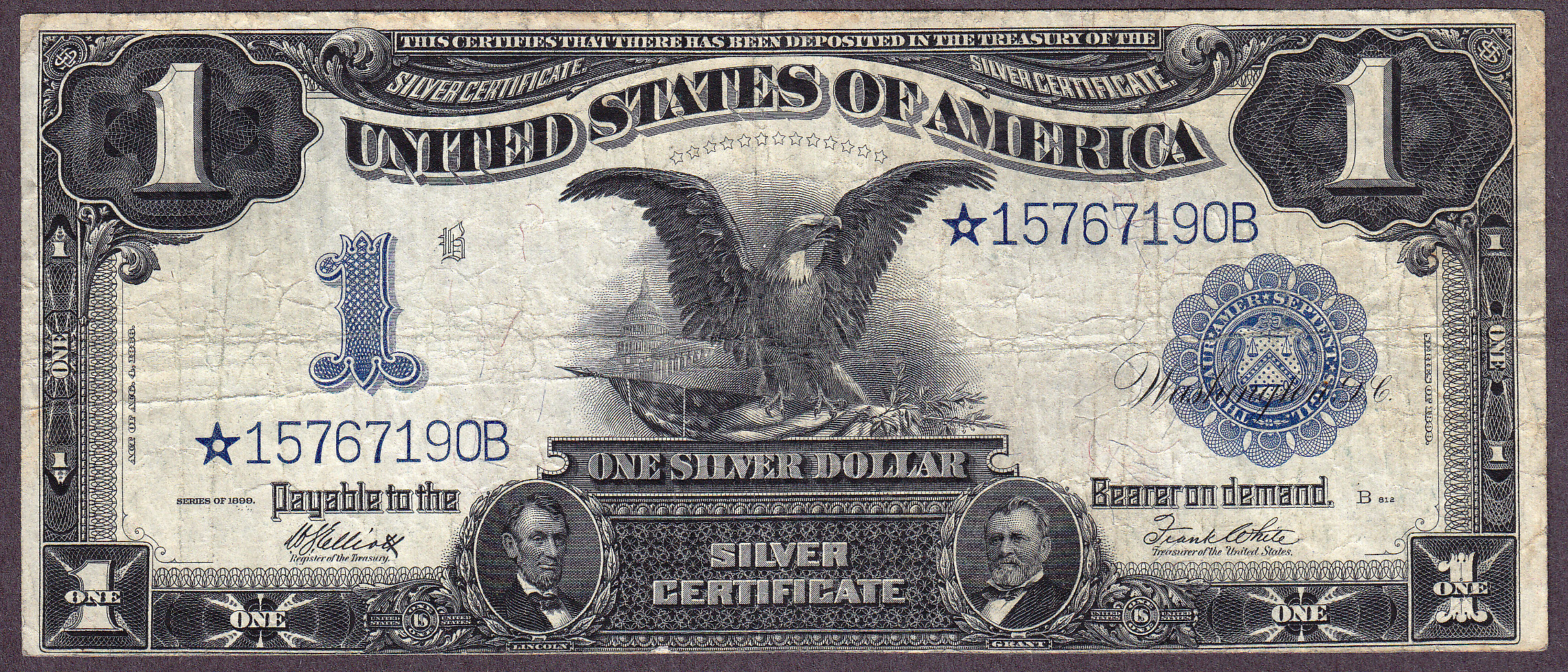 This is one of the key star notes in the 1899 Black Eagle Silver Certificate Star Collection. This is a Fr.-235* star note. The serial number is *15767190B. This is a solid VF Star Note with no rips, tears, bank stamps, missing pieces or pinholes. In the US Paper Money of the US by Authur L. Friedberg, 18th edition this star list for $650 in VF. This is the only Fr.-235* I have.