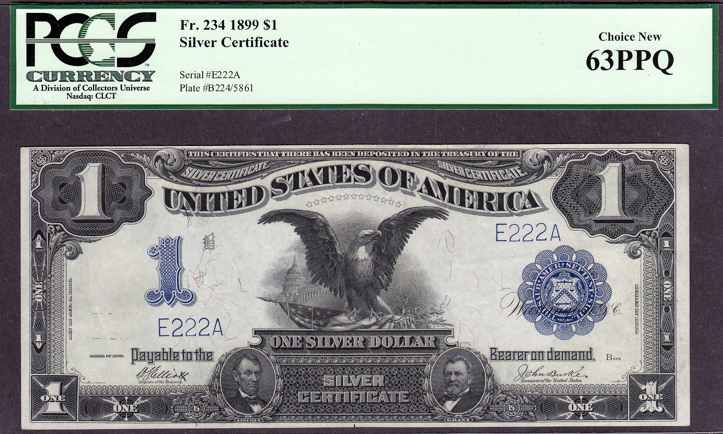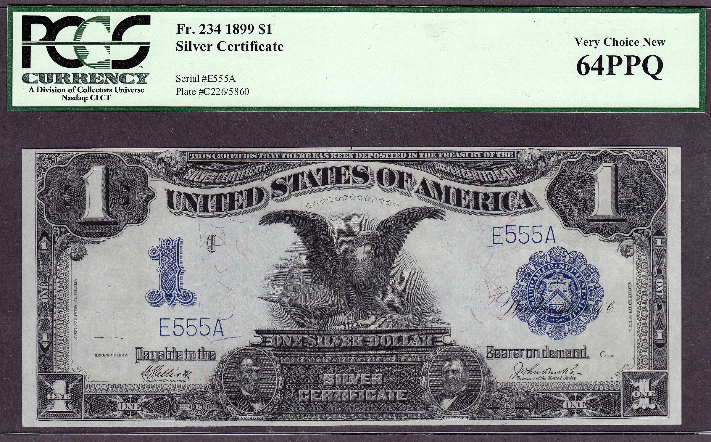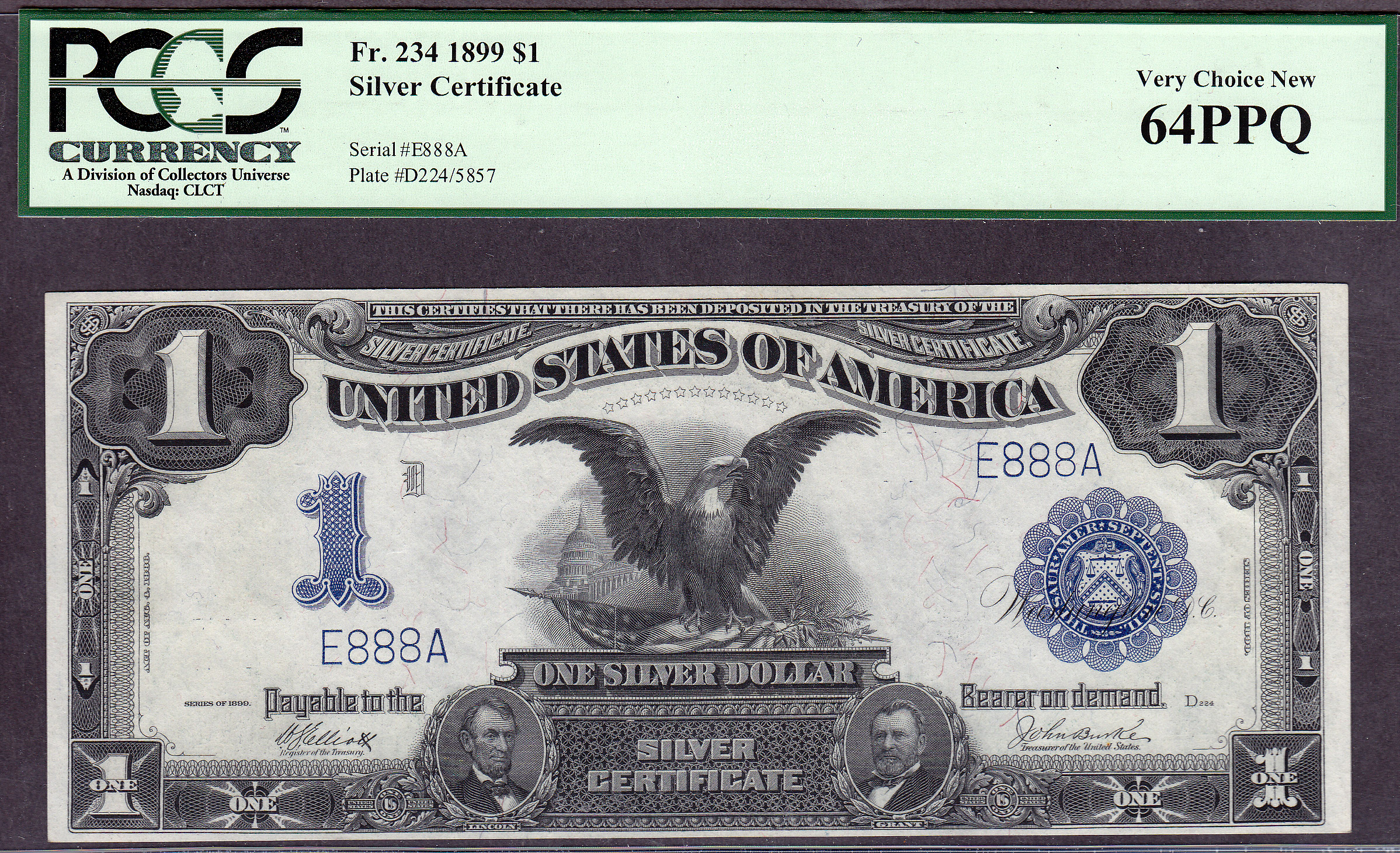 This is a neat set of eight consecutive serialized numbered Fr.-234 Black Eagles. The serial numbers are E111A to E888A. When you go to view this note, all eight of the Black Eagles will be displayed for your viewing. This set of Black Eagles are from the famous "Zollie Kelman" Black Eagle Collection that I purchased from Harry Jones at the Memphis Show in 2005. The Zollie Kelman Collection consisted of 86 Black Eagles that come in various serialized sets. These Presentation Notes were generally issued to Heads of State or Foreign Dignitaries as gifts by the US Treasury Department on behalf of the United States government. These Black eagles were never released to the general public for circulation. Zollie Kelman was the 3rd owner of this Black Eagle collection and now Jhon E Cash is the fourth owner. These are very special serialized sets and I will not break them up. You will find additional sets of these notes through the website, go view them as they are impressive. Thanks and enjoy them...as I have for so many years. Jhon E Cash