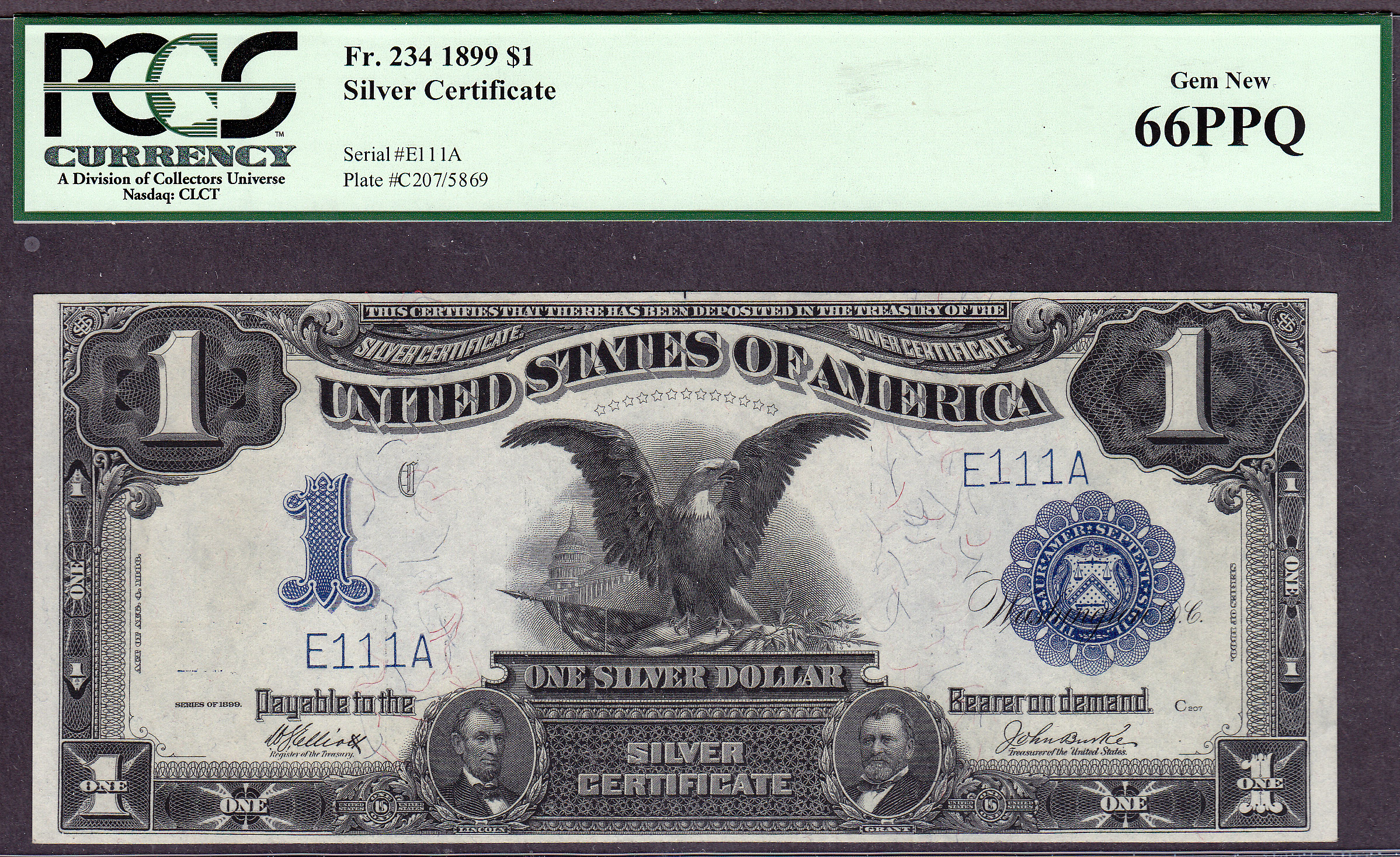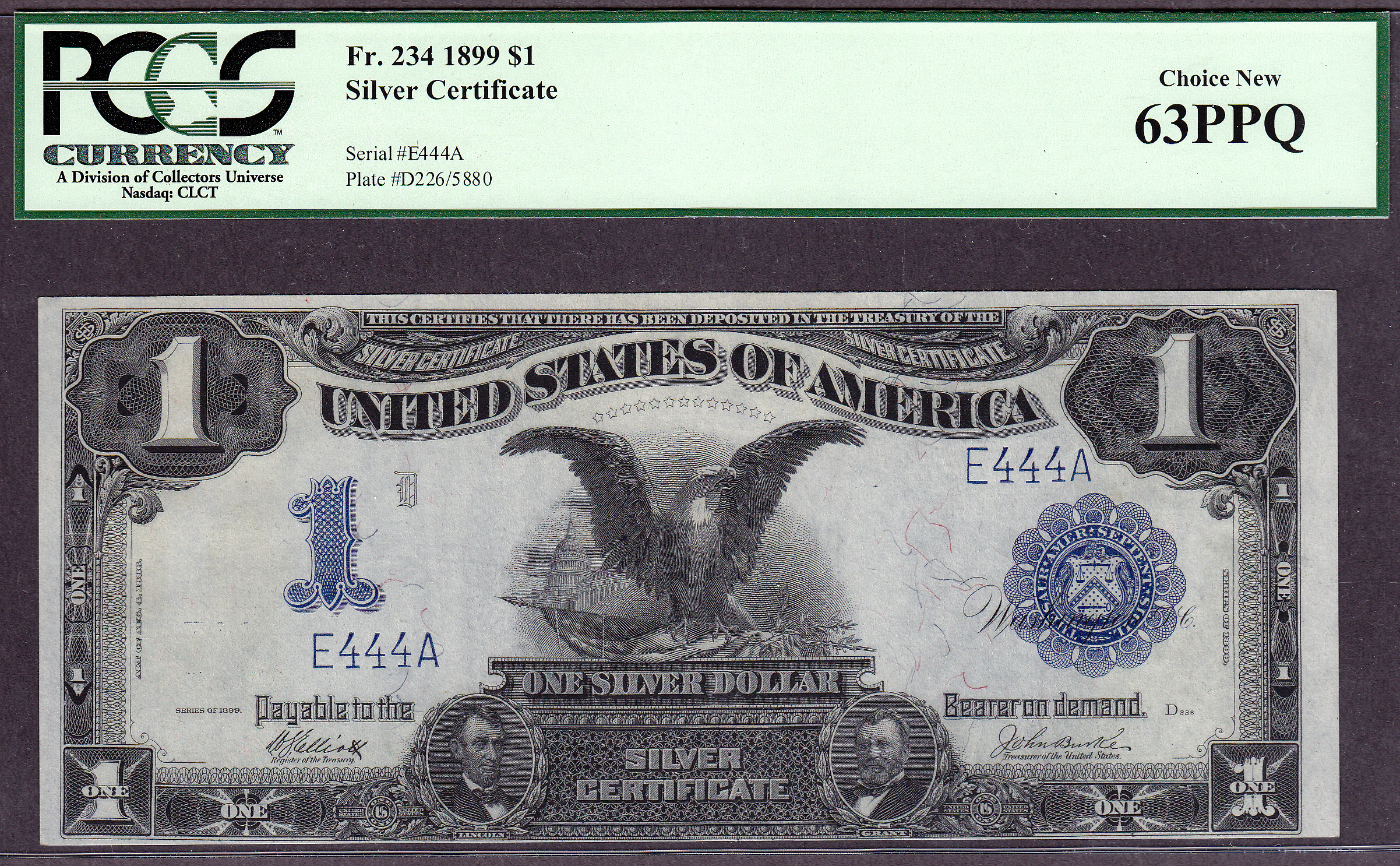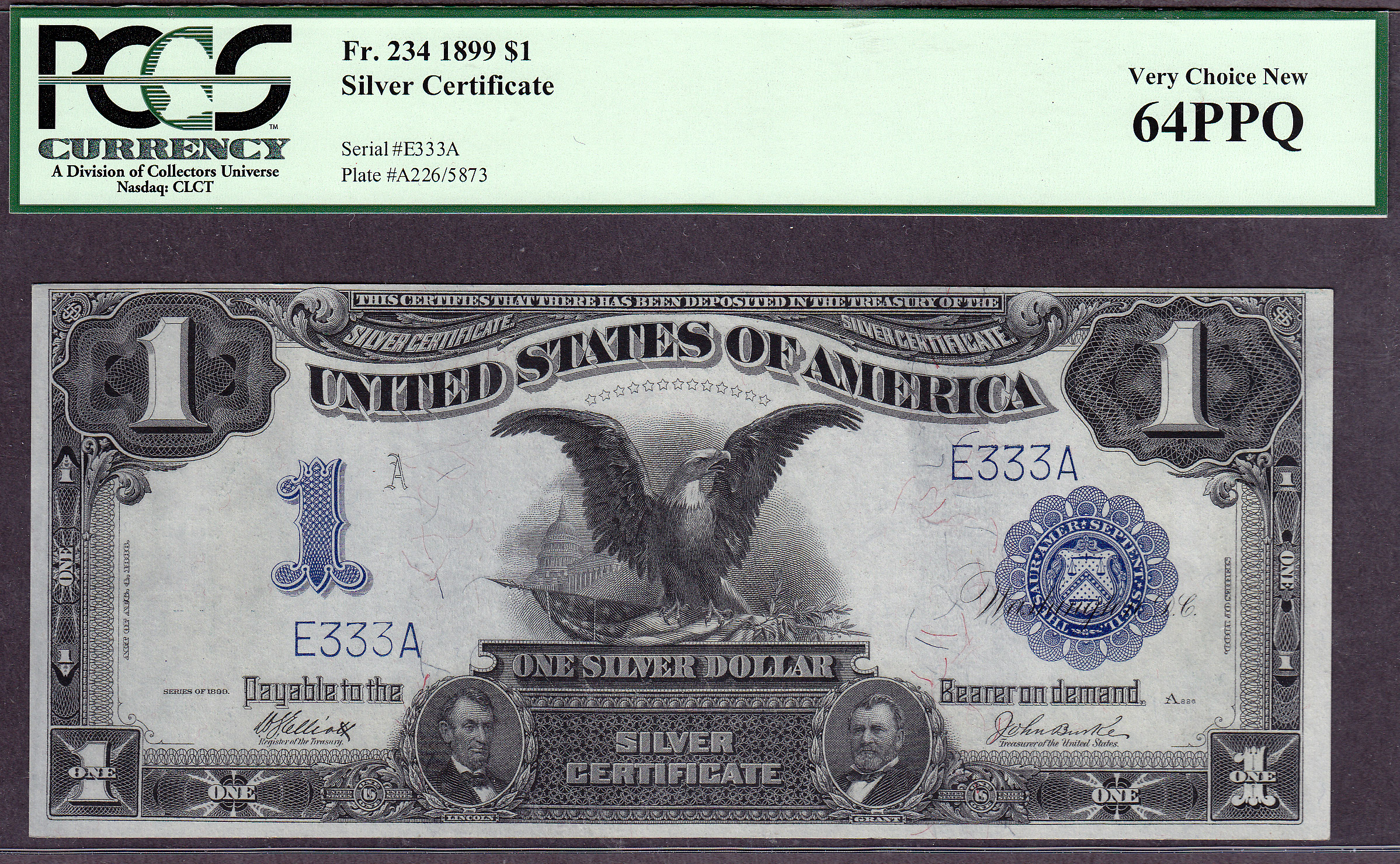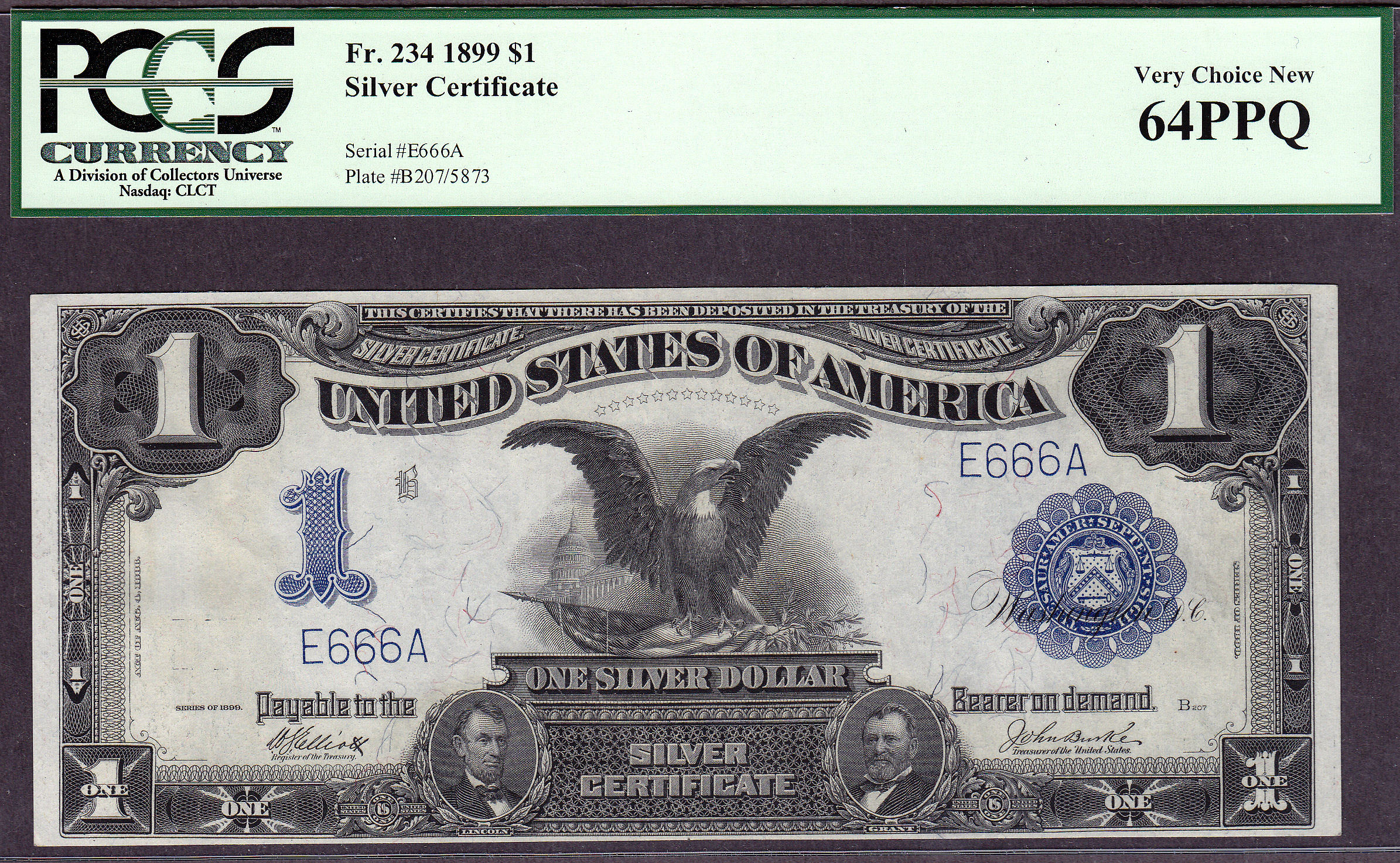 This is a neat set of eight consecutive serialized numbered Fr.-234 Black Eagles. The serial numbers are E111A to E888A. When you go to view this note, all eight of the Black Eagles will be displayed for your viewing. This set of Black Eagles are from the famous "Zollie Kelman" Black Eagle Collection that I purchased from Harry Jones at the Memphis Show in 2005. The Zollie Kelman Collection consisted of 86 Black Eagles that come in various serialized sets. These Presentation Notes were generally issued to Heads of State or Foreign Dignitaries as gifts by the US Treasury Department on behalf of the United States government. These Black eagles were never released to the general public for circulation. Zollie Kelman was the 3rd owner of this Black Eagle collection and now Jhon E Cash is the fourth owner. These are very special serialized sets and I will not break them up. You will find additional sets of these notes through the website, go view them as they are impressive. Thanks and enjoy them...as I have for so many years. Jhon E Cash
