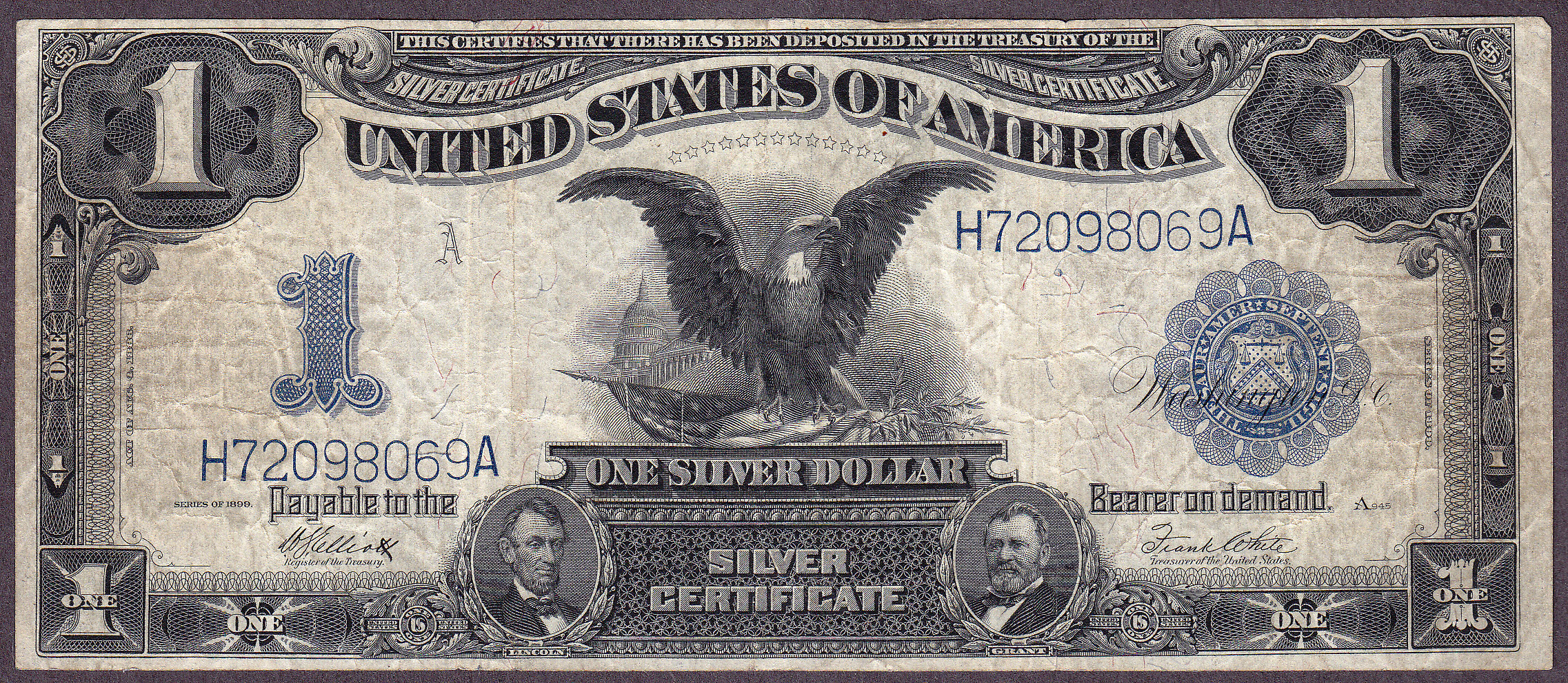This is one of only seven known 1899 $1 Black Eagles from the Fr-235 number. It has a Inverted Face as you can see on the scans. Although circulated, it has not pinholes or tears. A nice example for the error type collector.