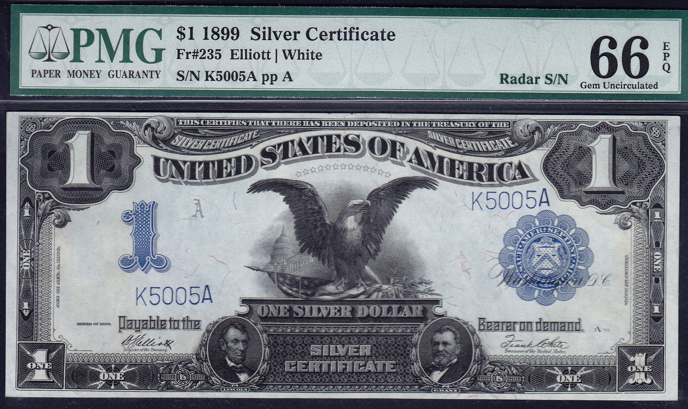 Fr.-235 1899 $1 Black Eagle PMG-66EPQ RADAR Serial # K5005A