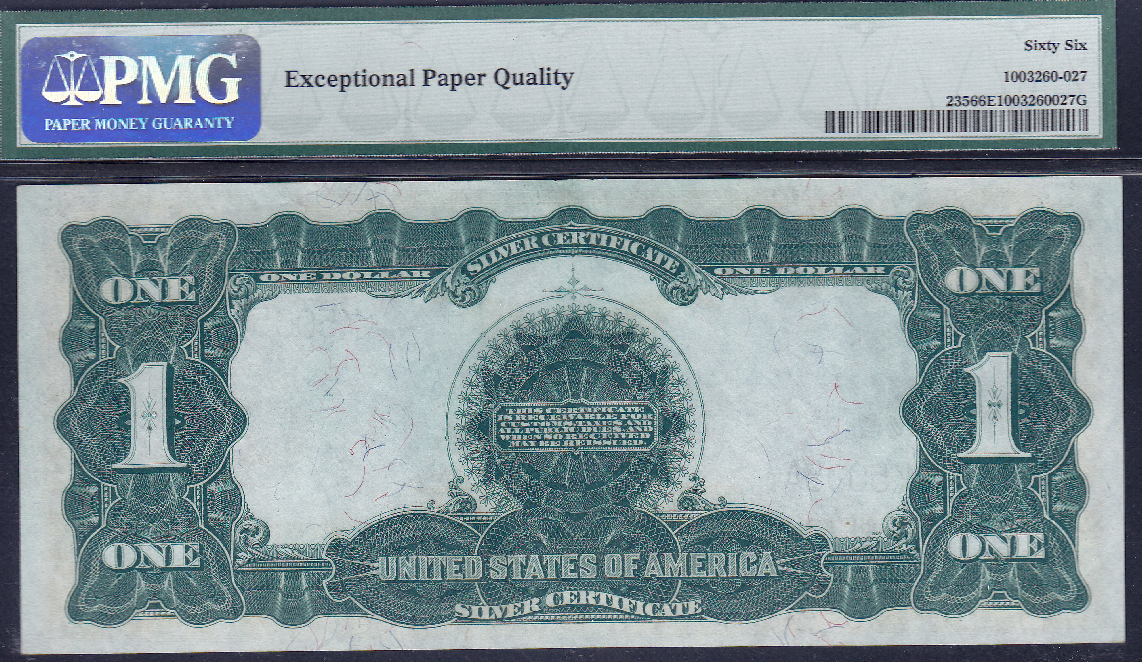 WHAT CAN YOU SAY? This is one of 5 1899 $1 Black Eagle RADARS that are being listed. They were originally known as "Presentation Notes". I acquired the set of 5 notes in June of 2003 in a private sale. None of the 5 notes have ever been circulated or offered for sale in auction or public. They all have been in private hands since the day they were printed and then Presented. I have never seen or found anywhere a 4-dight radar on a Black Eagle in GEM condition in any auction or dealers table or anyones website. These 5 1899 $1 Black Eagles RADARS have been in my private collection and now its time for someone else to enjoy them as much as I have over the past years.