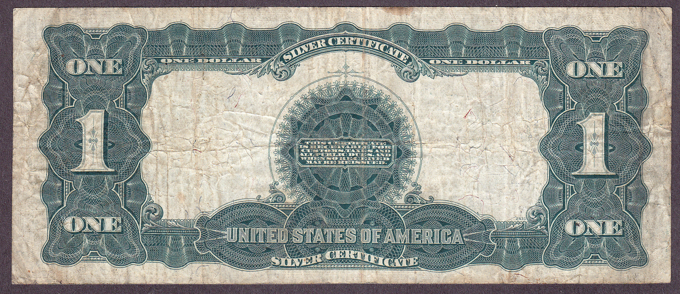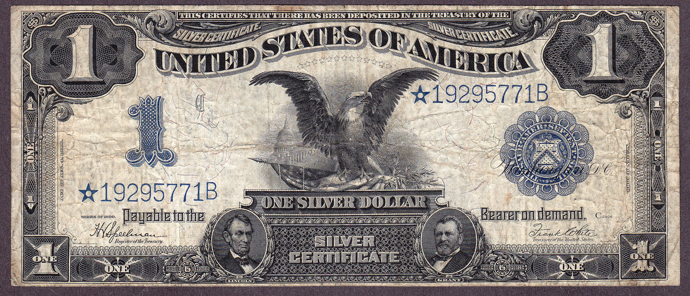 This is an 1899 $1 Large Size Silver Certificate star note. This note is commonly referred to as the Black Eagle because of the front design. It is one of the more popular designs of large size notes. The serial number is *19295771B. Although it is circulated I do not see any pinholes, rips or tears. This would make a nice type large size star note for your collection and it will not set you back a bundle.