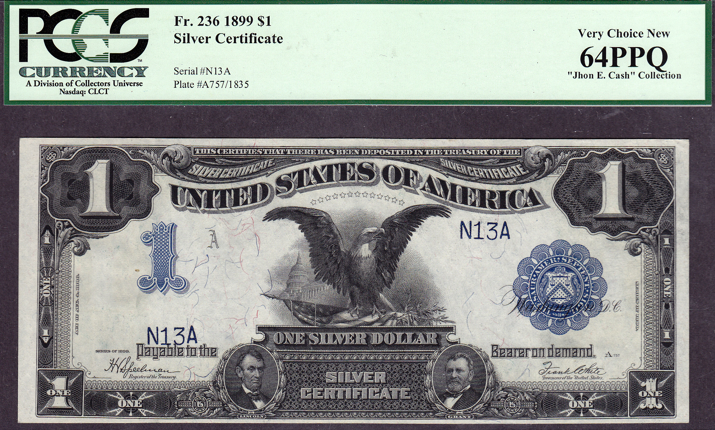 This 1899 $1 Black Eagle Silver Cert. Ser # "N13A" is a superb note. The lucky # "13" is a famous lucky charm for many countries. It WAS graded by the toughest grading company in the business, as a CGC-65. It is now graded as a PCGS-64PPQ. I cant understand why it did not get a "65PPQ" grade from PCGS. Its all there.