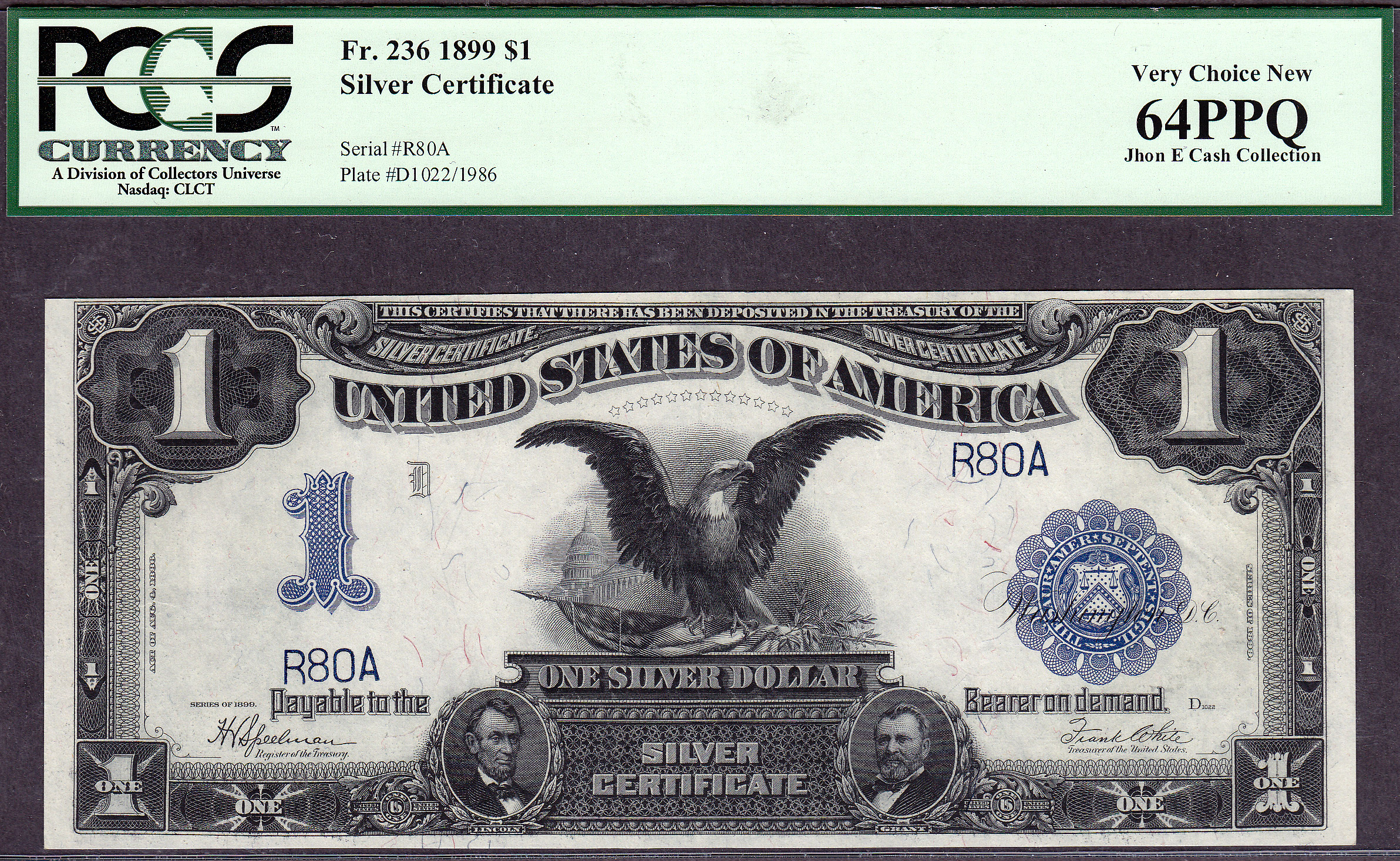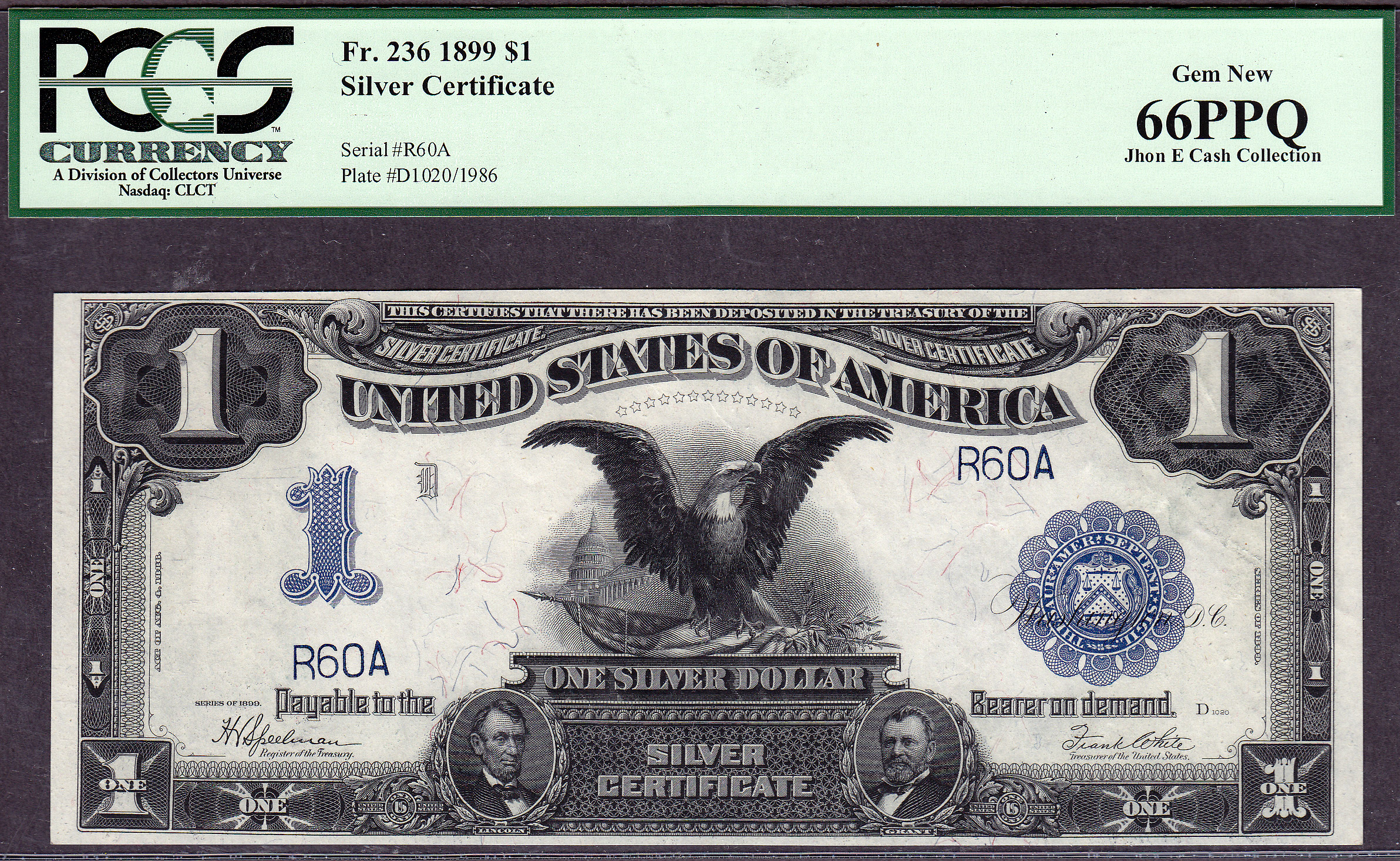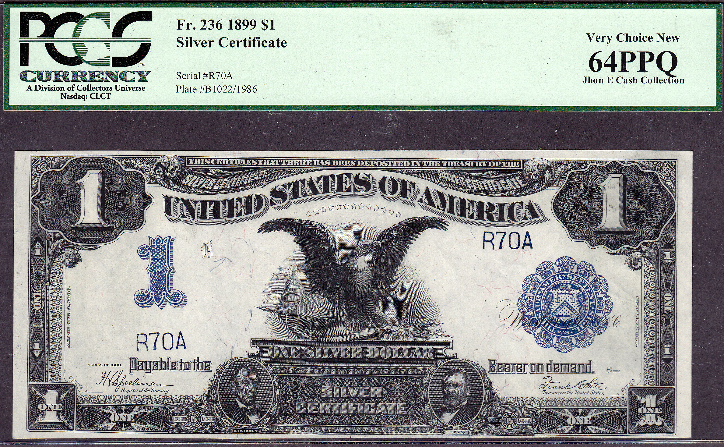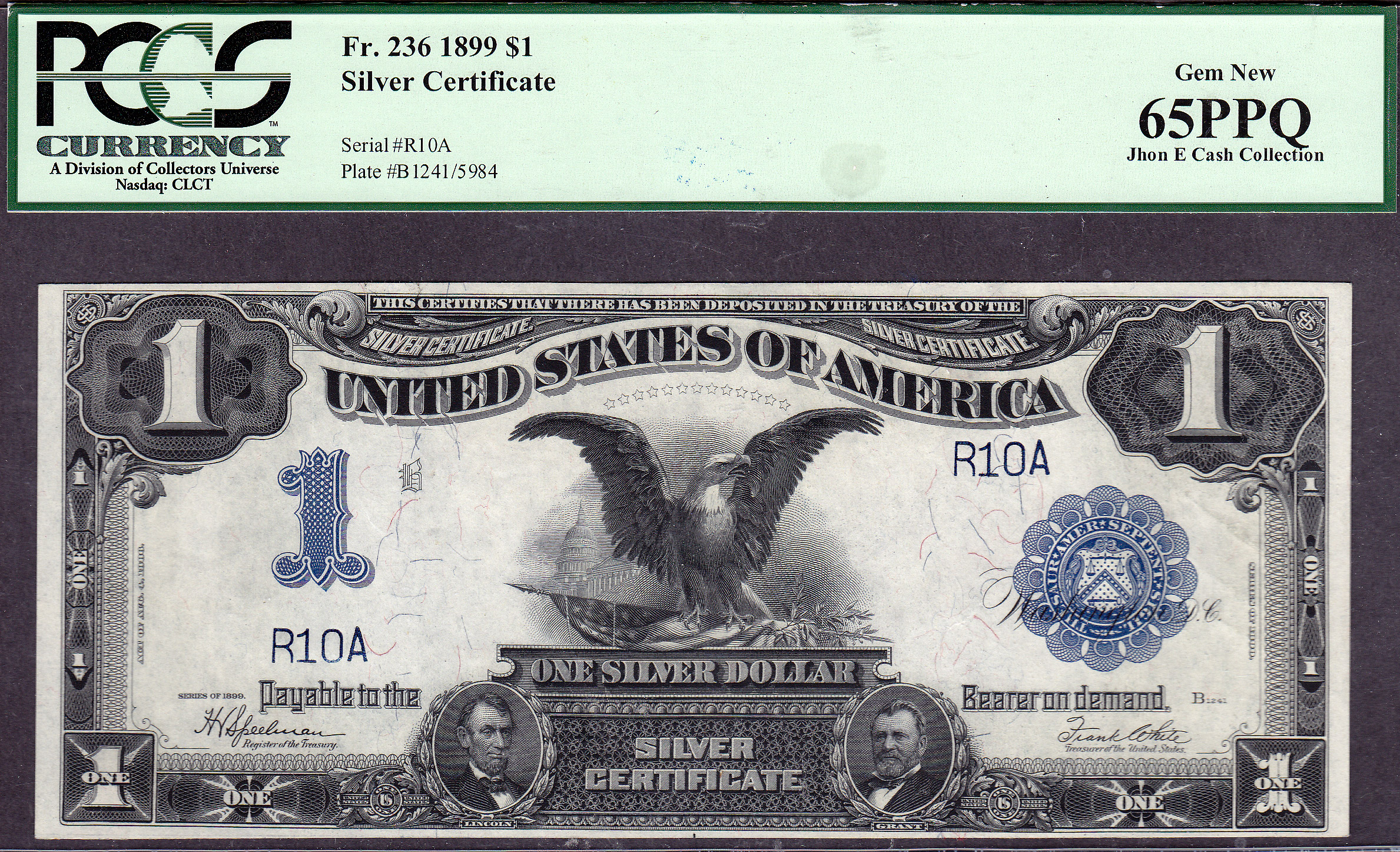 You gotta see this "Presentation Set" of 10 Black Eagle Silver Certificates. The serial numbers are R10A to R100A. They are all graded from GEM PCGS-63PPQ to 66PPQ. This 10-piece set is part of the famous "Zollie Kelman" Black Eagle Collection. This is a neat set of ten consecutive serialized numbered Fr.-236 Black Eagles. The serial numbers are R10A to R100A When you go to view this note, all ten of the Black Eagles will be displayed for your viewing. This set of Black Eagles are from the famous "Zollie Kelman" Black Eagle Collection that I purchased from Harry Jones at the Memphis Show in 2005. The Zollie Kelman Collection consisted of 86 Black Eagles that come in various serialized sets. These Presentation Notes were generally issued to Heads of State or Foreign Dignitaries as gifts by the US Treasury Department on behalf of the United States government. These Black eagles were never released to the general public for circulation. Zollie Kelman was the 3rd owner of this Black Eagle collection and now Jhon E Cash is the fourth owner. These are very special serialized sets and I will not break them up. You will find additional sets of these notes through the website, go view them as they are impressive. Thanks and enjoy them...as I have for so many years. Jhon E Cash