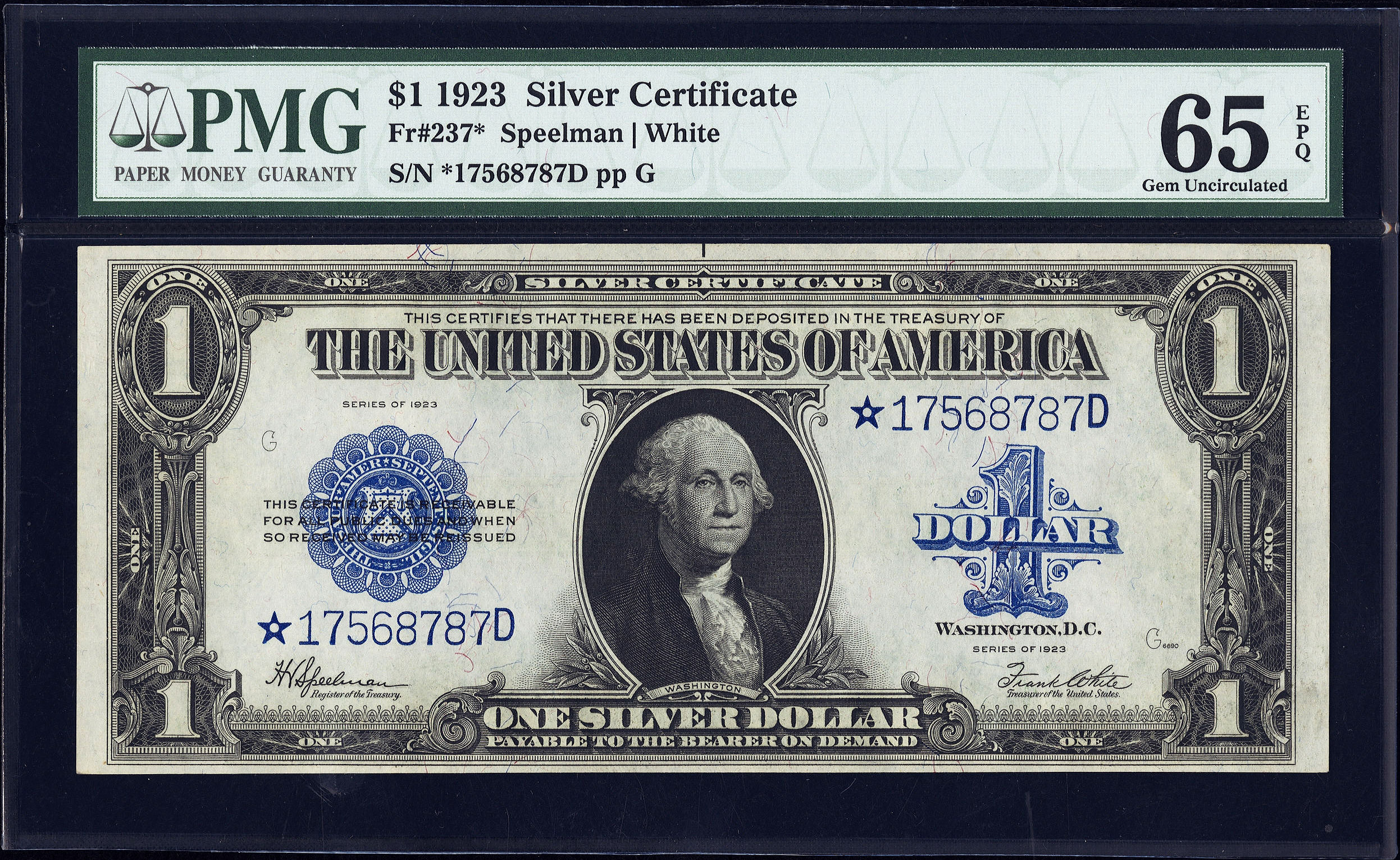 This is one outstanding 1923 $1 Legal Tender Star note housed in a PMG GEM 65EPQ holder. It is not often you find large size stars in GEM Uncirculated condition. The most intricate details of the overprint are fully embossed and easily viewed from the back. A pleasing star that is available, but far less so in grades of GEM or higher. The serial number is *17568787D and it totally rocks! This star note is headed for a high end star collection. Price just reduced for a quick sale.