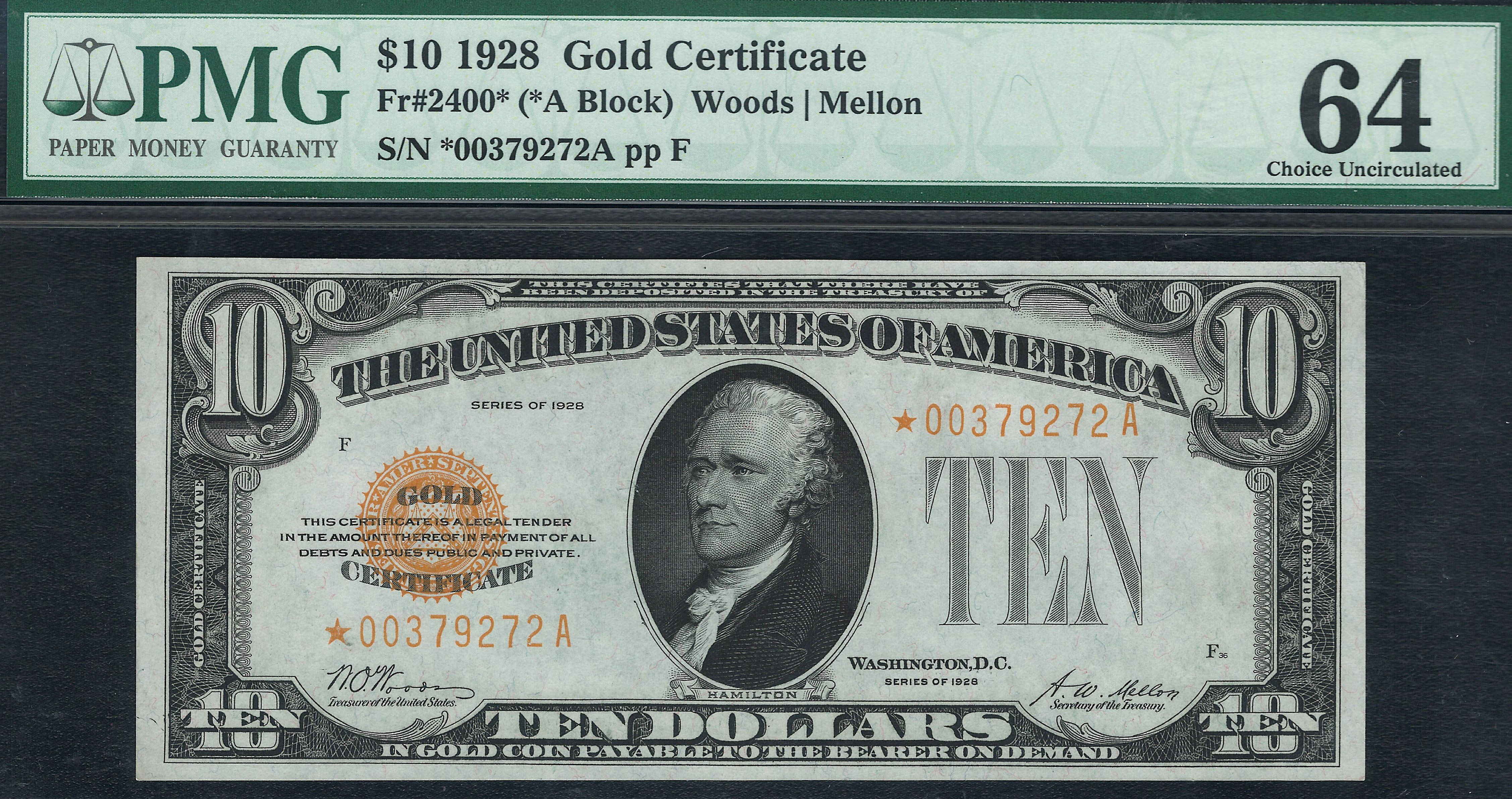 This is a Fr.-2400*, a 1928 $10 Gold Certificate STAR. As a major star collector myself, this is the highest graded $10 Gold Certificate star I have ever owned and I have owned quite a few of them. It is near perfect as the margins are right on and the color is brilliant and vivid. When i saw this note I had to own it! If you are a star collector, especially gold certificates, then this is a must have note for your collection.