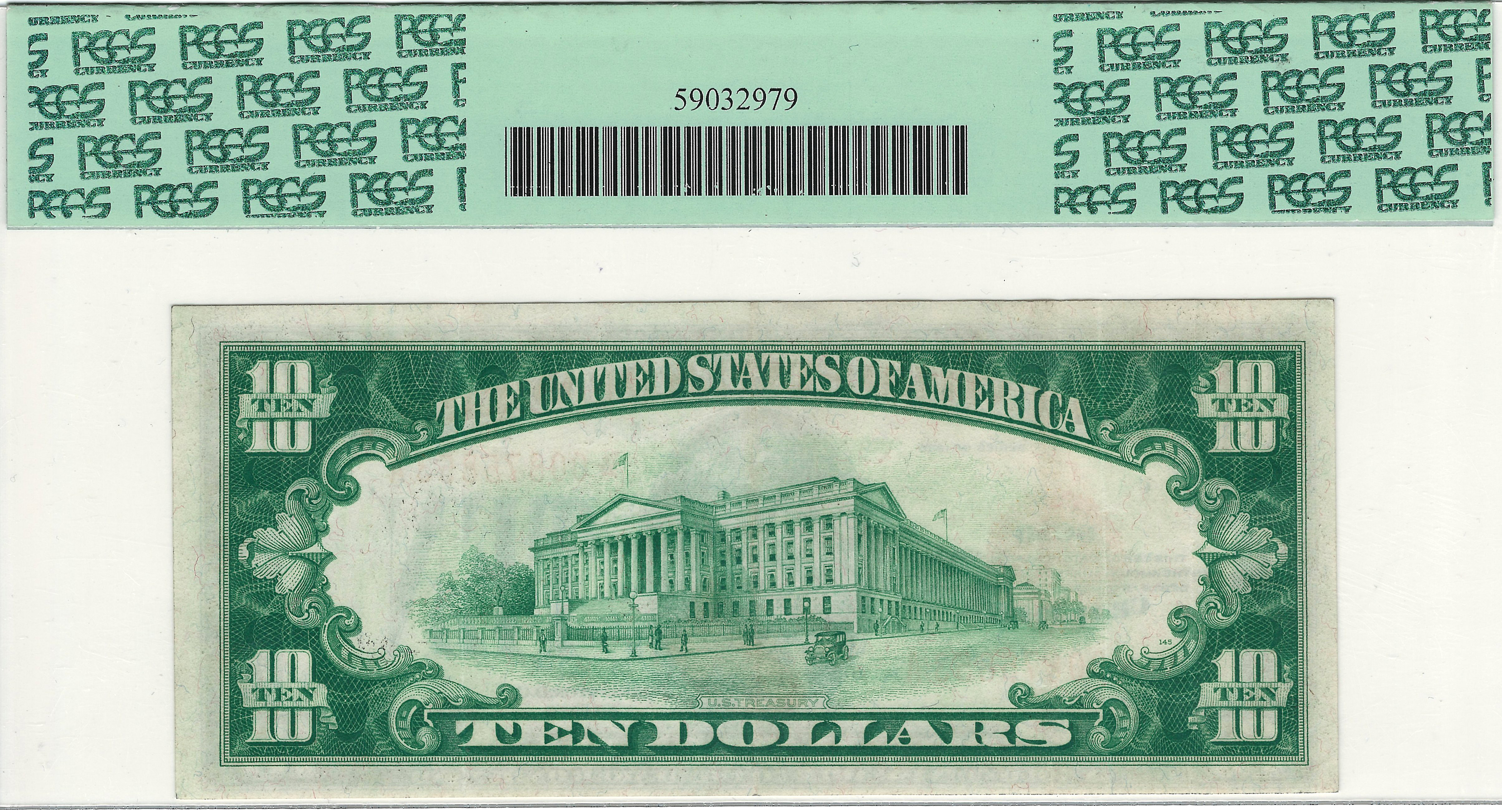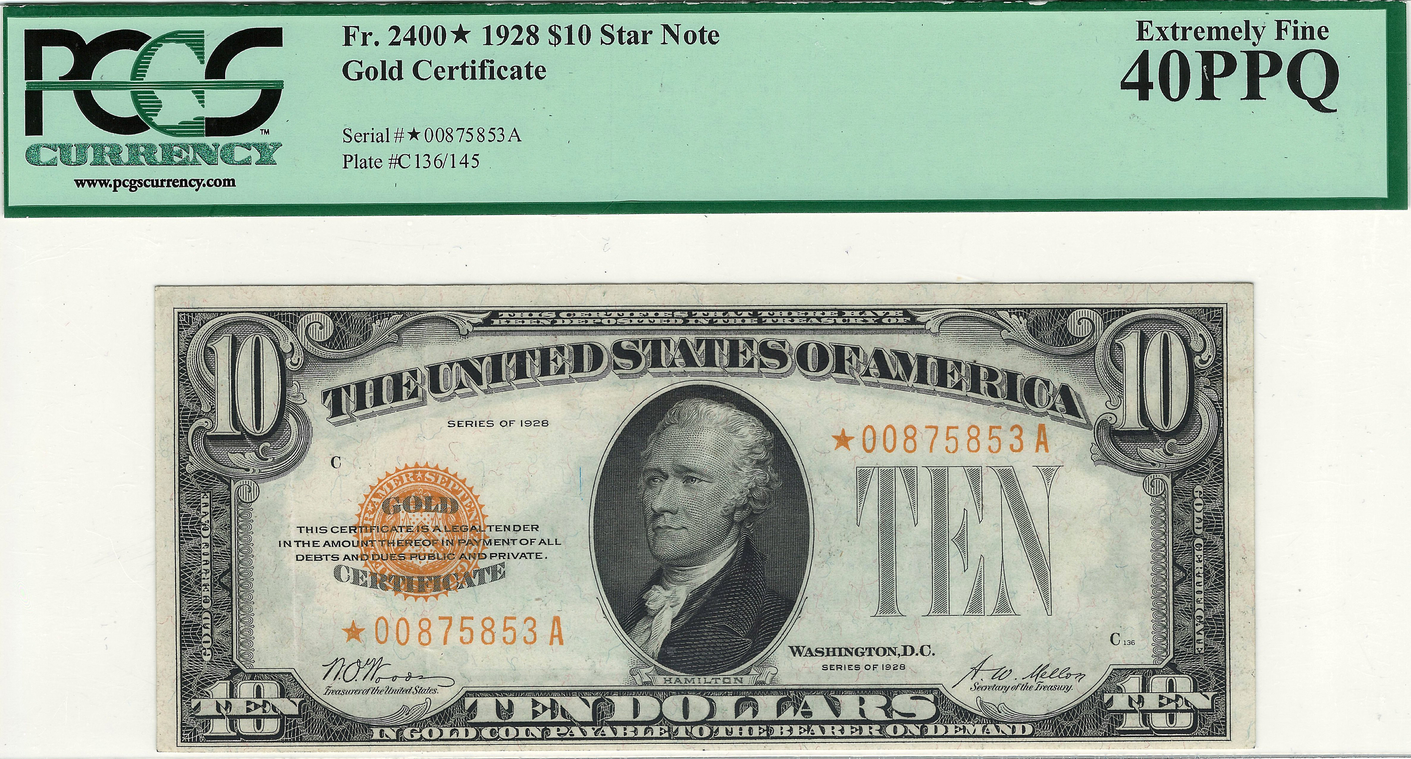 This is a very nice example of a 1928 $10 Star note in a PCGS-40PPQ holder. What make this star note so special is that is totally original, never cleaned or pressed. So many of the small size gold certificates have been cleaned and pressed. There are NO rips, tears, pinholes or markings of any type. You can still see the embossing from the serial numbers on the back. The inks have retained its vivid gold color and there are no heavy folds. You will not find a better Extra Fine gold certificate star note anywhere with a PPQ designation. It is definitely priced to sell. The serial number is *00875853A.