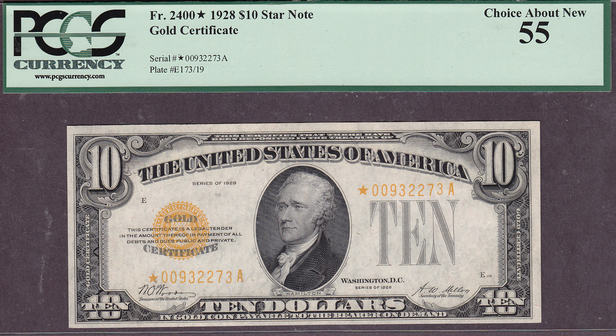 Fr.-2400 1928 $10 Gold Certificate Star Note Ser. 00932273A PCGS AU55