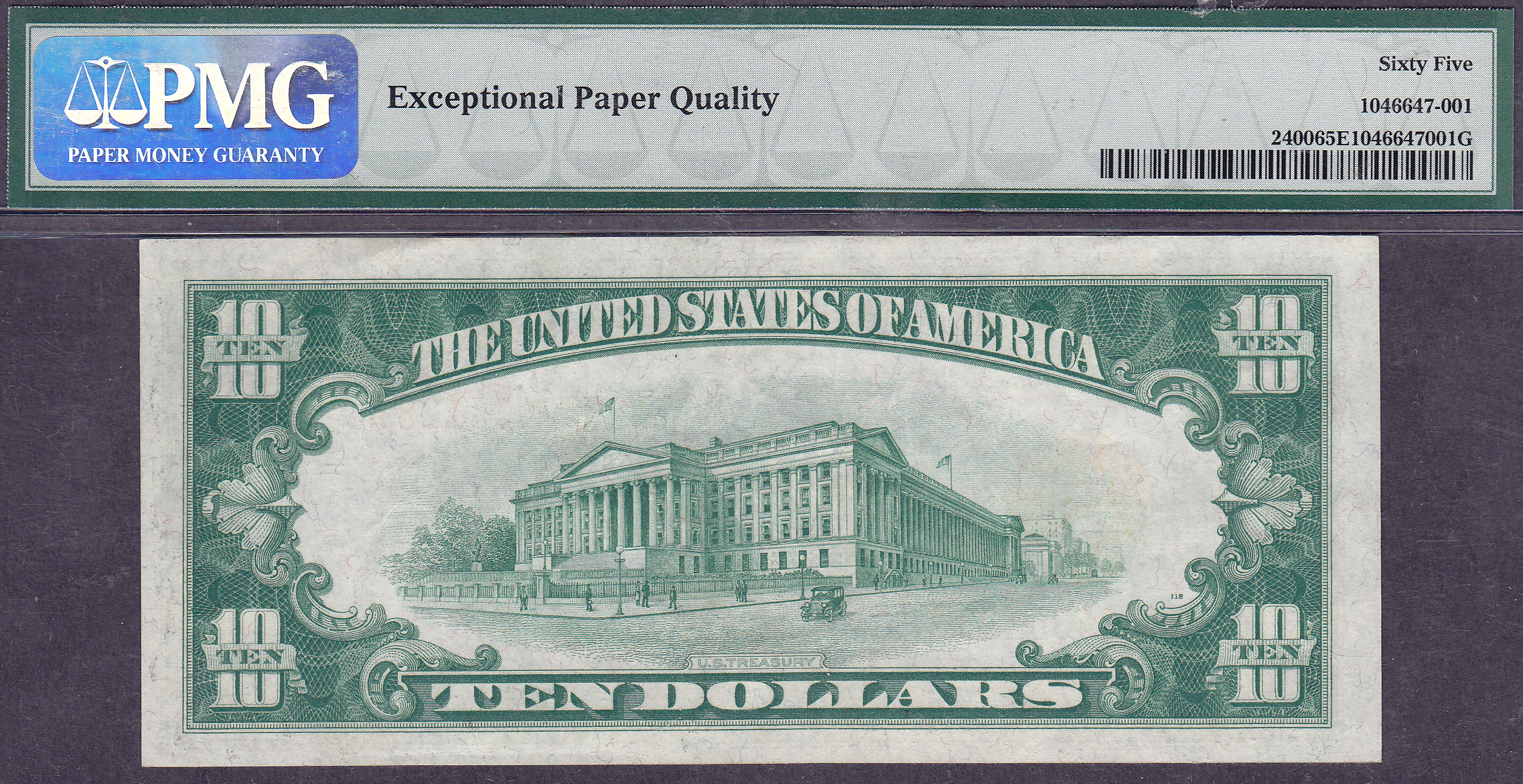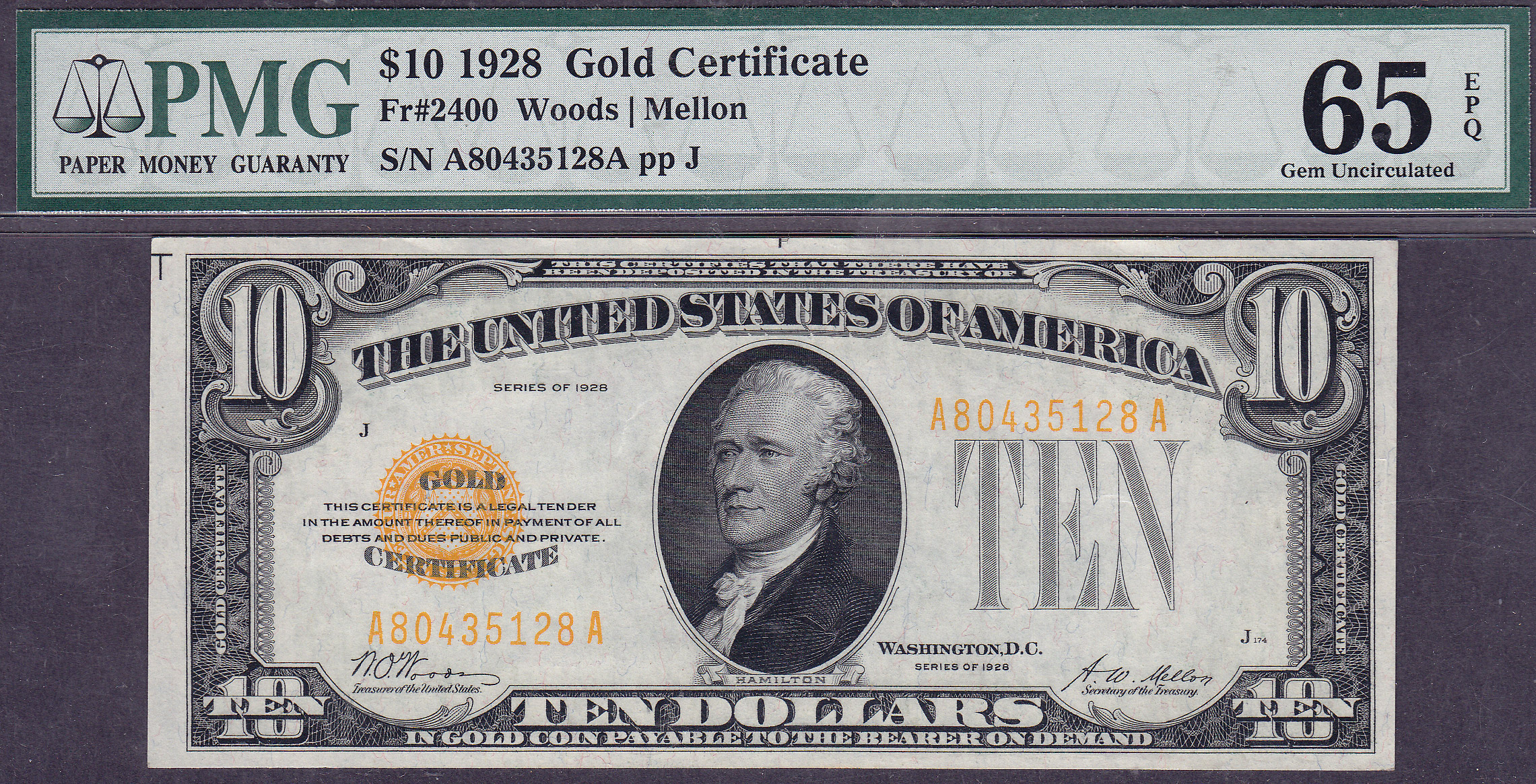 Here you have the perfect 1928 $10 Gold Certificate in a GEM PMG-65EPQ holder. The serial number is A80435128A. When you come across a note like this there is not a lot you can say about it that the large scans will tell you. It is all there with all the attributes that a GEM note would have. The serial numbeer of the GEM note is A80435128A. This would make a very nice addition to that one person who desires to acquire one of the finest.