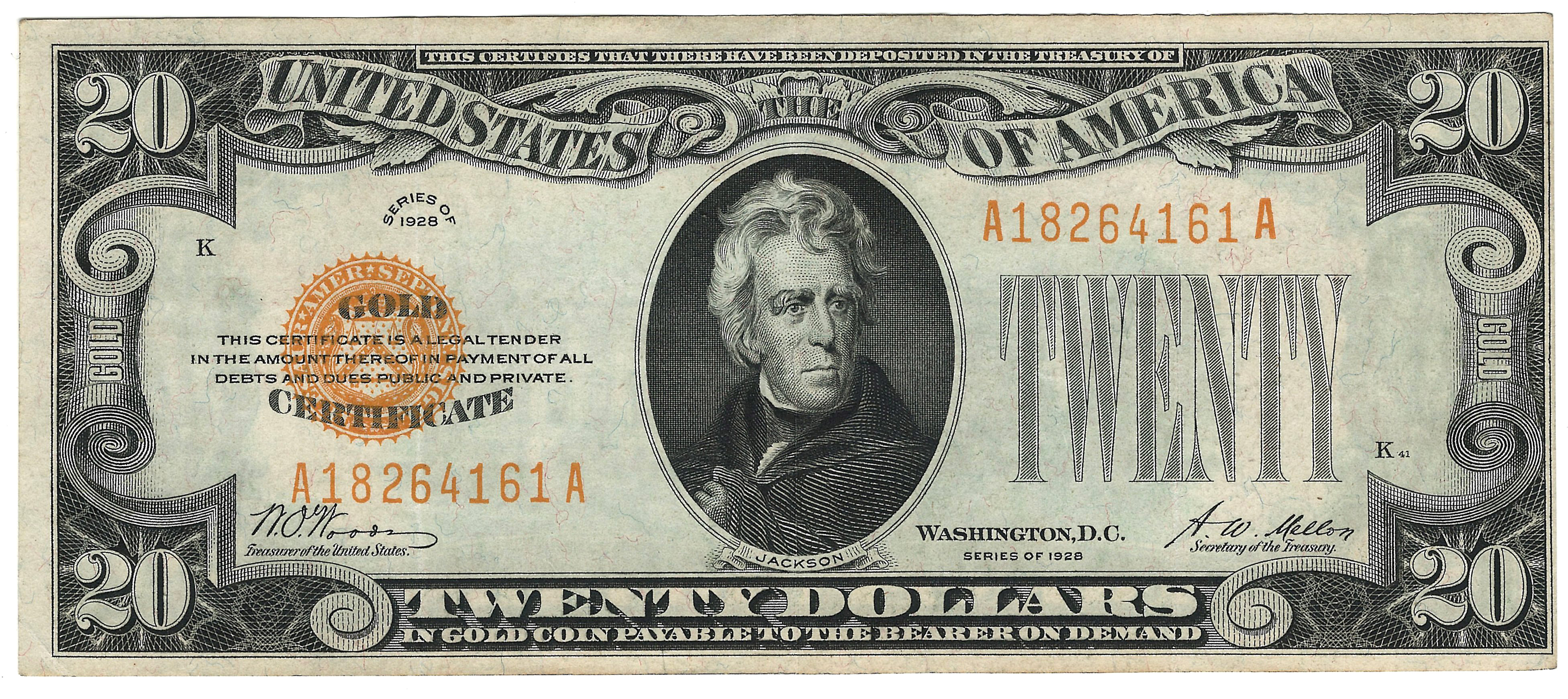I just picked this note up last week in Chicago. It is a nice 1928 $20 Gold Certificate in a solid VF/XF condition. The serial number is A18264161A. There are no rips, tears, pinholes or bank marks. It has NEVER been pressed or cleaned. It looks like someone folded this note and put it away in a book as there is no soil in the folds. The paper quality is original and firm. A very nice $20 Gold Certificate for the price.