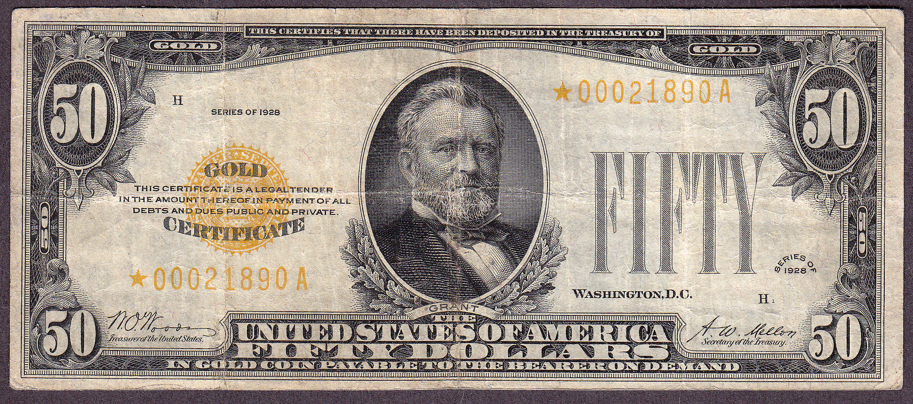 Have you ever seen a 1928 $50 Gold Certificate Star? Here is your chance to see one. These 1928 $50 and $100 gold certificate stars are just plain rare to find in any grade. I only come across them once in a great while. I purchase this 1928 $50 gold certificate along with a $100 Gold Certificate. There about 17-19 1928 $50 gold certificates know today. Most are in Vf to VG grade. This note is 100% original with no rips, tears, pinholes or tears. The serial number is *0021890A. Here is your chance to steal one. You may not see another one for years....in any grade.