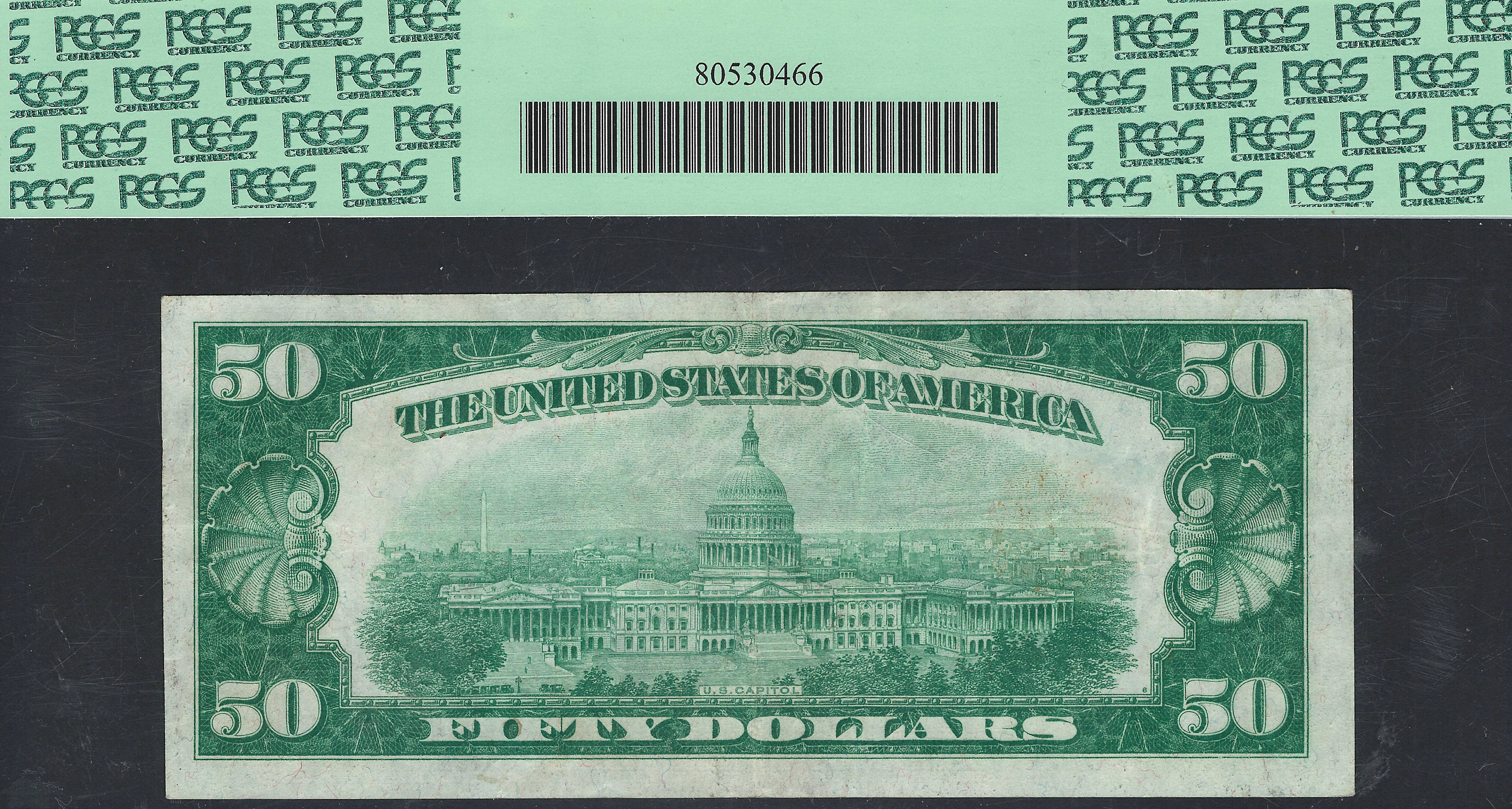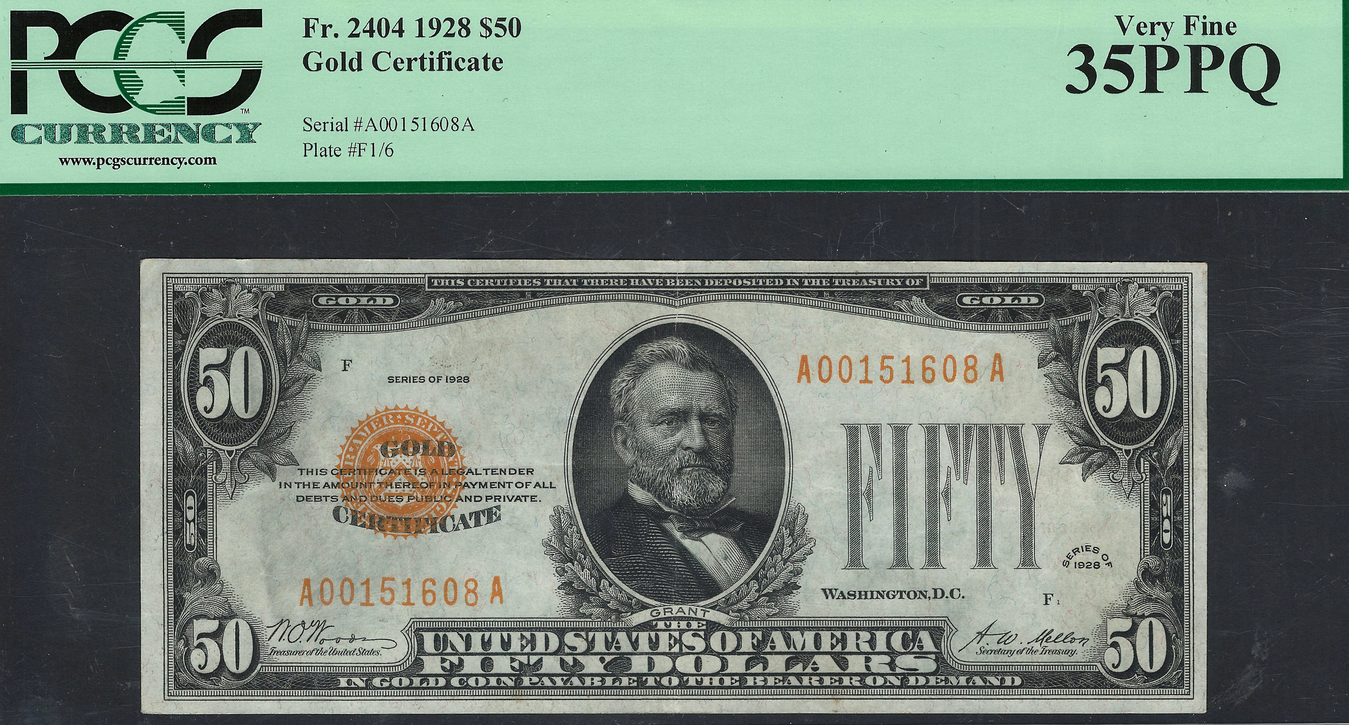 Here we have a very nice problem free 1928 $50 Gold Certificate in a PCGS-35PPQ holder. The serial number is A00151608A. This nice mid grade note faces up as a AU with nice margins and totally original. There are no rips, tears, pinholes or bank marks. It has never been pressed or cleaned. This is a very nice note for the type collector who does not want to spend big bucks for a higher grade.