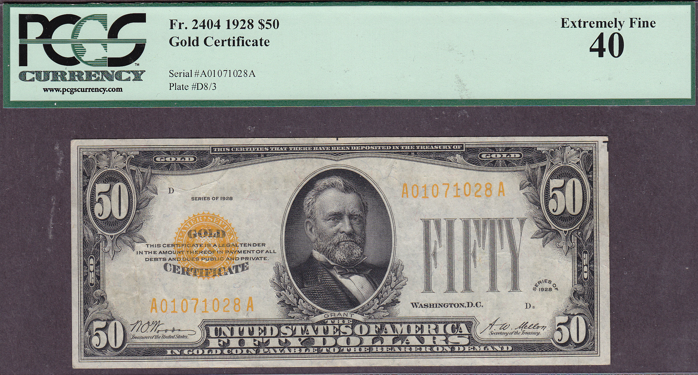 You won’t find a better deal on a 1928 $50 Gold certificate in this grade anywhere on the internet, period. I just picked up two of them and I will offer both of them at or below market prices. One is the PCGS-35PPQ holder and the other is in a PCGS-40 grade. This note has no rips, tears, pinholes of any other problems. Check out the large scans. It has been marked down for a quick sale. The serial number is A01071028A and it is in a PCGS-40 holder.