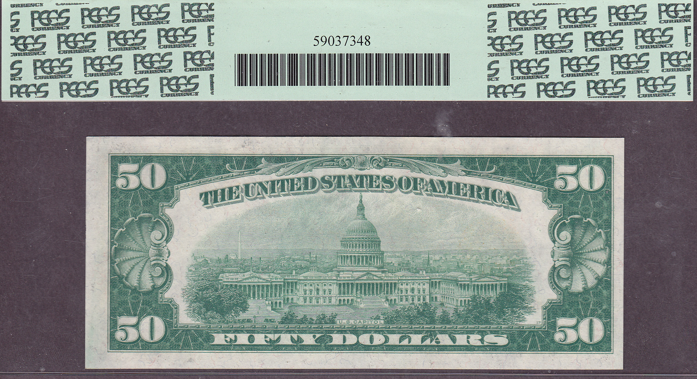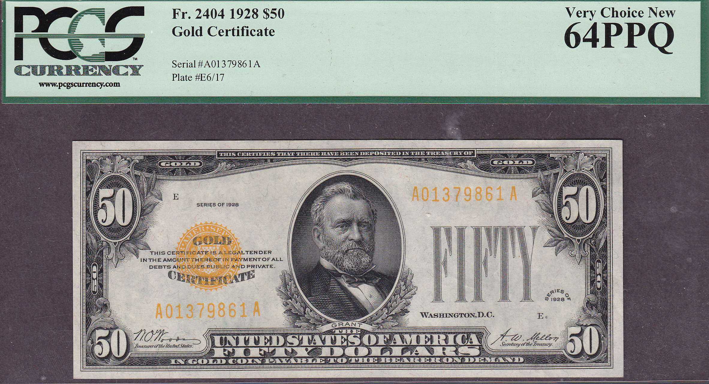 This is one of the nicest 1928 $50 Gold Certificates you will find anywhere that does not carry the big price tag. At first glance you think it is a GEM note but with close inspection you will notice the margins are a tad bit off from perfect. If you can live with that minor issue you have a damn nice near GEM. There is not one problem with this beauty such as pinholes, folds, bends, markings or anything else. You will notice the punch through embossing as you view it from the holder. The deep gold serial number is A01379861A and it is graded as a PCGS-64PPQ. This stunning gold certificate is totally original in every aspect. This will make a nice addition for someones gold certificate or type note collection.