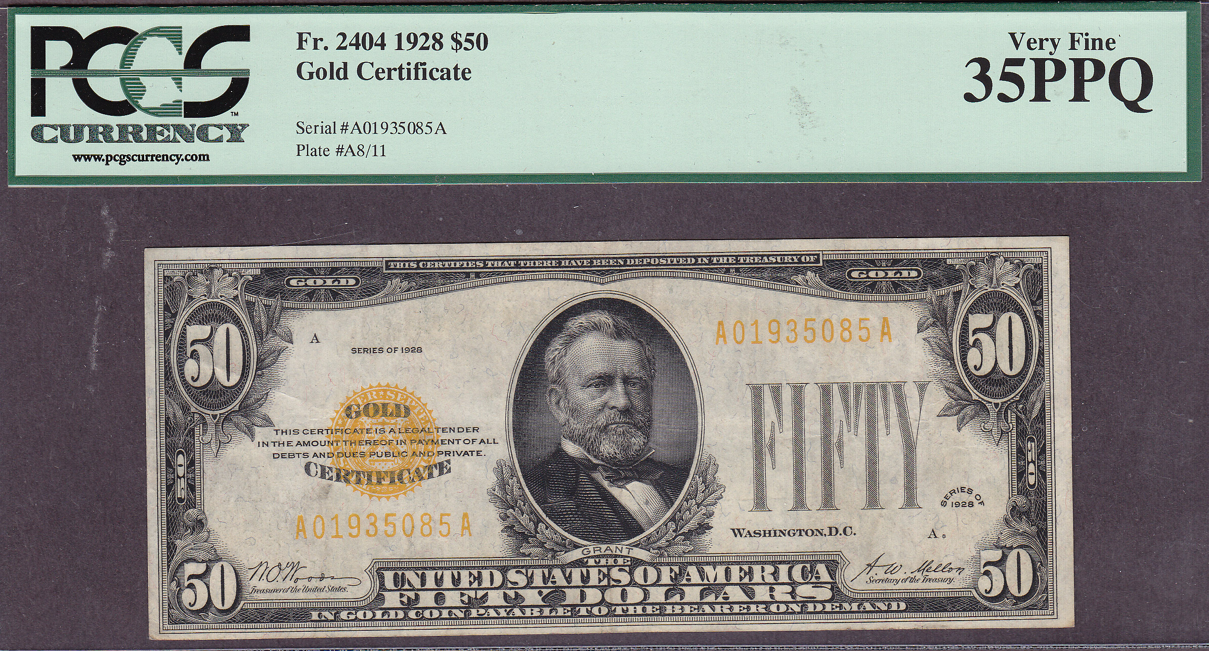 You won’t find a better deal on a 1928 $50 Gold certificate in this grade anywhere on the internet, period. I just picked up two of them and I will offer both of them at or below market prices. One is the PCGS-30PPQ and the other is in a PCGS-40 grade. This note has no rips, tears, pinholes of any other problems. It is totally original. Check out the large scans. It has been marked down for a quick sale. The serial number is A01935085A and it is in a PCGS-35PPQ holder.