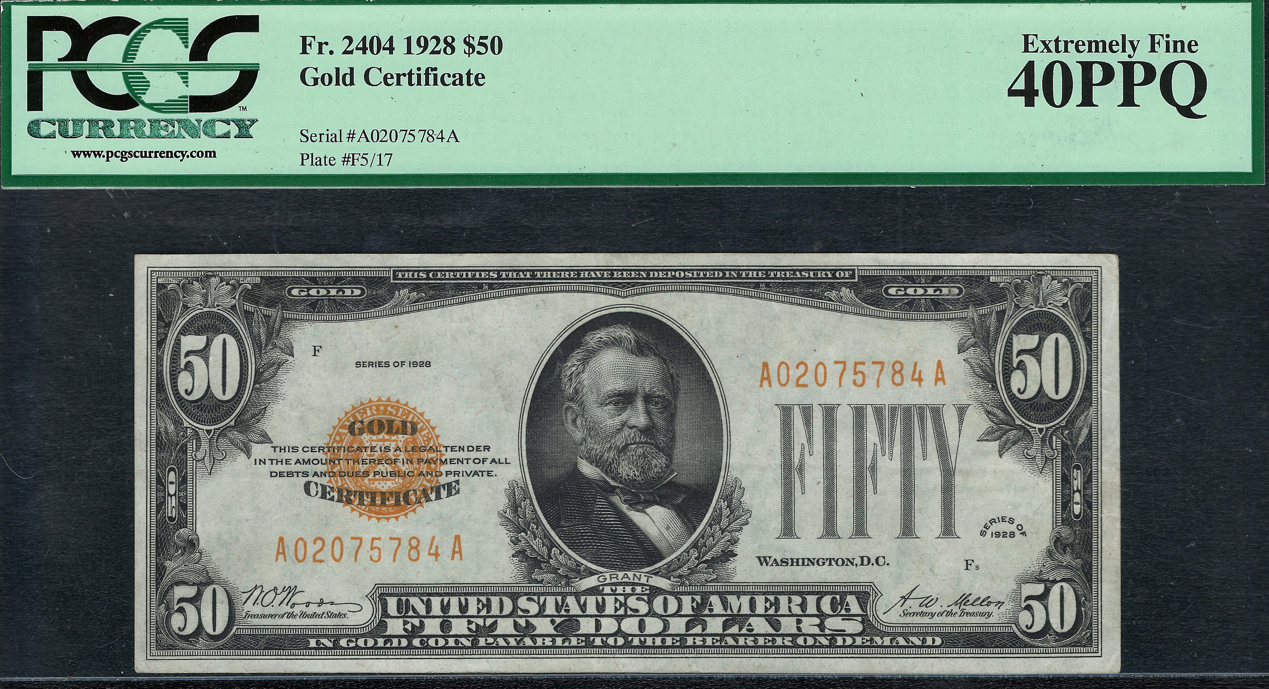 Fr.-2404 1928 $50 Gold Certificate Ser. A02075784A PCGS 40 PPQ
