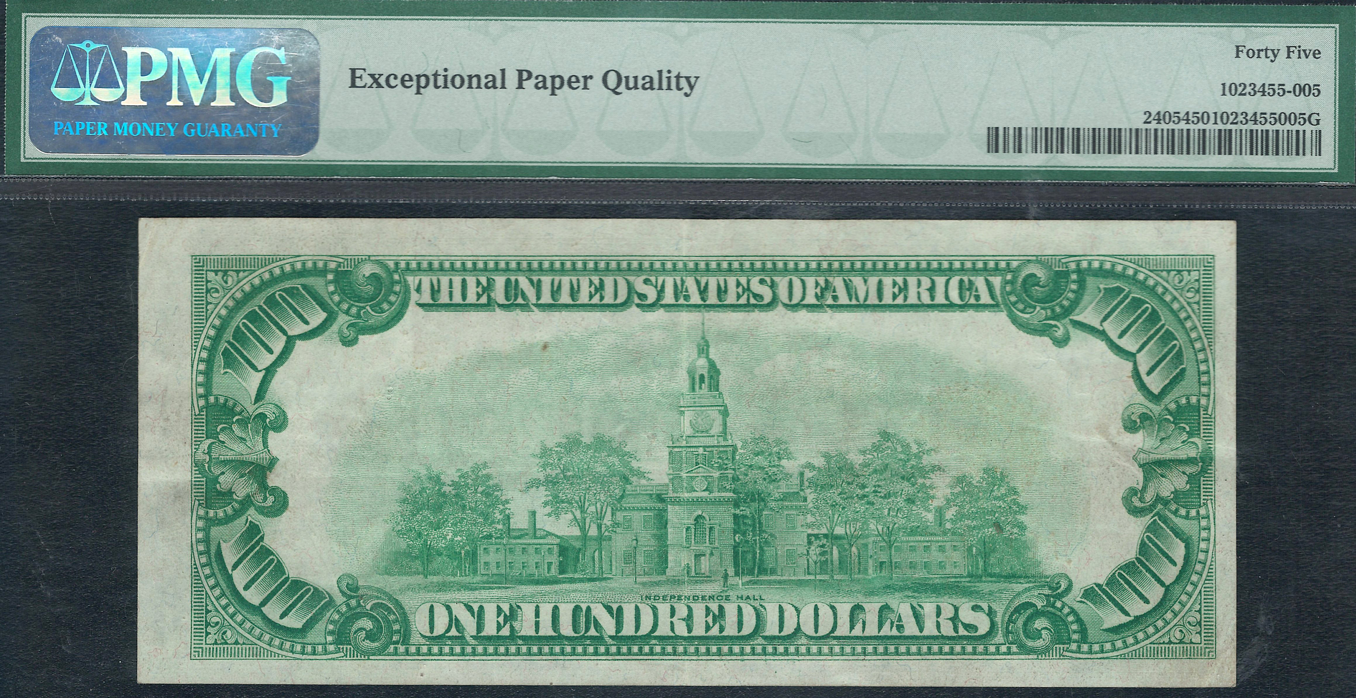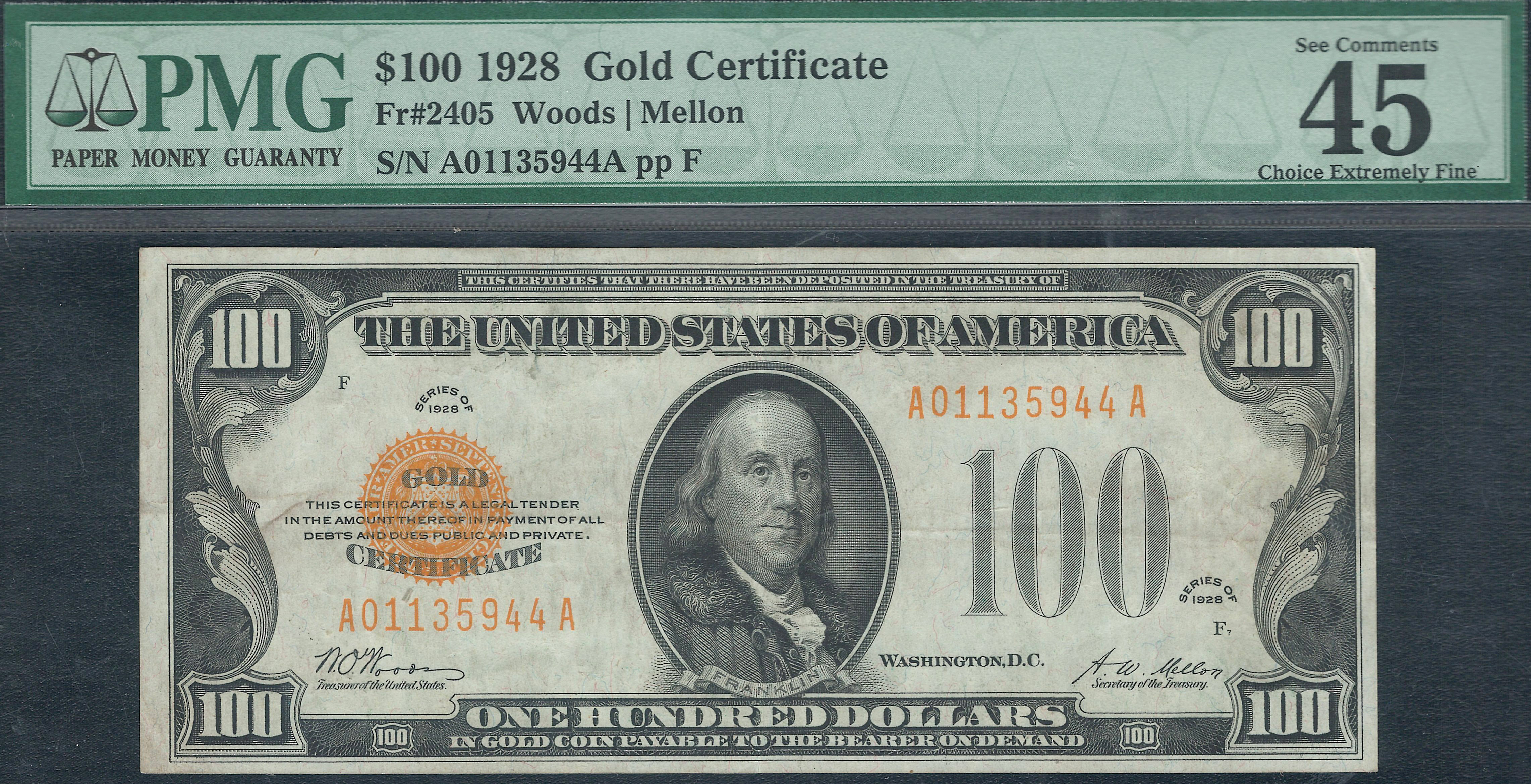 This is a very nice 1928 $100 Gold Certificate in a PMG-45EPQ holder. The serial number is A01135944A. Trying to find any denomination gold certificate with the EPQ or PPQ originality designation is getting very hard to do. As most collectors know the majority of all 1928 series gold certificates were washed and pressed many years ago when it was an acceptable practice. But to locate any of the gold certificates still in their original condition is a good find. You will notice there NO hard folds, pinholes, rips, tears, bank marks or missing pieces. The golden burnt-orange gold color seal and serial numbers still retains its vivid color. The margins are acceptable for the grade on the front and back. If your in the market for a original, never pressed or cleaned 1928 $100 Gold certificate, this is your chance to own one at a great price.