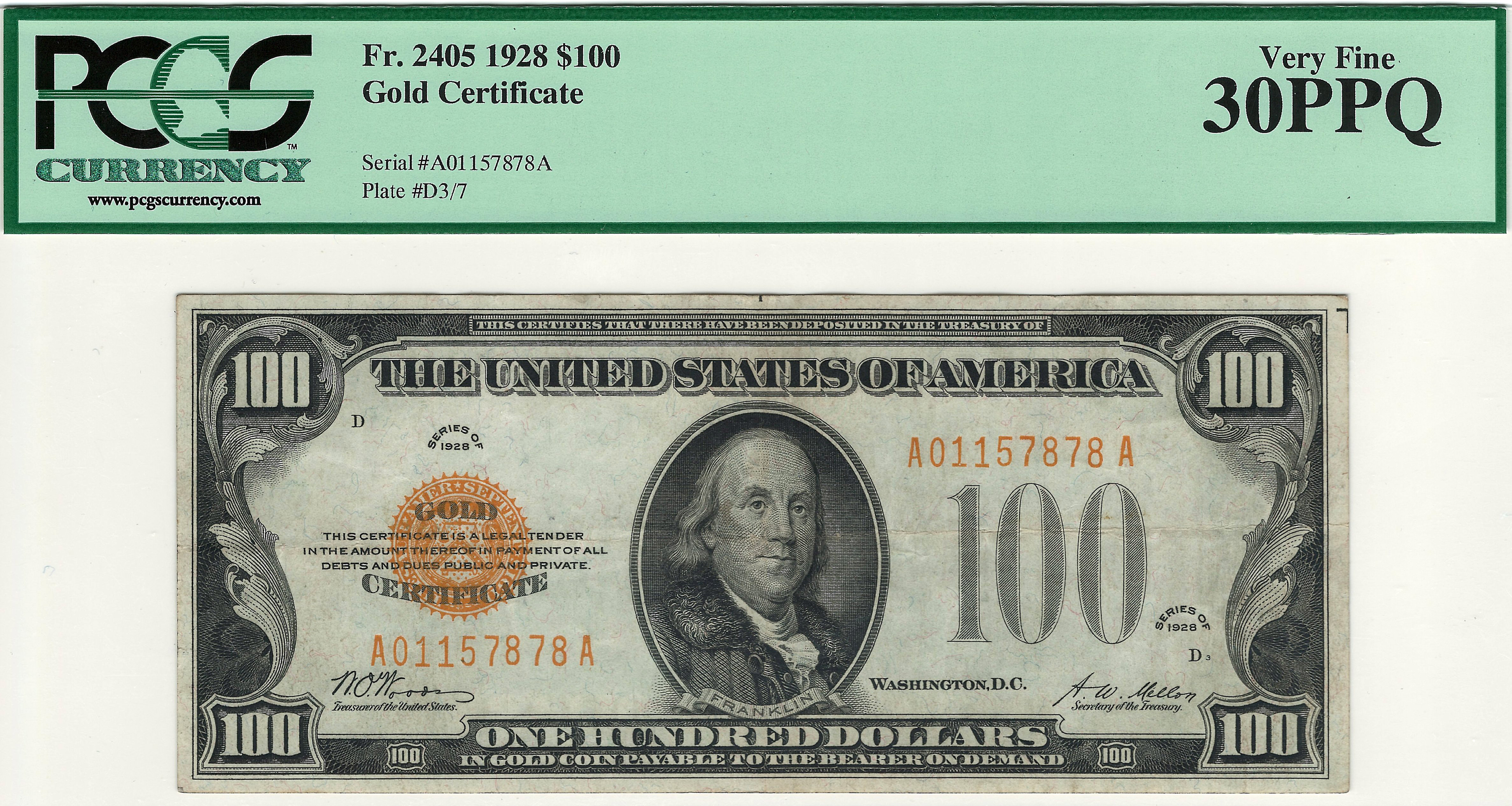 Fr.2405 This is a very nice example of the 1928 $100 Gold Certificate in a PCGS-30PPQ holder. The golden serial numbers are A01157876A. I made a promise to myself a while back that I would only purchase gold certificates that are totally original with the EPQ or PPQ designator. So many of the 1928 gold certificates have been cleaned and pressed that it is very hard to locate any of them with the PPQ or EPQ. So when I do find them I buy them at the best price I can. There is a high demand for these notes in original condition. This example is very nice with no rips, tears, pinholes and it has NOT been pressed. It has even margins on the front and back and the centering is dead on! The colors are as they should be, bright and golden. This note will make a great addition for a nice VF/XF collection