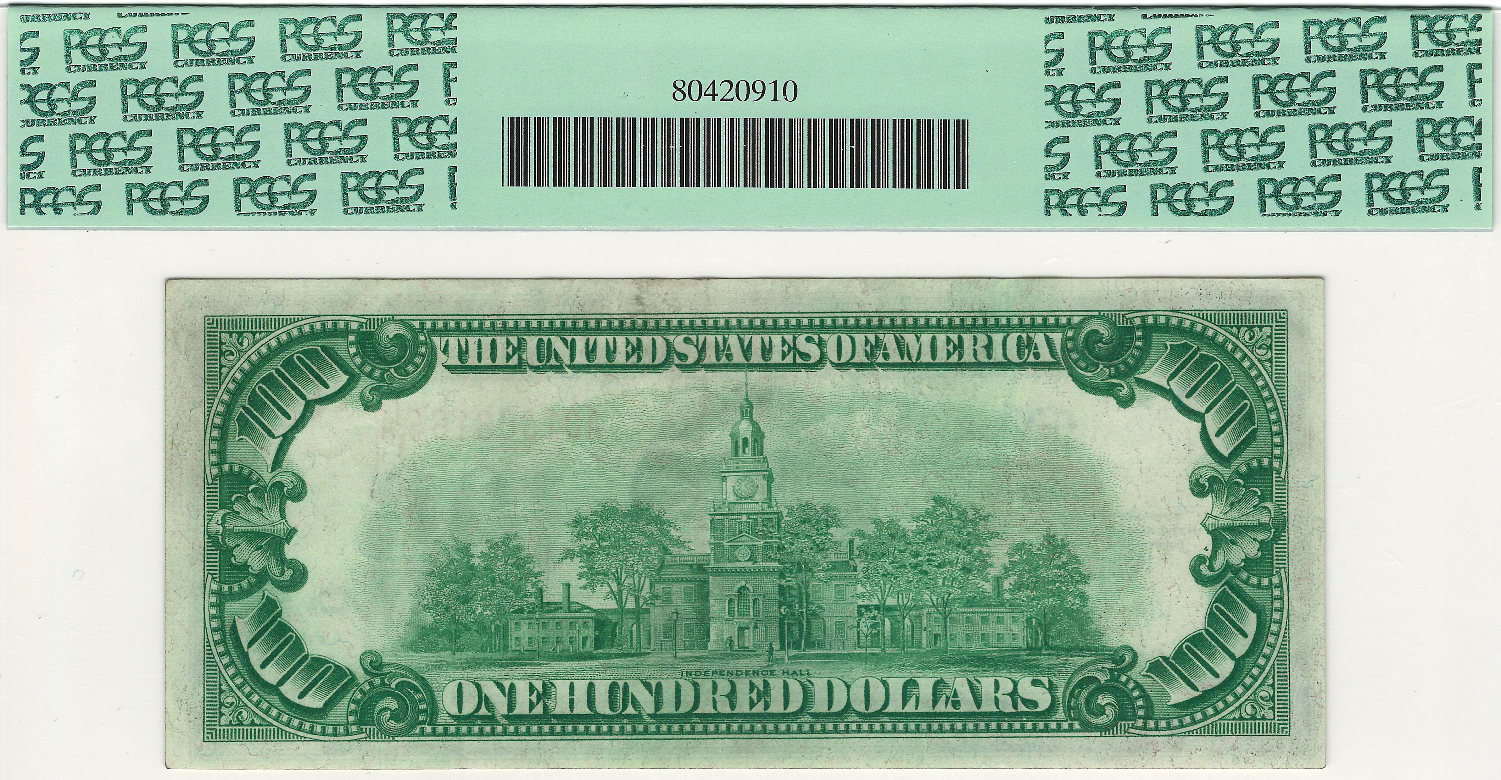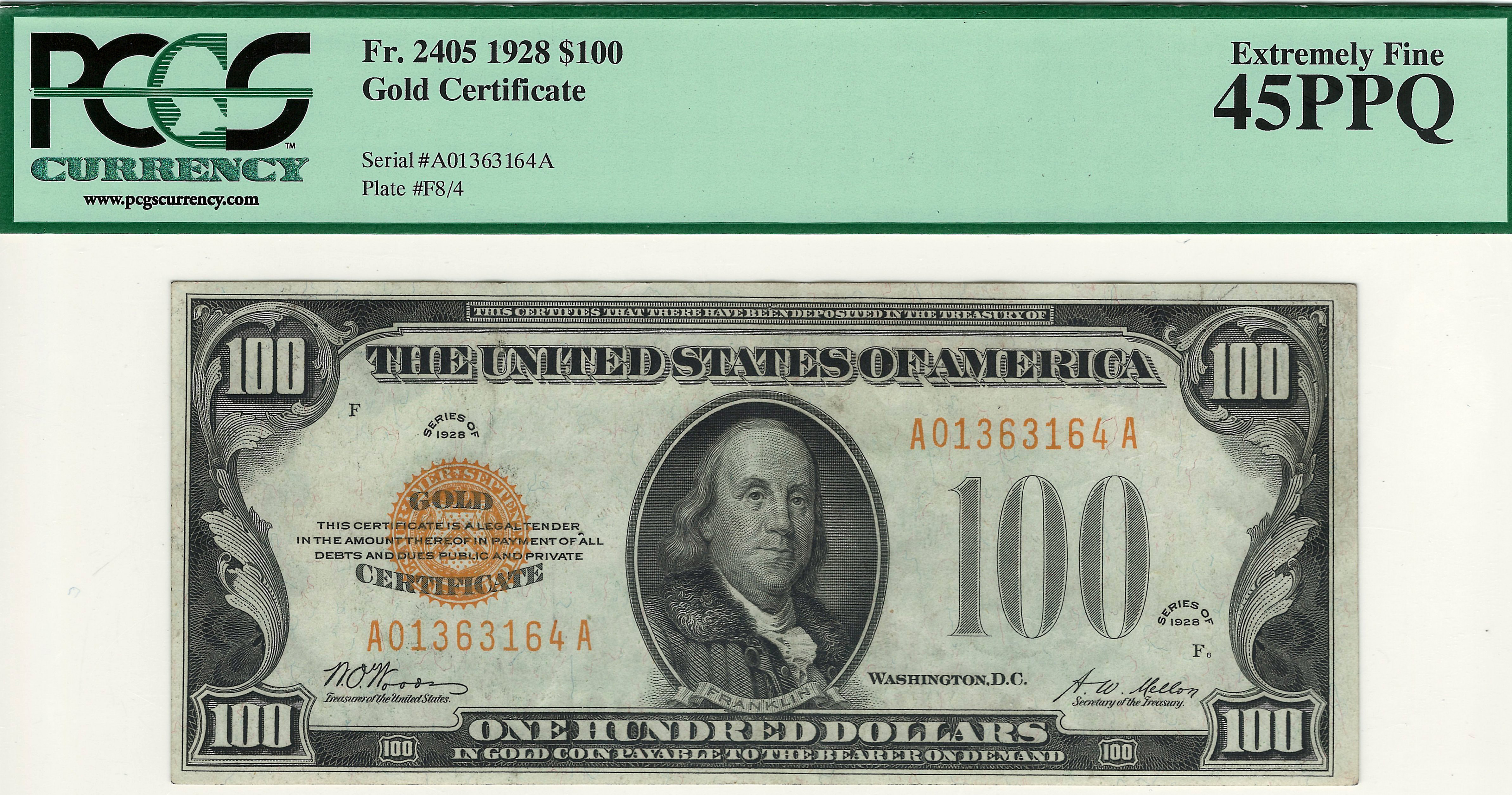 This is a very nice example of the 1928 $100 Gold Certificate in a PCGS-45PPQ holder. The golden serial numbers are A01363164A. I made a promise to myself a while back that I would only purchase gold certificates that are totally original with the EPQ or PPQ designator. So many of the 1928 gold certificates have been cleaned and pressed that it is very hard to locate any of them with the PPQ or EPQ. So when I do find them I buy them at the best price I can. There is a high demand for these notes. This example is very nice with no rips, tears, pinholes and it has NOT been pressed. It has even margins on the front and back and the centering is dead on! The colors are as they should be, bright and golden. This note will make a great addition for a nice XF/AU collection.