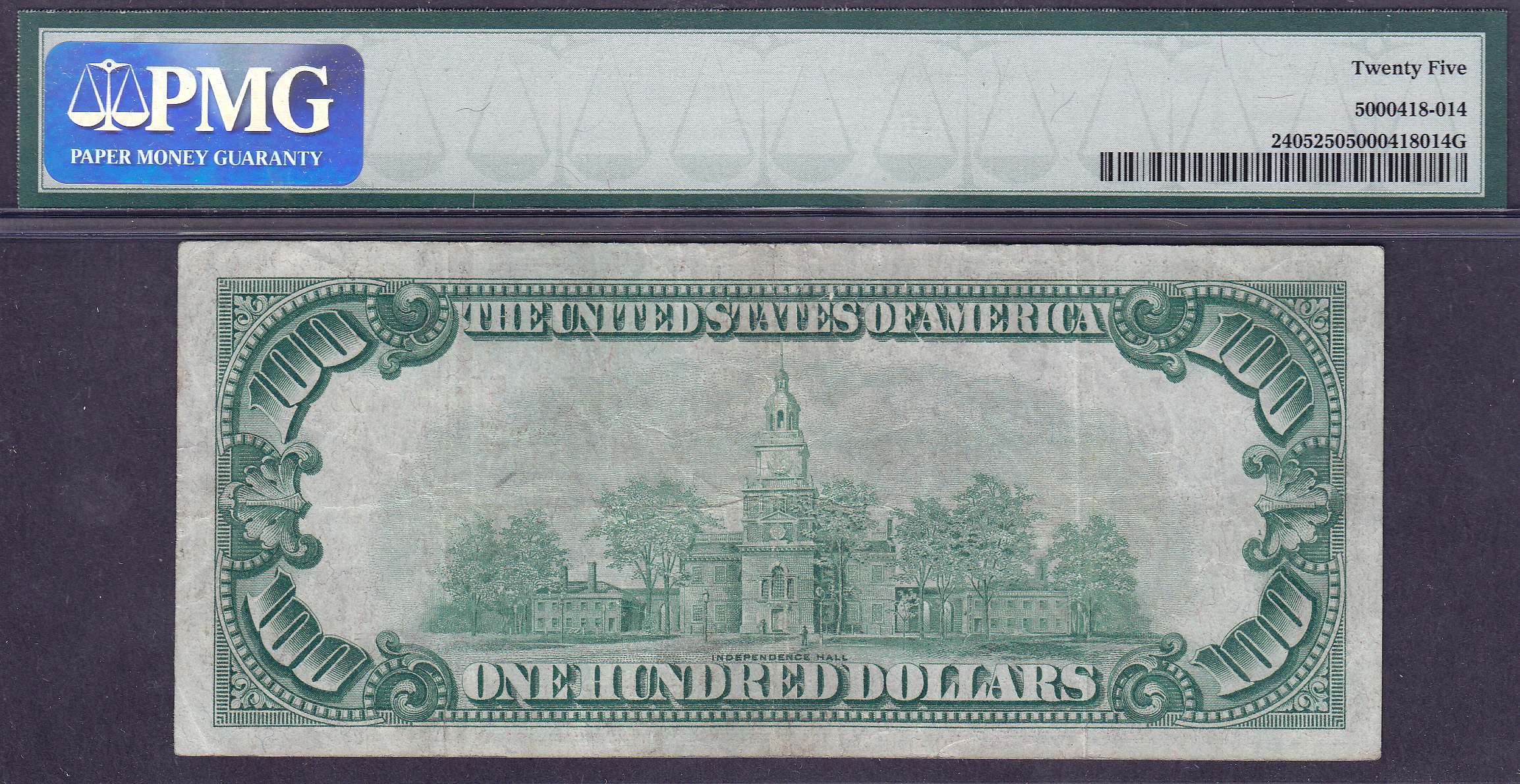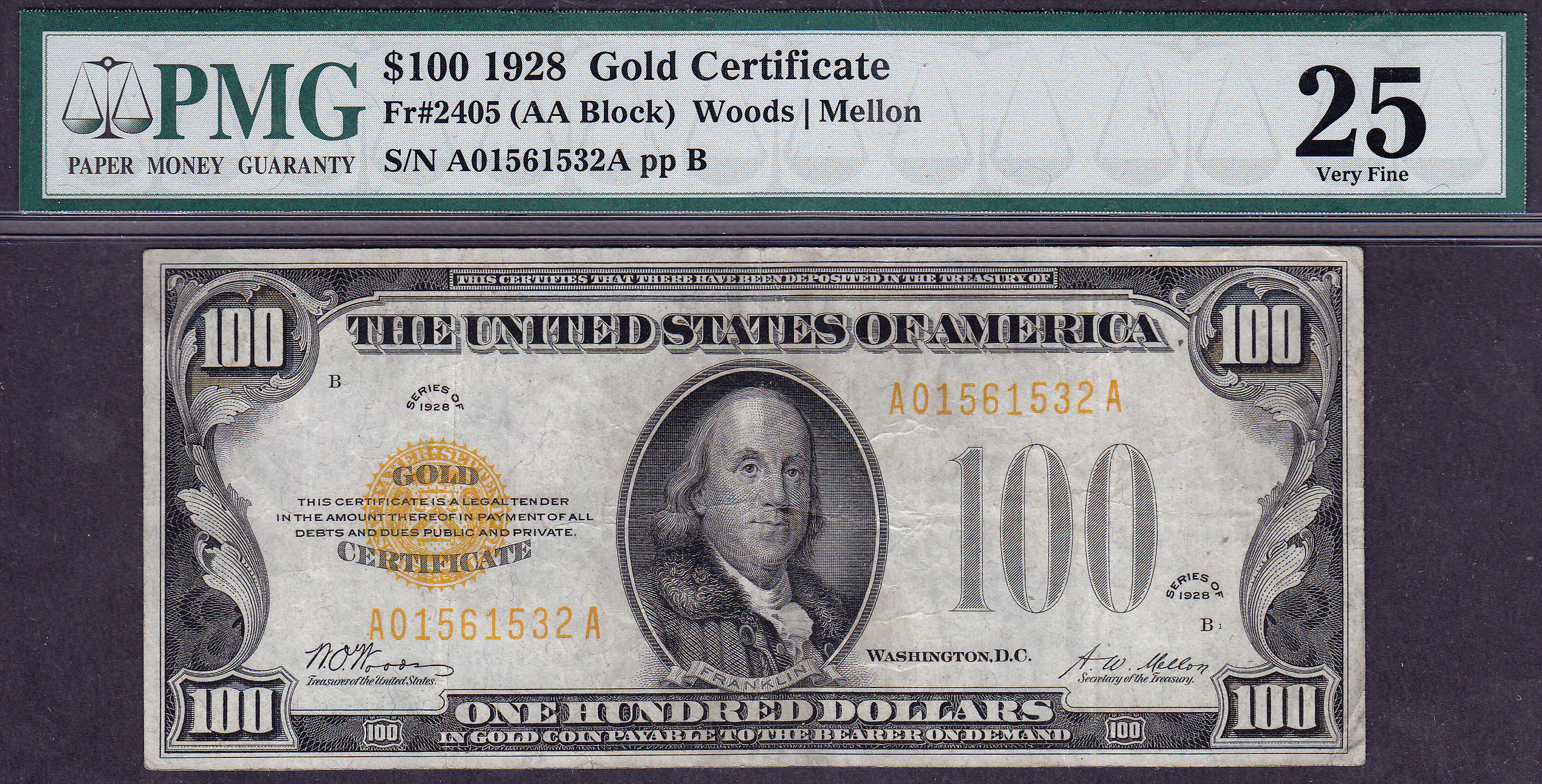 This is a real nice 100% original 1928 $100 Gold Certificate that has been graded as a PMG VF-25. The serial number is A01561532A. PMG does not give EPQ on notes below the 25 grade, except on rare occasions. This is a true EPQ note. There are no rips, tears, pinholes or bank stamps. Check out the scans. You can still see embossing and the paper wave in the note. The color has not faded as if it were cleaned or washed. This is a super 1928 $100 gold certificate for the price. This is hard to pass on for the type collector who does not want to spend a lot of money. Actually, this is a no-brainer buy!