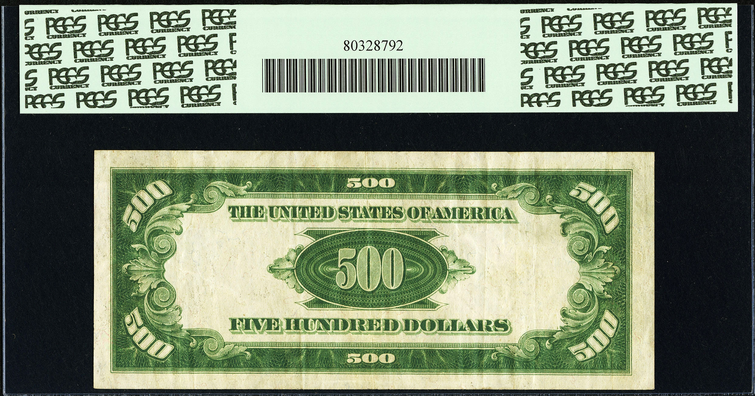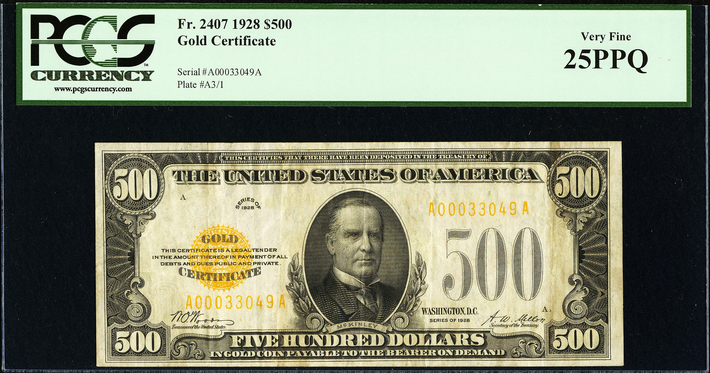 Of the 31 notes I bought at the past FUN show held in Tampa, Fl, this is probably the single best buy I had. I have owned many 1928 $500 Gold Certificates but this is the first one I have had that is in a PPQ or EPQ condition at this grade. I just recently had 6 1928 $500 Gold Certificates, all in VF-20 to VF-35 but none of them were in original condition. This beauty is one of my last ones left. The others had been press or cleaned as 80% of them known have. It was an acceptiable pratice back in the 1920-1960 era to clean and press notes for fussy collectors. Anyway this is a really nice un-doctored note with nice vibrant color and no problems such as pinholes, bank marks, rips, tears or hard folds. The serial number is A00033049A and it is in a PCGS VF-25PPQ holder. If you are looking for a nice type problem free 1928 $500 Gold Certificate that does not cost $25,000 to $30,000 then you won't be able to pass on this one. It has been graded as a PCGS VF-25PPQ. Jump on this one quick, before someone realizes that this note is here on the website.