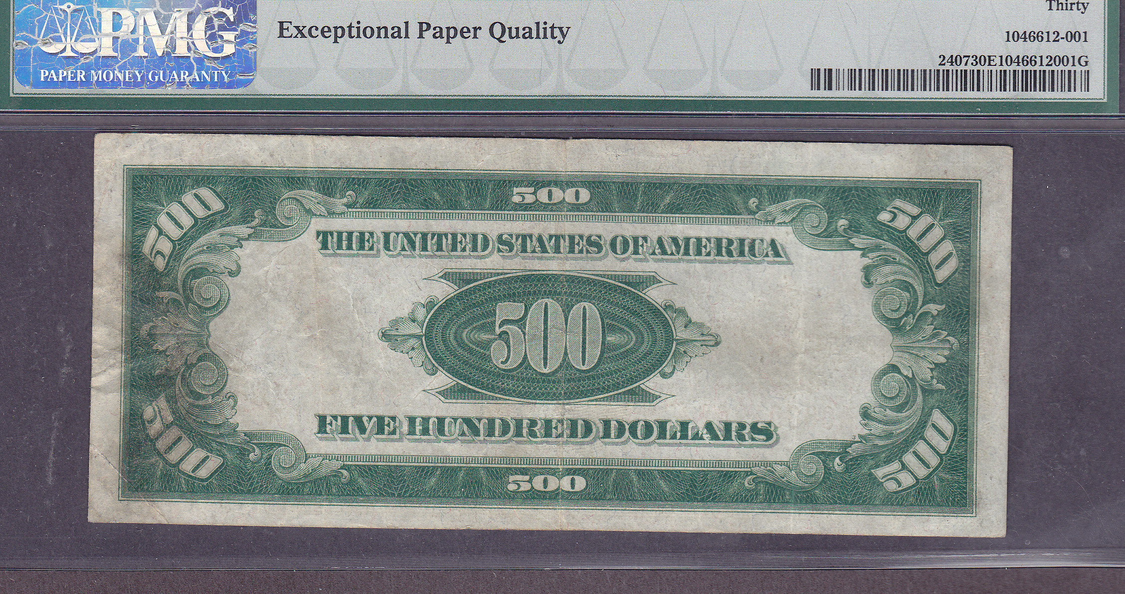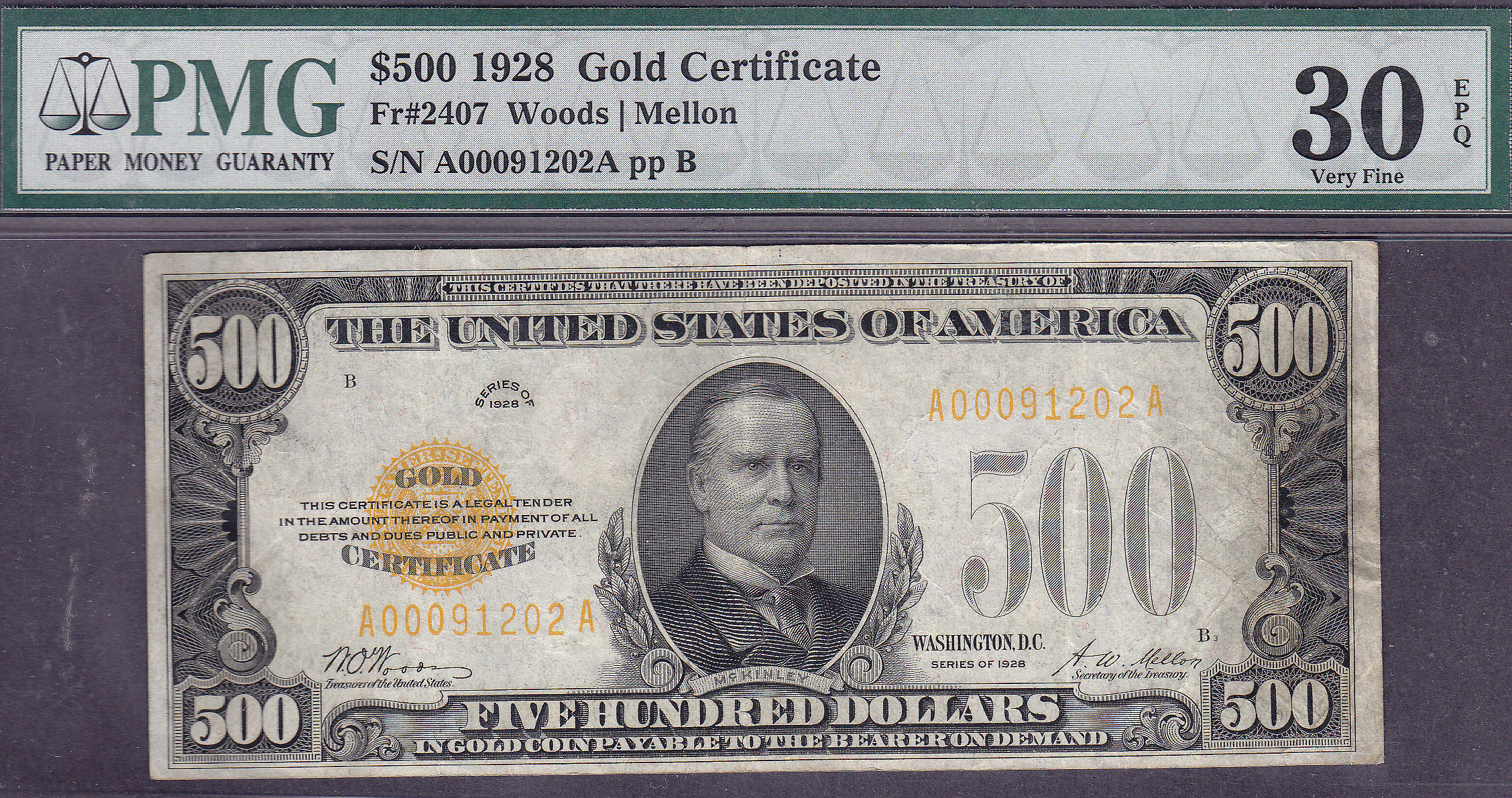 This is one of the few 1928 $500 Gold Certificates that you will see that has never been cleaned or pressed. As you know it was a common practice back in the 1920 to 1960 era to clean and press currency notes to appease fussy collectors. Nowadays we know that it is worth more if they remain in their original condition. There are no rips, tears, pinholes or any issues associated with this cool note. The serial number is A00091202A and is in a PMG-30EPQ holder. This note will be gone before the week is out.